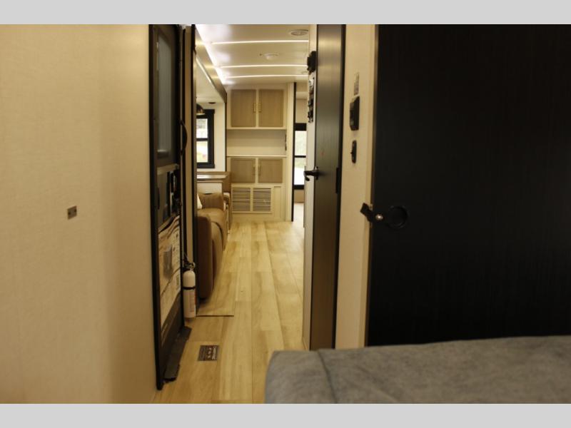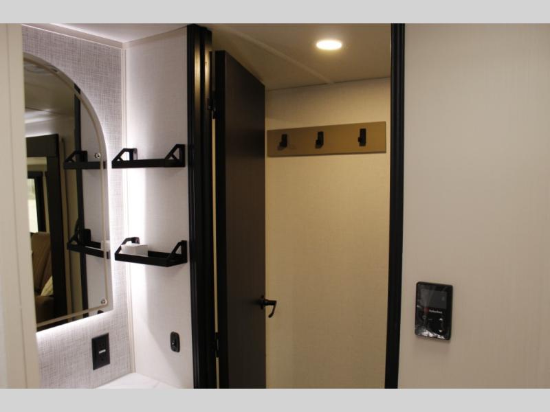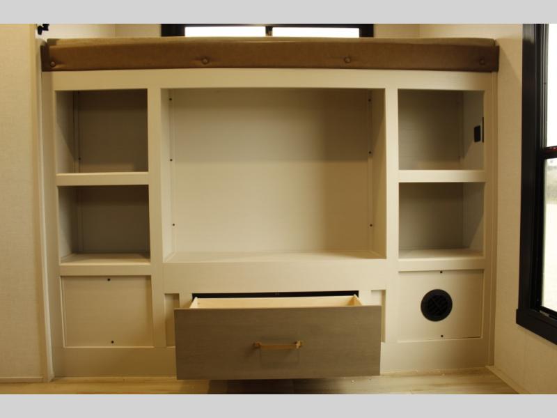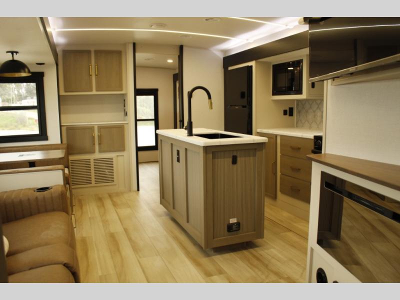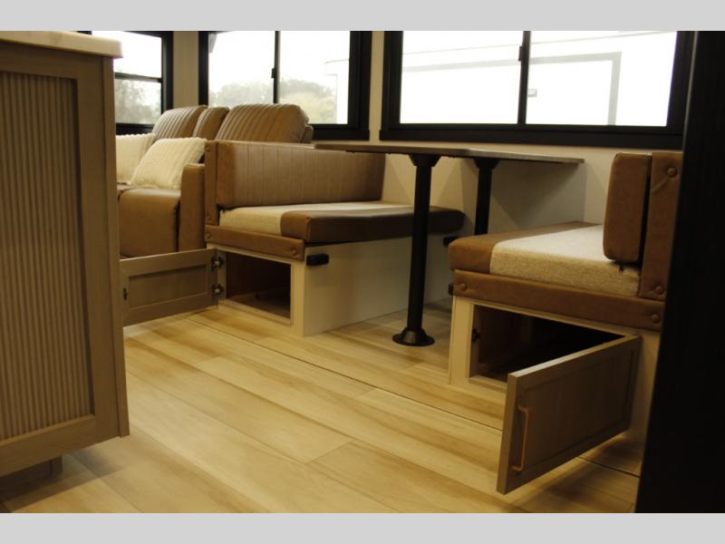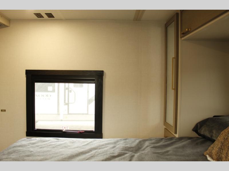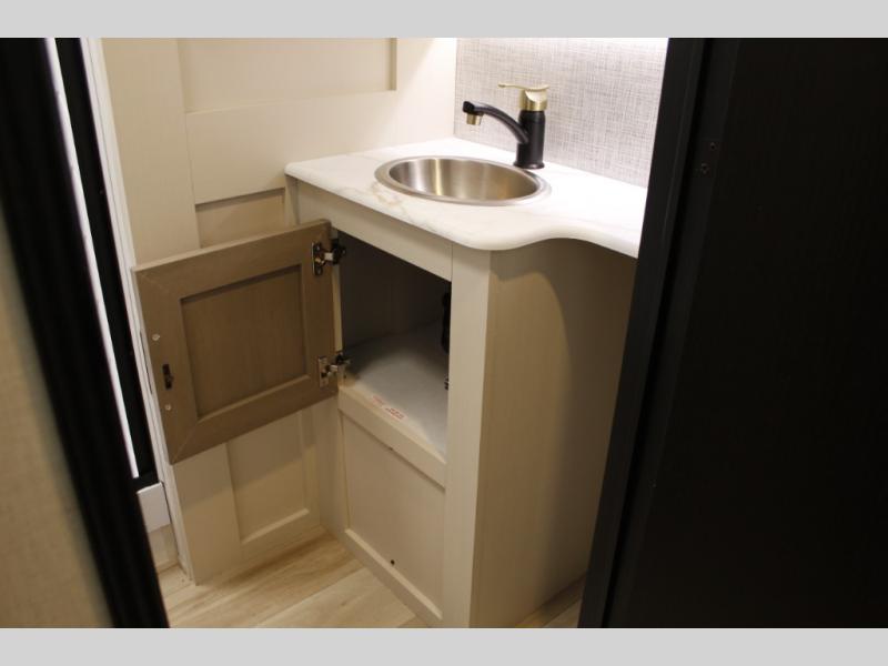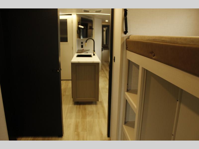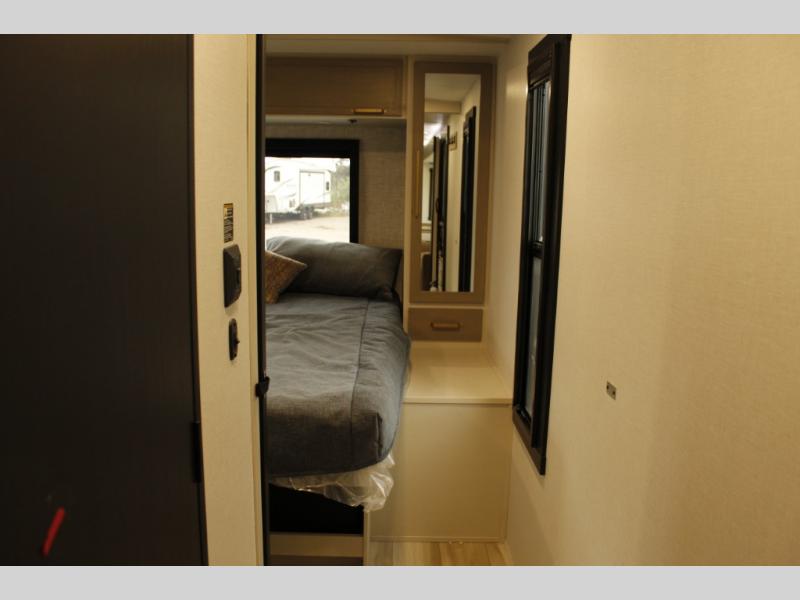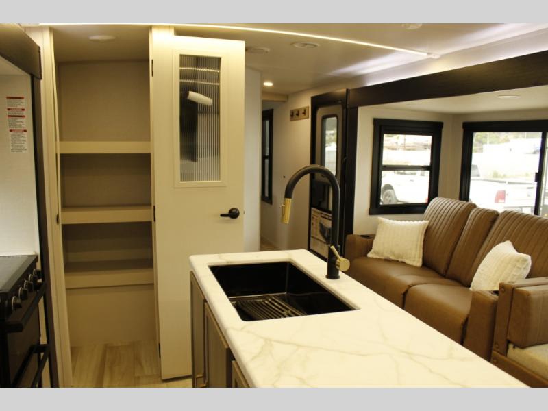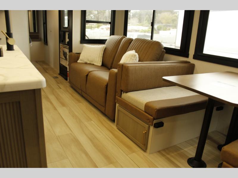 Your kids or friends are ready for a trip in this Wildwood Heritage Glen travel trailer, but are you? As the kiddos or your buddies claim the private bunkhouse for themselves, which includes two bunk beds and a convertible sofa bed, you can escape to your own privacy in the front bedroom with a queen bed with Versa Tilt and lots of storage. There is even washer/dryer prep for added convenience. The main living area and kitchen might be the next indoor hangout spot thanks to the chef-size walk-in pantry and 12V refrigerator. The cook even has a choice of making meals on the outside kitchen/bar which also includes an LP quick connect nearby. On rainy days, the theatre seats and booth dinette will offer a place to watch TV and play games, and the panoramic windows will always offer beautiful scenery no matter the weather conditions.