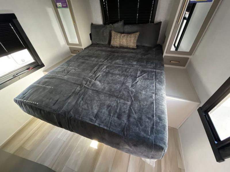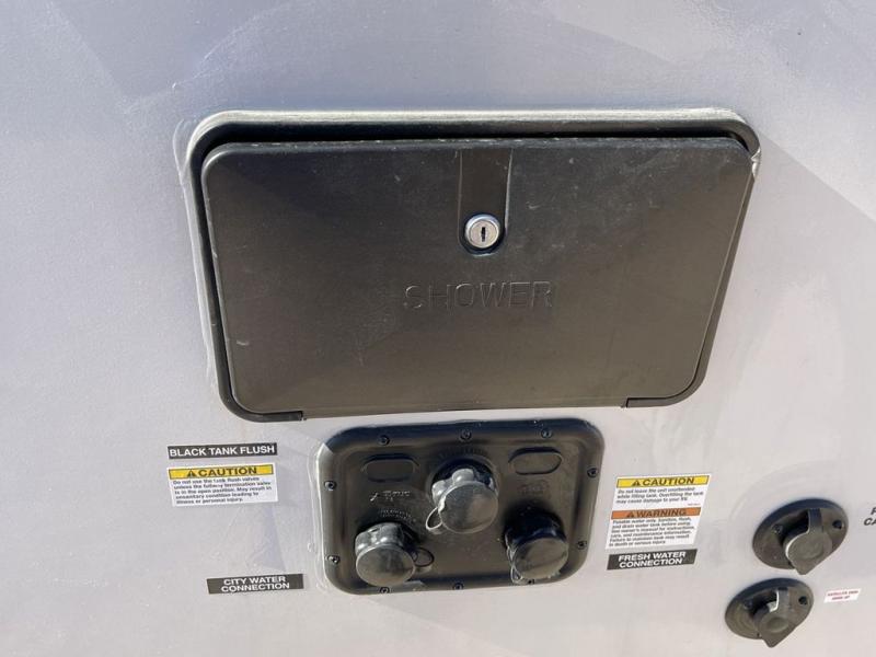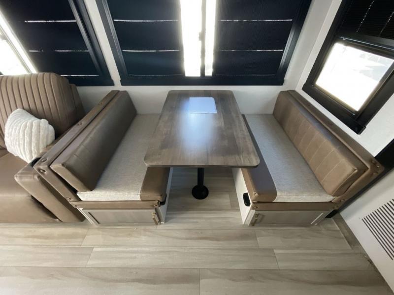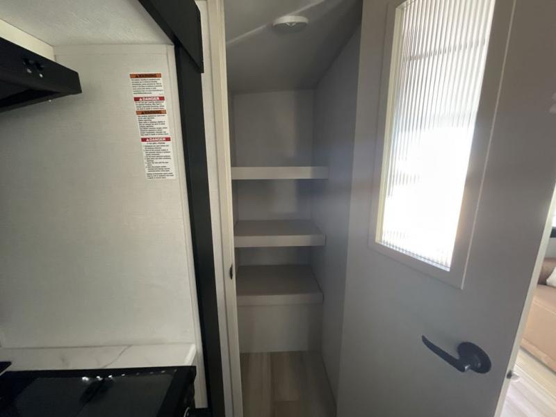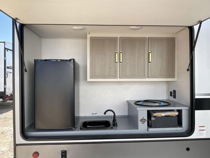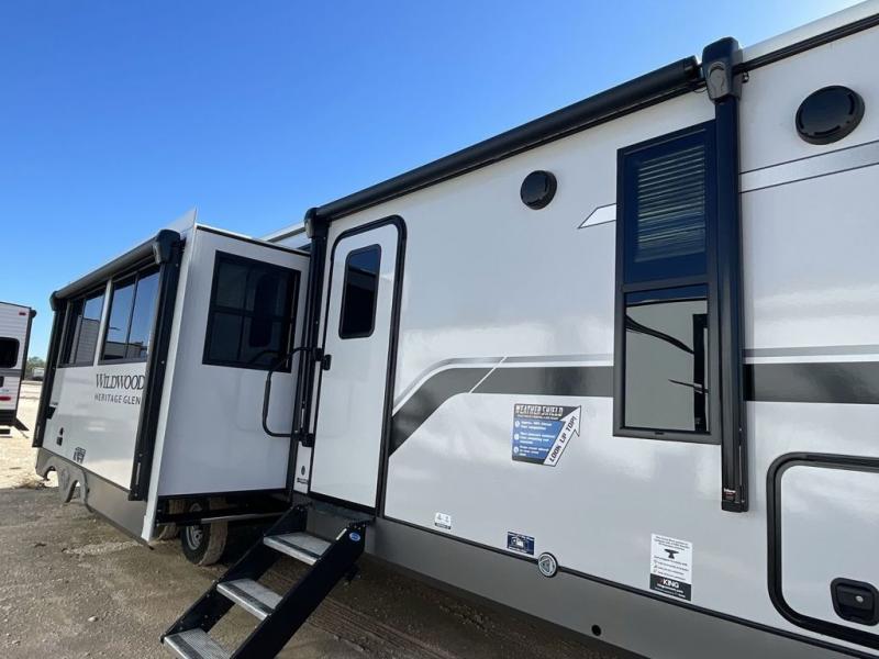 Your kids or friends are ready for a trip in this Wildwood Heritage Glen travel trailer, but are you? As the kiddos or your buddies claim the private bunkhouse for themselves, which includes two bunk beds and a convertible sofa bed, you can escape to your own privacy in the front bedroom with a queen bed with Versa Tilt and lots of storage. There is even washer/dryer prep for added convenience. The main living area and kitchen might be the next indoor hangout spot thanks to the chef-size walk-in pantry and 12V refrigerator. The cook even has a choice of making meals on the outside kitchen/bar which also includes an LP quick connect nearby. On rainy days, the theatre seats and booth dinette will offer a place to watch TV and play games, and the panoramic windows will always offer beautiful scenery no matter the weather conditions.