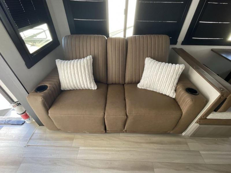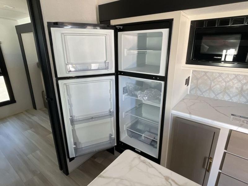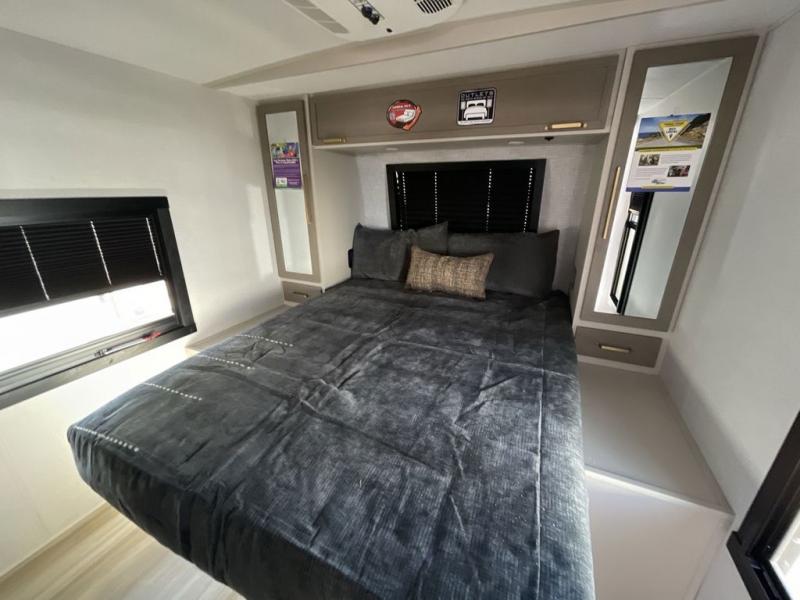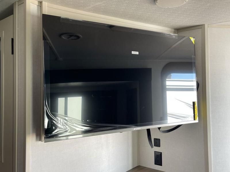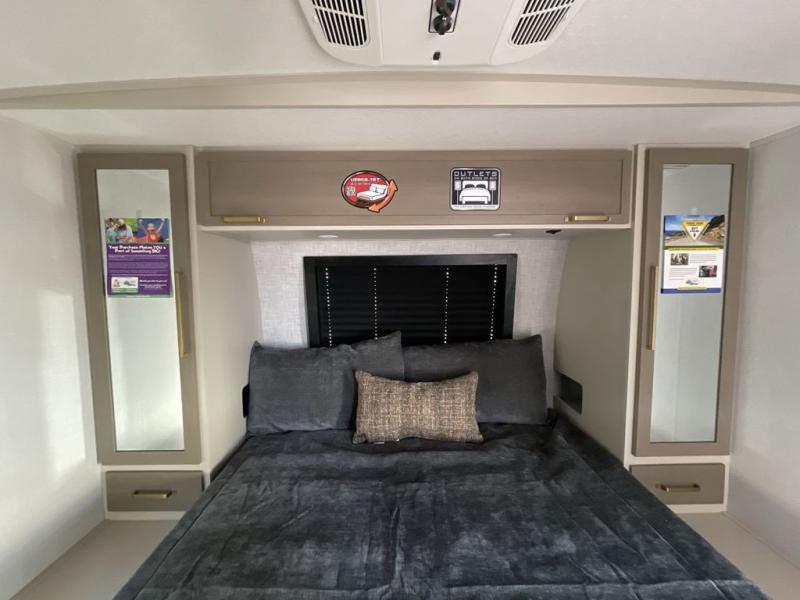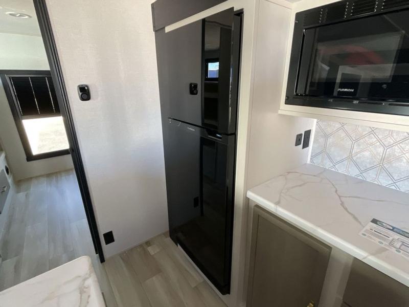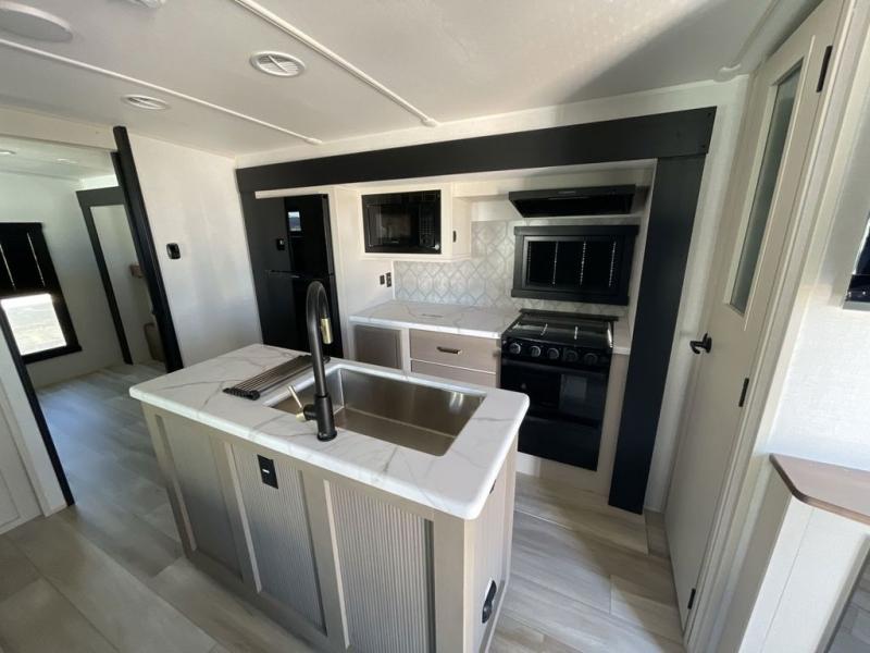 Your kids or friends are ready for a trip in this Wildwood Heritage Glen travel trailer, but are you? As the kiddos or your buddies claim the private bunkhouse for themselves, which includes two bunk beds and a convertible sofa bed, you can escape to your own privacy in the front bedroom with a queen bed with Versa Tilt and lots of storage. There is even washer/dryer prep for added convenience. The main living area and kitchen might be the next indoor hangout spot thanks to the chef-size walk-in pantry and 12V refrigerator. The cook even has a choice of making meals on the outside kitchen/bar which also includes an LP quick connect nearby. On rainy days, the theatre seats and booth dinette will offer a place to watch TV and play games, and the panoramic windows will always offer beautiful scenery no matter the weather conditions.