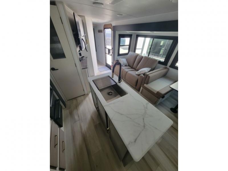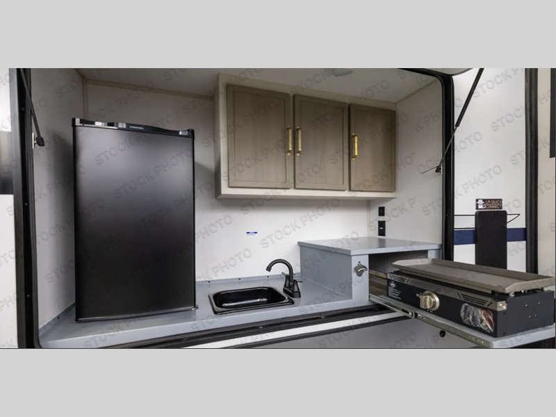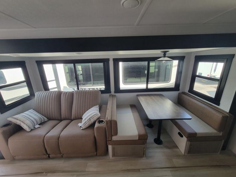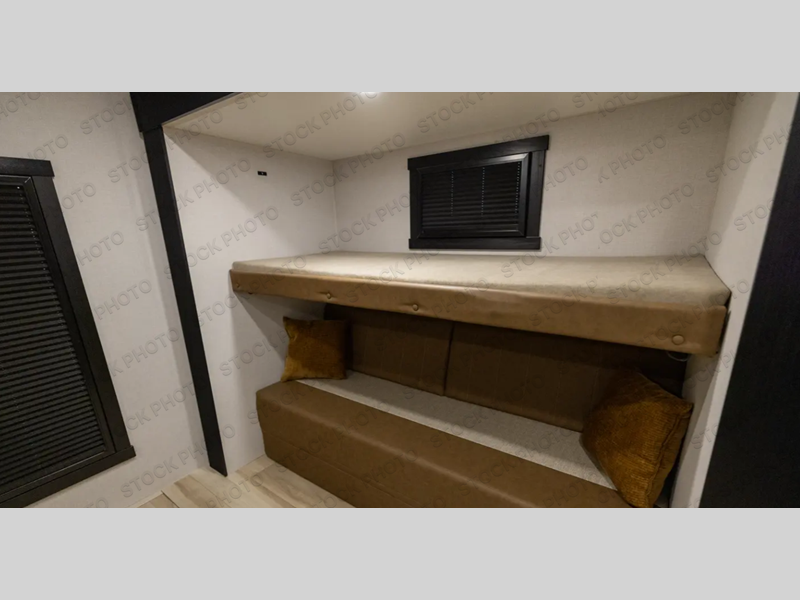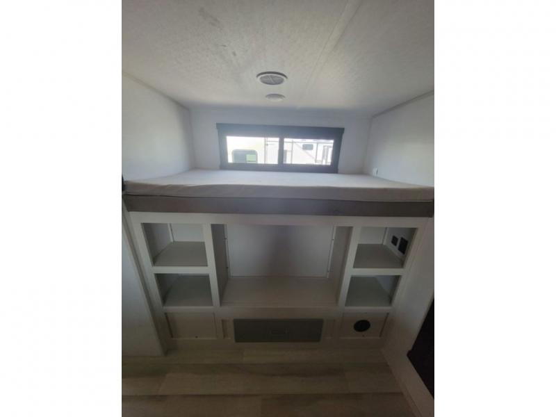 Your kids or friends are ready for a trip in this Wildwood Heritage Glen travel trailer, but are you? As the kiddos or your buddies claim the private bunkhouse for themselves, which includes two bunk beds and a convertible sofa bed, you can escape to your own privacy in the front bedroom with a queen bed with Versa Tilt and lots of storage. There is even washer/dryer prep for added convenience. The main living area and kitchen might be the next indoor hangout spot thanks to the chef-size walk-in pantry and 12V refrigerator. The cook even has a choice of making meals on the outside kitchen/bar which also includes an LP quick connect nearby. On rainy days, the theatre seats and booth dinette will offer a place to watch TV and play games, and the panoramic windows will always offer beautiful scenery no matter the weather conditions.