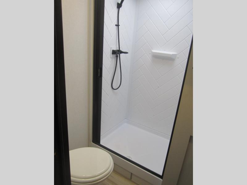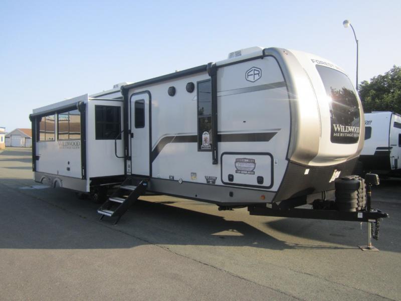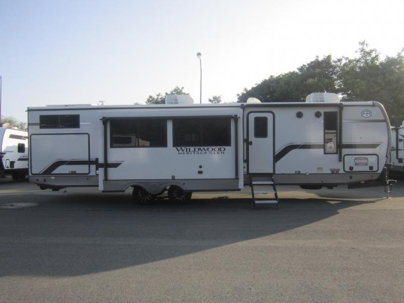With any Wildwood Heritage Glen travel trailer by Forest River, the quality construction, attention to detail and design along with a bright and welcoming interior allows you to relax in comfort with conveniences while exploring outdoors. Each model includes a WeatherShield one piece fiberglass roof, Maxxis radial tires, and an enclosed underbelly with 12V tank heaters on all holding tanks for added protection. You will appreciate the on-demand tankless water heater, along with the 15K BTU Quite Cool A/C and 50 Amp service with a brace for a second A/C. There is an outside shower with hot and cold water, solar prep, a power tongue jack, plus many more exterior conveniences. Head inside to enjoy matte gold hardware, wood door casings in place of plastic door casings, and full length barreled ceilings for additional head room.