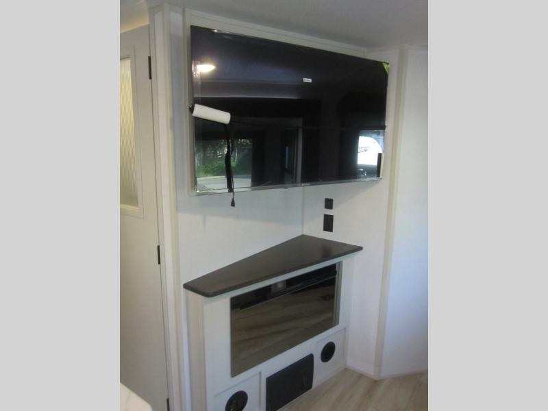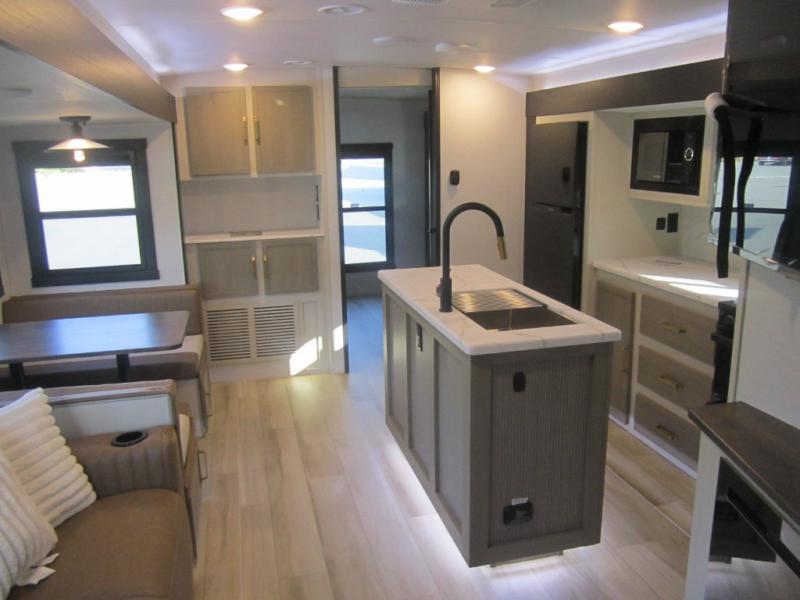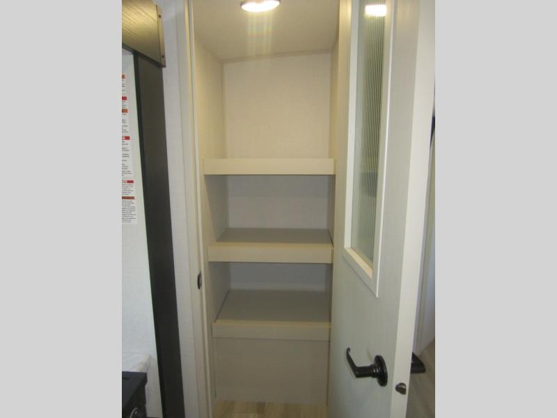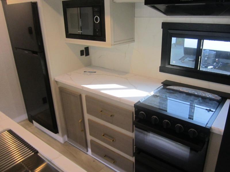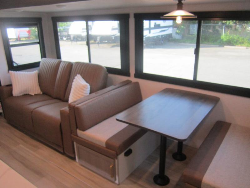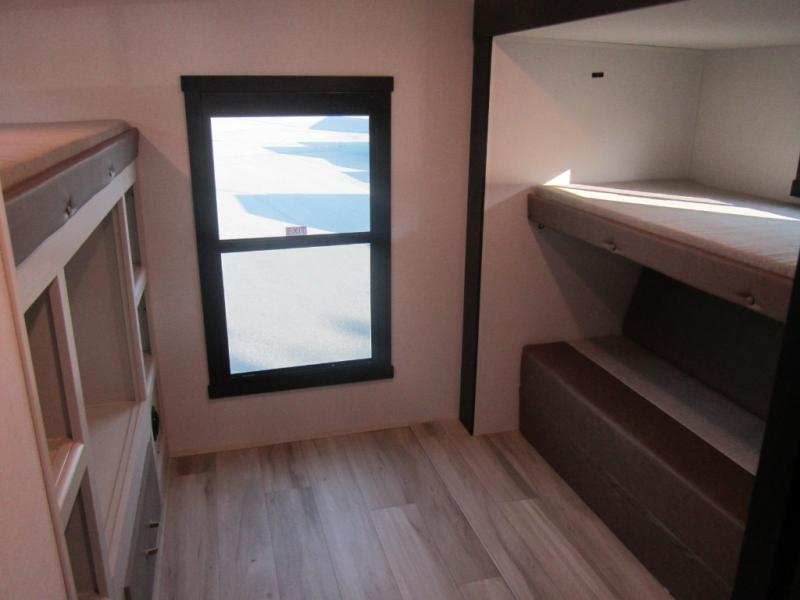 Your kids or friends are ready for a trip in this Wildwood Heritage Glen travel trailer, but are you? As the kiddos or your buddies claim the private bunkhouse for themselves, which includes two bunk beds and a convertible sofa bed, you can escape to your own privacy in the front bedroom with a queen bed with Versa Tilt and lots of storage. There is even washer/dryer prep for added convenience. The main living area and kitchen might be the next indoor hangout spot thanks to the chef-size walk-in pantry and 12V refrigerator. The cook even has a choice of making meals on the outside kitchen/bar which also includes an LP quick connect nearby. On rainy days, the theatre seats and booth dinette will offer a place to watch TV and play games, and the panoramic windows will always offer beautiful scenery no matter the weather conditions.