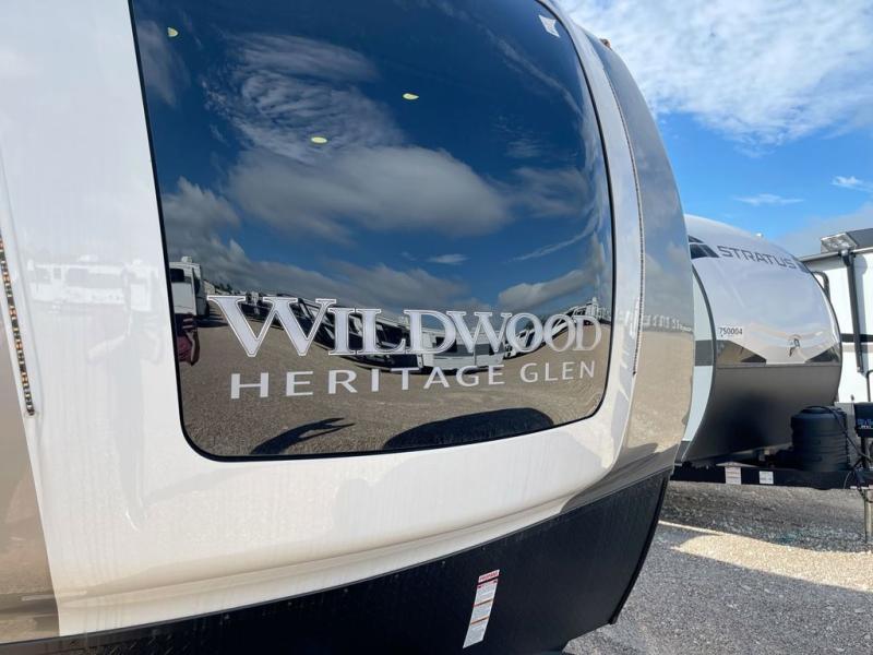 With any Wildwood Heritage Glen travel trailer by Forest River, the quality construction, attention to detail and design along with a bright and welcoming interior allows you to relax in comfort with conveniences while exploring outdoors. Each model includes a WeatherShield one piece fiberglass roof, Maxxis radial tires, and an enclosed underbelly with 12V tank heaters on all holding tanks for added protection. You will appreciate the on-demand tankless water heater, along with the 15K BTU Quite Cool A/C and 50 Amp service with a brace for a second A/C. There is an outside shower with hot and cold water, solar prep, a power tongue jack, plus many more exterior conveniences. Head inside to enjoy matte gold hardware, wood door casings in place of plastic door casings, and full length barreled ceilings for additional head room.