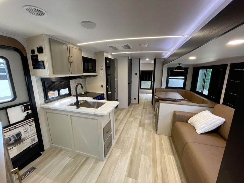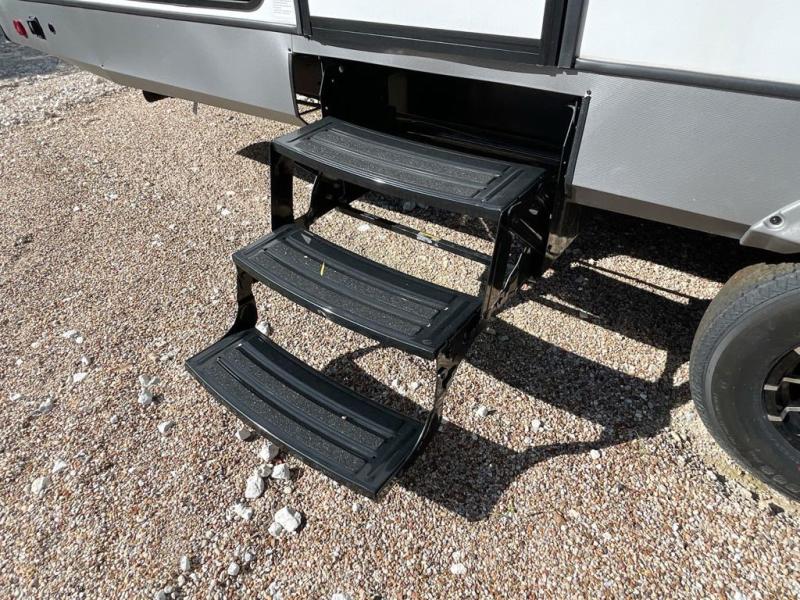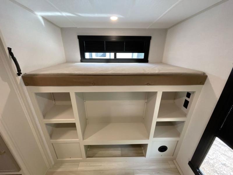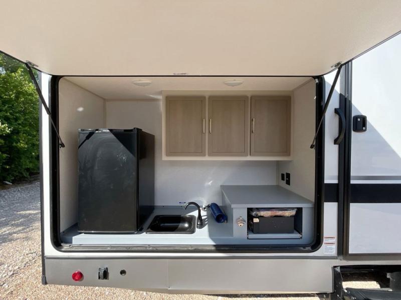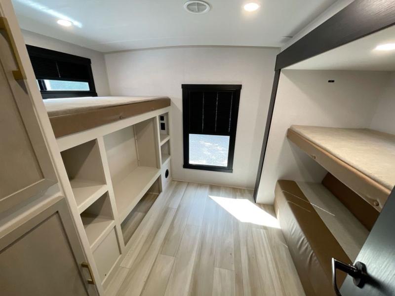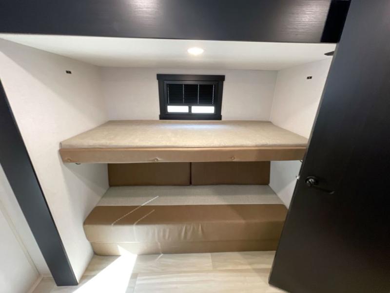 Get ready for some fun in this trailer that sleeps nine to ten happy campers! Everyone will be comfortable having access to a full bathroom near the front master bedroom and a half bath near the rear private bunkhouse, plus there are two entry doors into the trailer. The kids or your friends will get to choose from two 38" x 74" bunk beds and a convertible sofa bed, and the slide out in the bunkhouse offers more floor space to play games and such. The cook will have the choice of making meals on the outside kitchen/bar or inside with full amenities including a 12V refrigerator. Inside the main living area, everyone can watch TV, play games at the family size U-shaped dinette, and enjoy the views out of the panoramic windows. And don't overlook the front private bedroom with a queen bed with Versa Tilt, dual wardrobes, a shelf, plus USB/CPAP hookups!