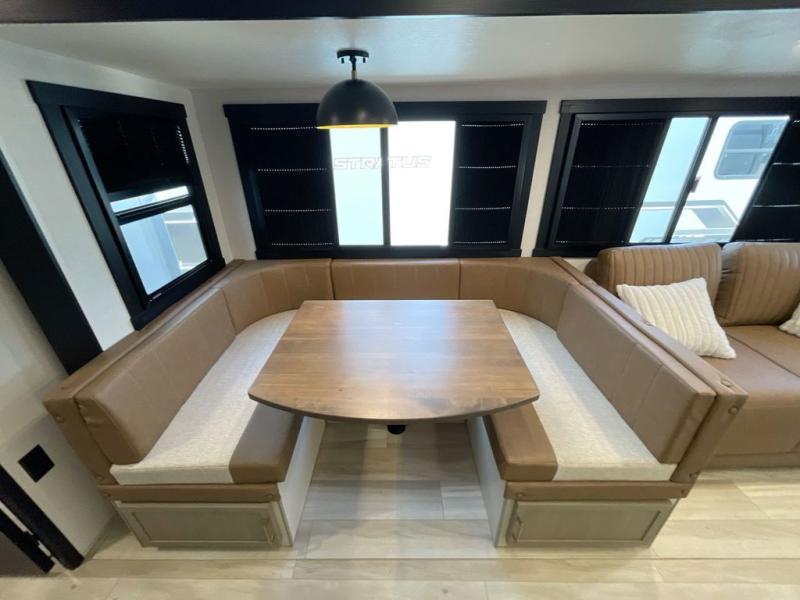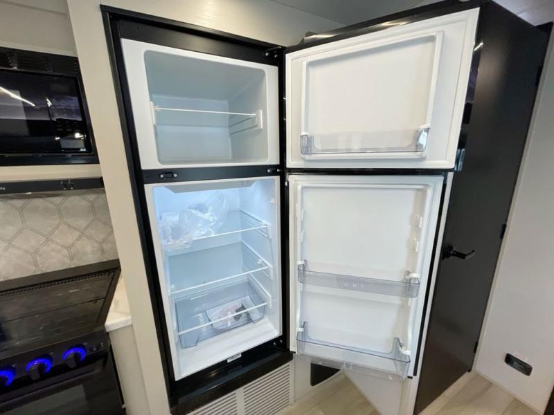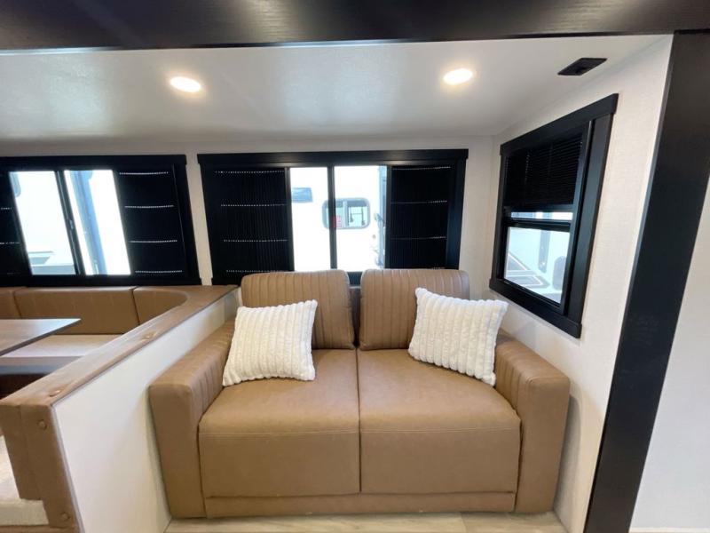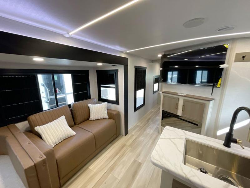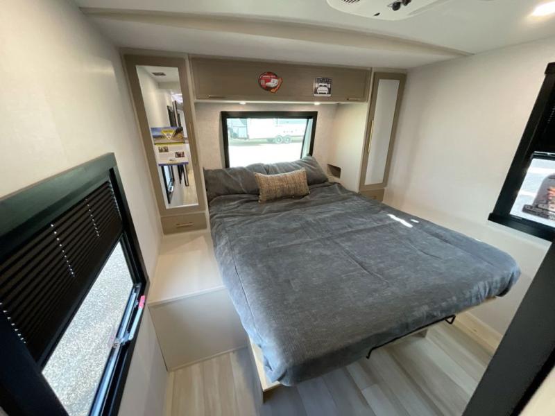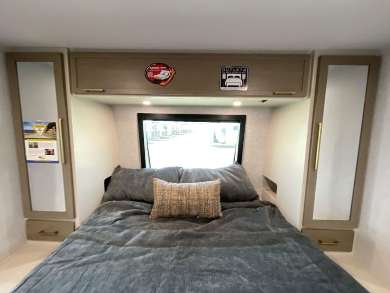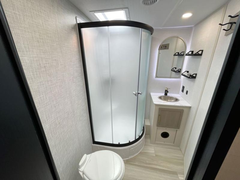 Get ready for some fun in this trailer that sleeps nine to ten happy campers! Everyone will be comfortable having access to a full bathroom near the front master bedroom and a half bath near the rear private bunkhouse, plus there are two entry doors into the trailer. The kids or your friends will get to choose from two 38" x 74" bunk beds and a convertible sofa bed, and the slide out in the bunkhouse offers more floor space to play games and such. The cook will have the choice of making meals on the outside kitchen/bar or inside with full amenities including a 12V refrigerator. Inside the main living area, everyone can watch TV, play games at the family size U-shaped dinette, and enjoy the views out of the panoramic windows. And don't overlook the front private bedroom with a queen bed with Versa Tilt, dual wardrobes, a shelf, plus USB/CPAP hookups!
