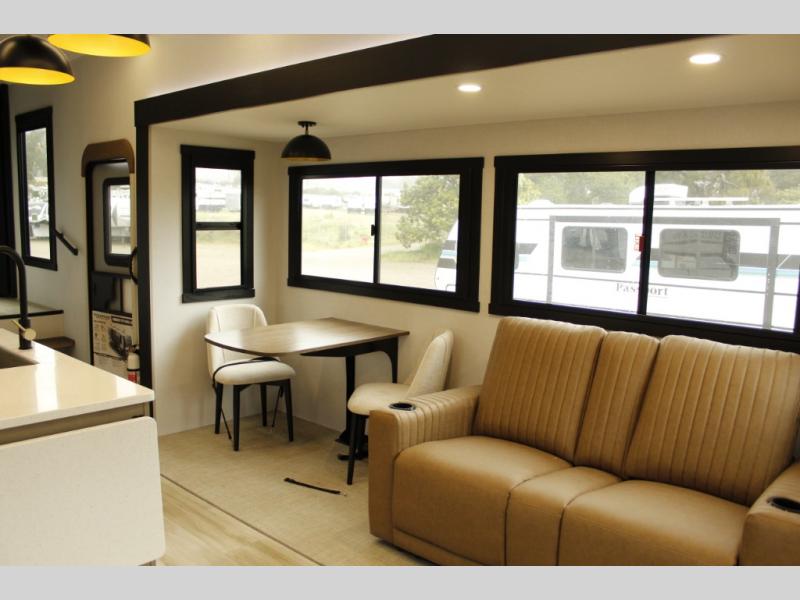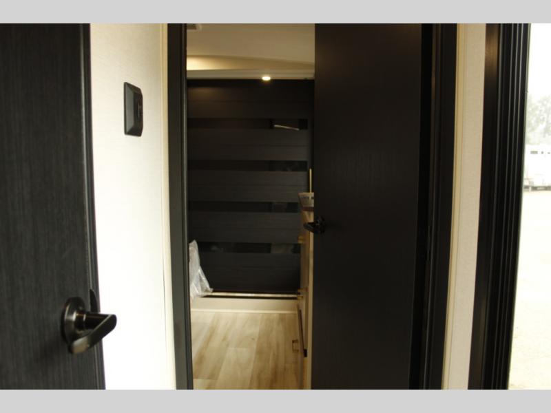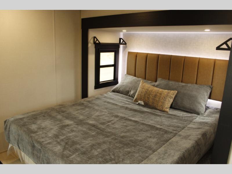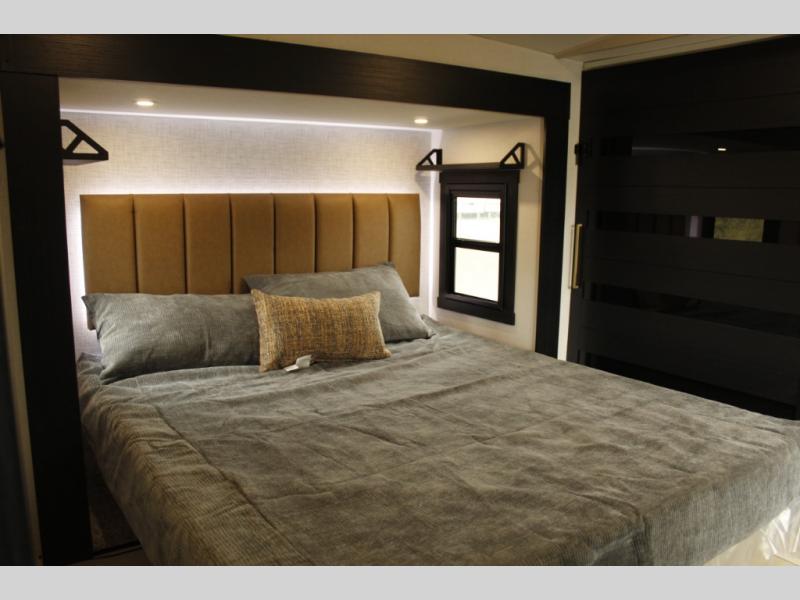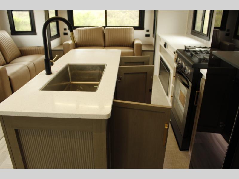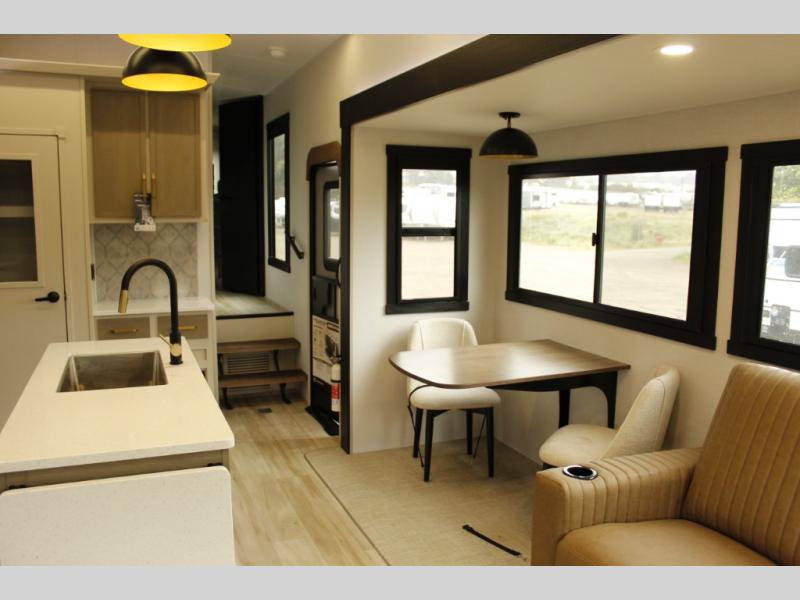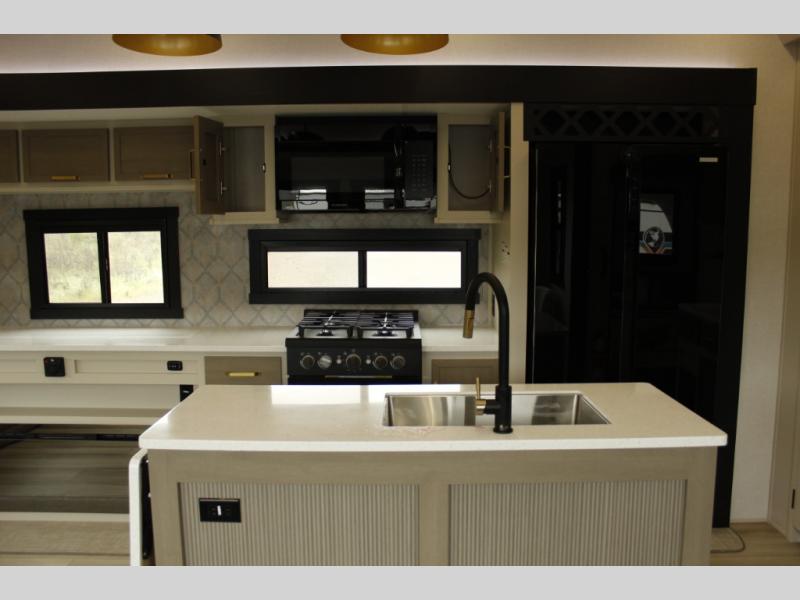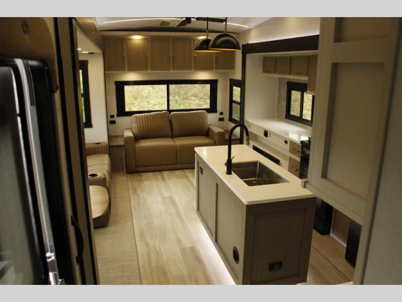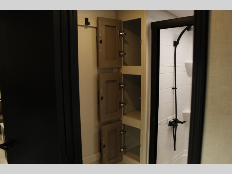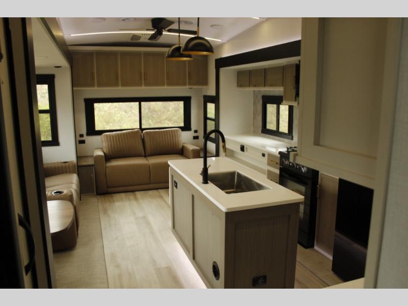 You will love the amount of space you have in this triple slide out fifth wheel, with dual opposing slides in the rear living area/kitchen. Your crew can get cozy on the theater seating across from the pop-up TV and fireplace, play a game at the table and chairs, and sleep on the tri-fold sofa. The chef of your group will love the large kitchen island with an additional countertop extension, plus there is a pantry and 16 cu. ft. 12V refrigerator for food storage. The full bath includes a residential-style walk-in shower with a skylight, a linen closet, and a medicine cabinet to keep everything tidy. And you will sleep like a baby in the front private bedroom with a custom king bed, a dresser with a bench, and washer/dryer prep in the walk-in closet!