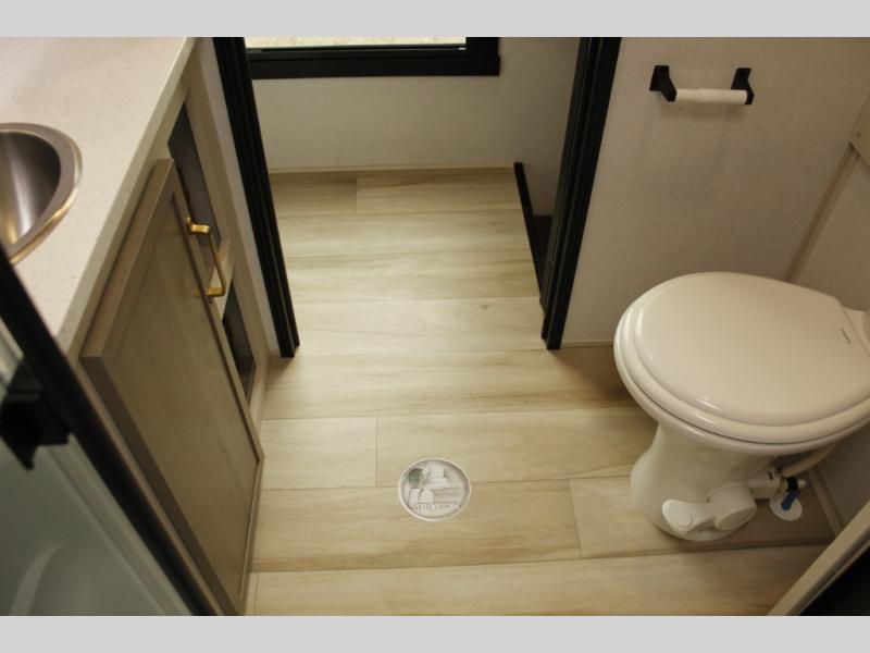 With any Wildwood Heritage Glen fifth wheel by Forest River, the quality construction, attention to detail and design along with a bright and welcoming interior allows you to relax in comfort with conveniences while exploring outdoors. The Summer Wind colored horizontal plank linoleum flooring is unique, beautiful and durable, and there are gold-accented faucets with stainless steel sinks in the bathrooms for added luxury. The Accessibelly underbelly with 12V tank heaters will help protect your unit from the elements, and the power stabilizer jacks and landing gear will make set-up a breeze. More features that provide convenience include the high-end solid surface countertops, an RV Airflow System that provides at least 25% better airflow, and solar prep for off-grid capabilities.