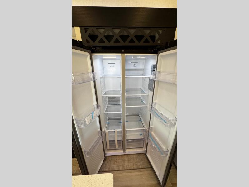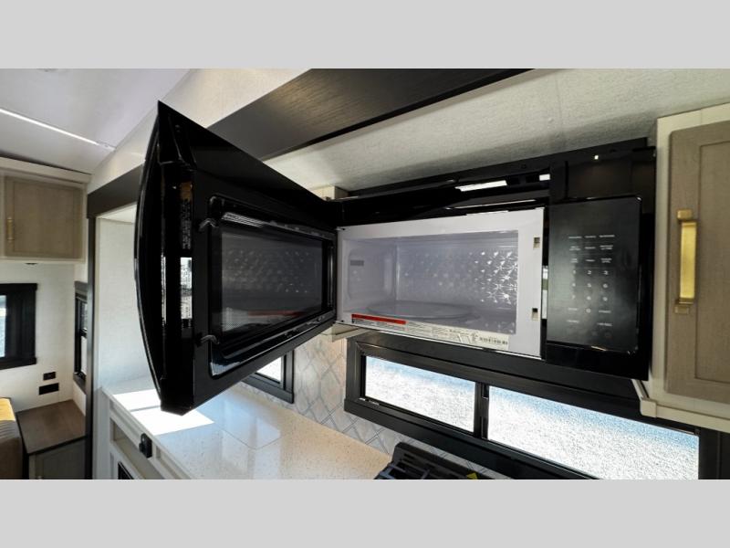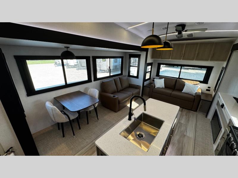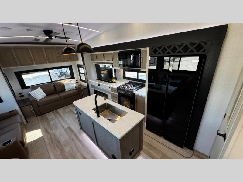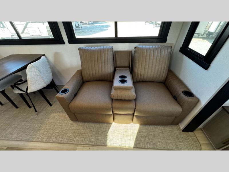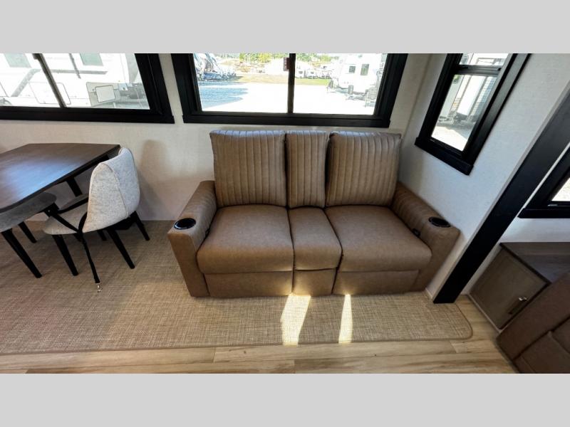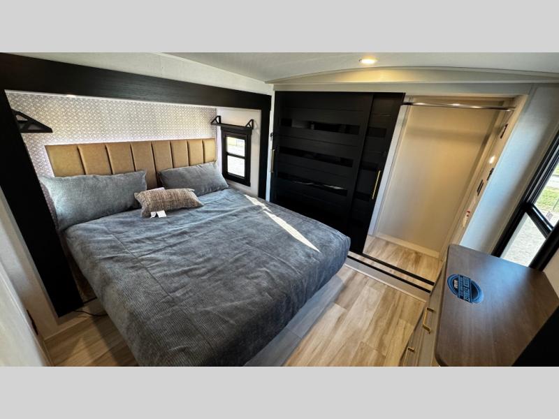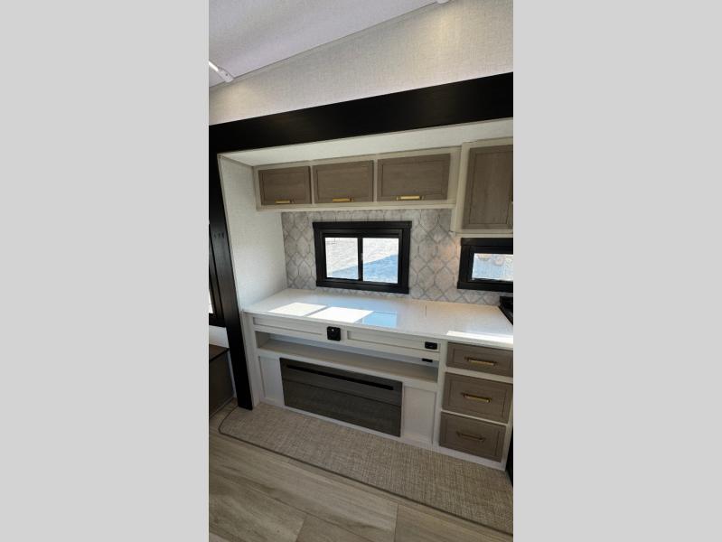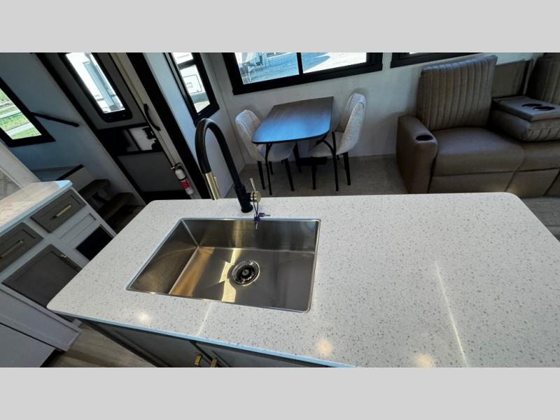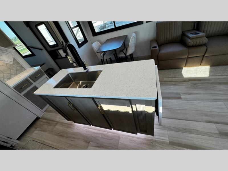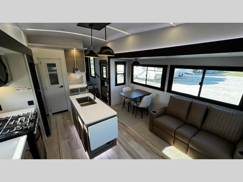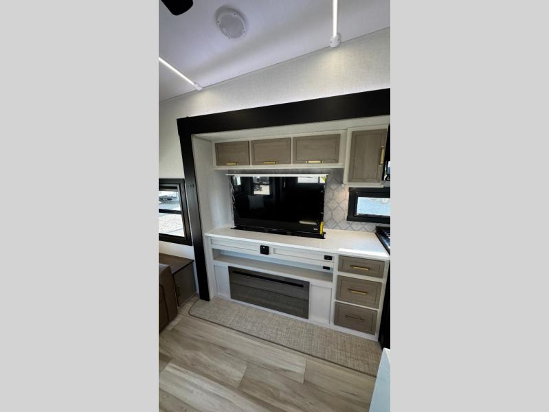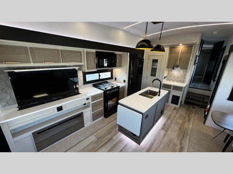 You will love the amount of space you have in this triple slide out fifth wheel, with dual opposing slides in the rear living area/kitchen. Your crew can get cozy on the theater seating across from the pop-up TV and fireplace, play a game at the table and chairs, and sleep on the tri-fold sofa. The chef of your group will love the large kitchen island with an additional countertop extension, plus there is a pantry and 16 cu. ft. 12V refrigerator for food storage. The full bath includes a residential-style walk-in shower with a skylight, a linen closet, and a medicine cabinet to keep everything tidy. And you will sleep like a baby in the front private bedroom with a custom king bed, a dresser with a bench, and washer/dryer prep in the walk-in closet!