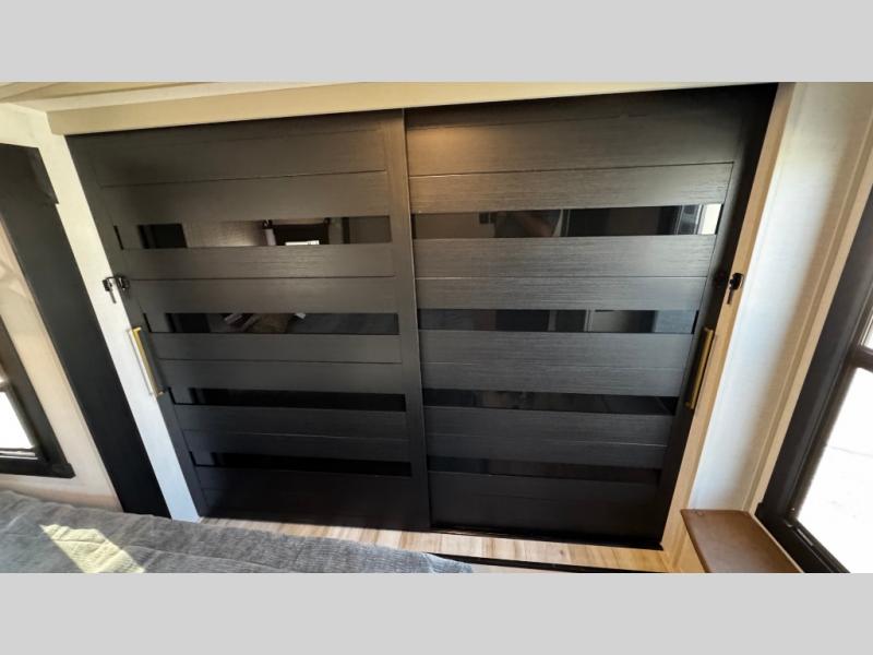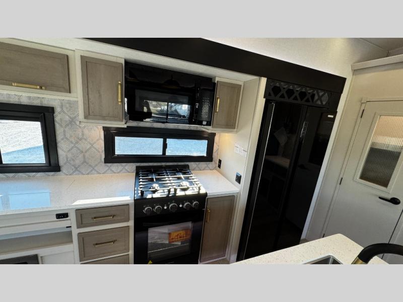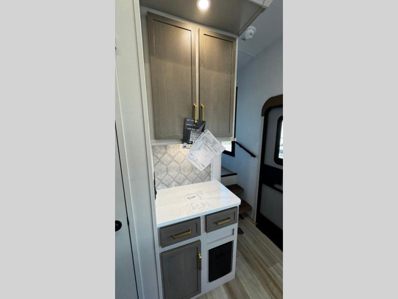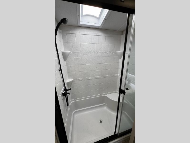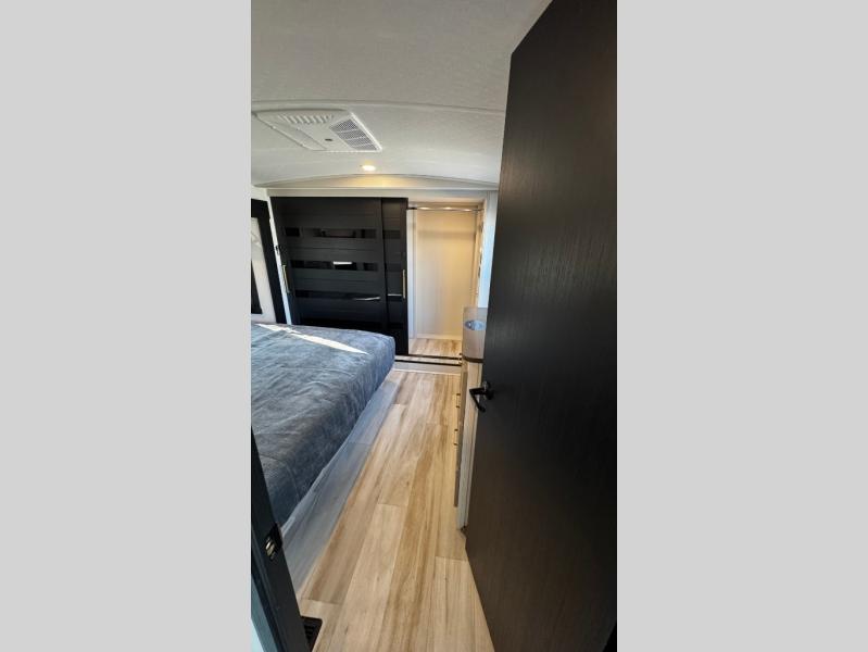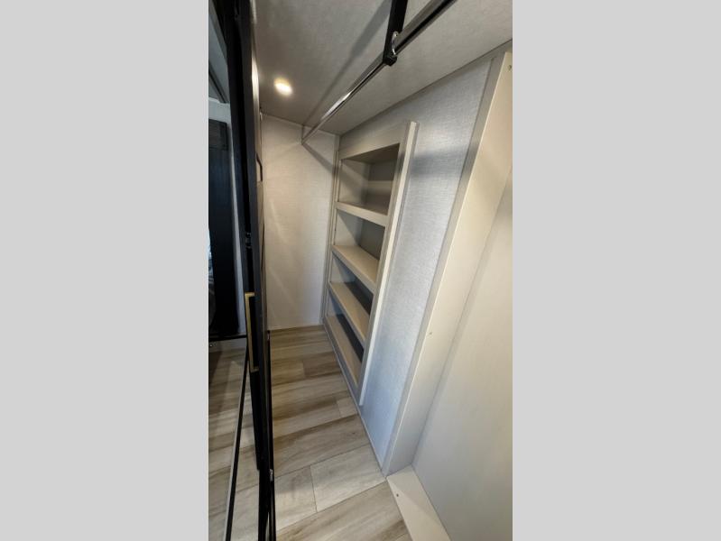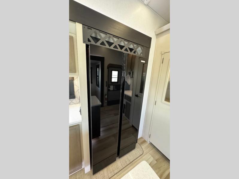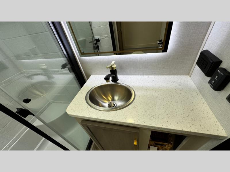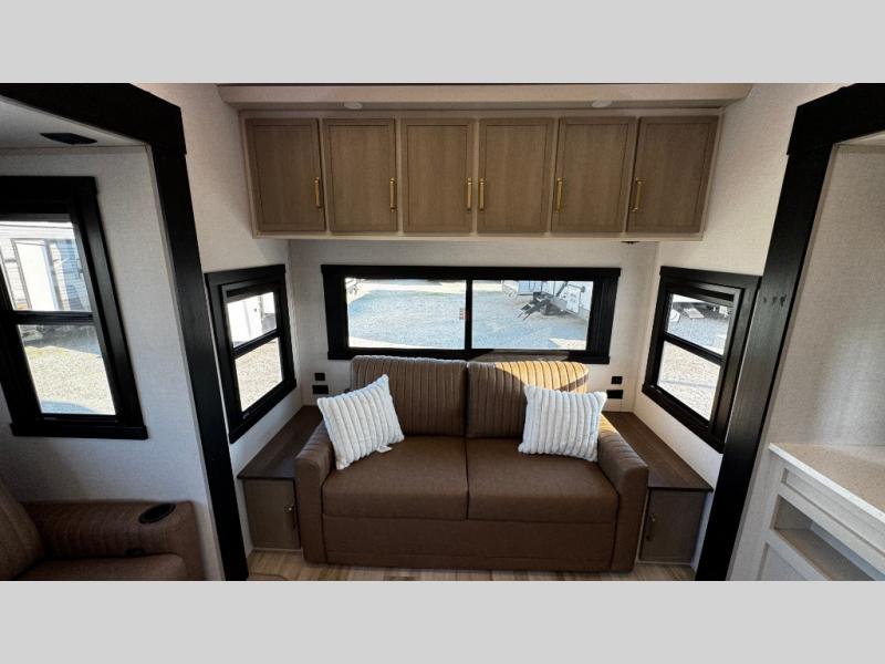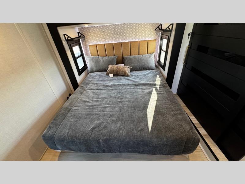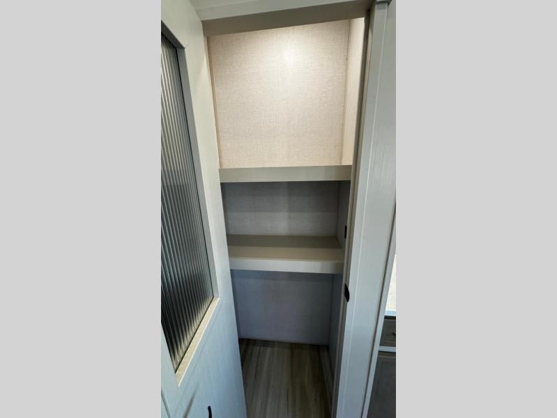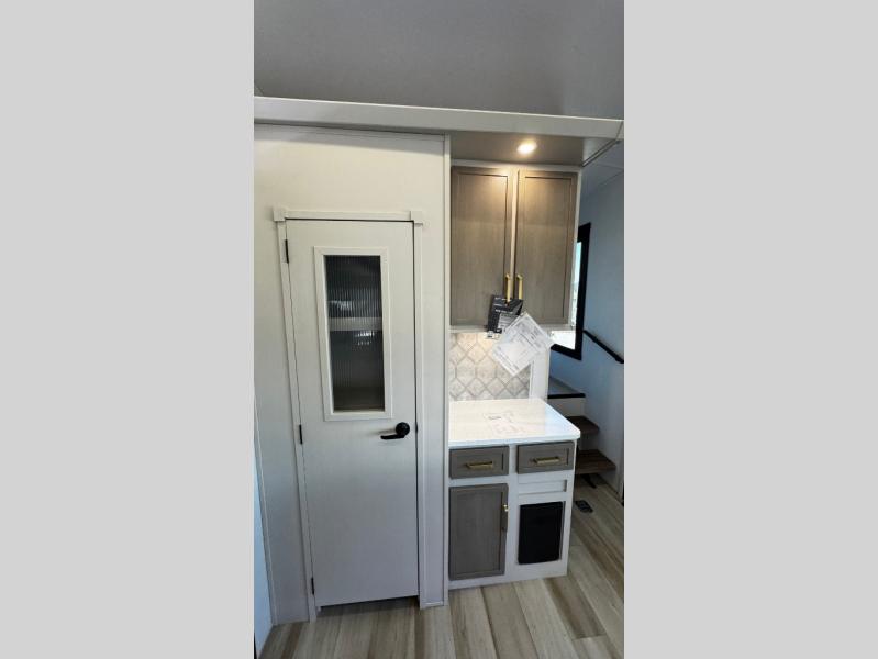 You will love the amount of space you have in this triple slide out fifth wheel, with dual opposing slides in the rear living area/kitchen. Your crew can get cozy on the theater seating across from the pop-up TV and fireplace, play a game at the table and chairs, and sleep on the tri-fold sofa. The chef of your group will love the large kitchen island with an additional countertop extension, plus there is a pantry and 16 cu. ft. 12V refrigerator for food storage. The full bath includes a residential-style walk-in shower with a skylight, a linen closet, and a medicine cabinet to keep everything tidy. And you will sleep like a baby in the front private bedroom with a custom king bed, a dresser with a bench, and washer/dryer prep in the walk-in closet!