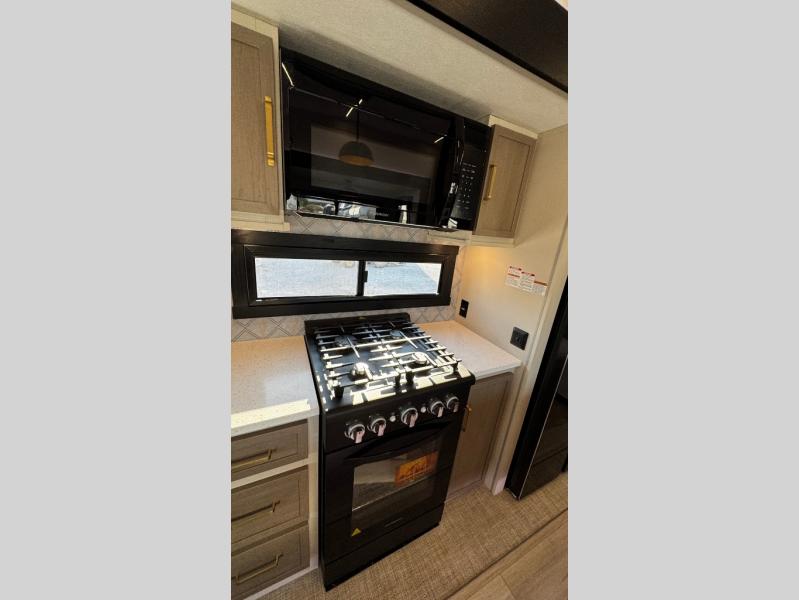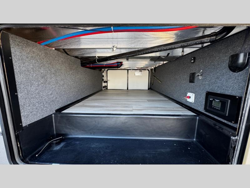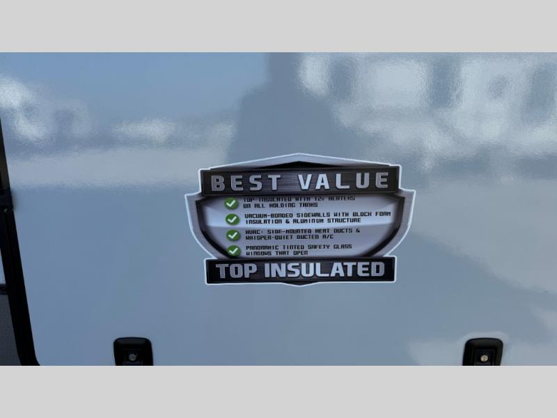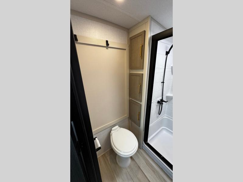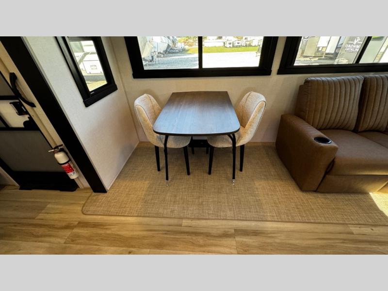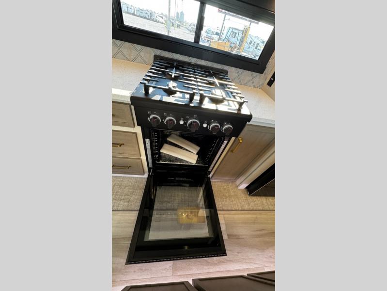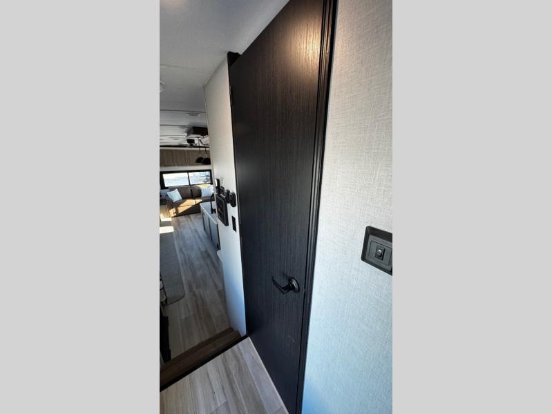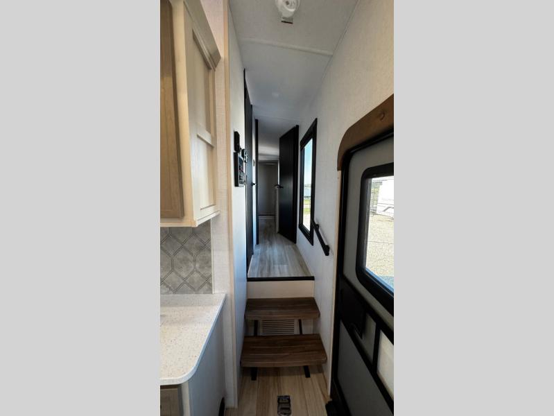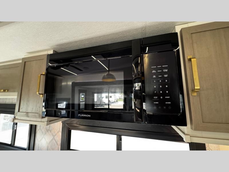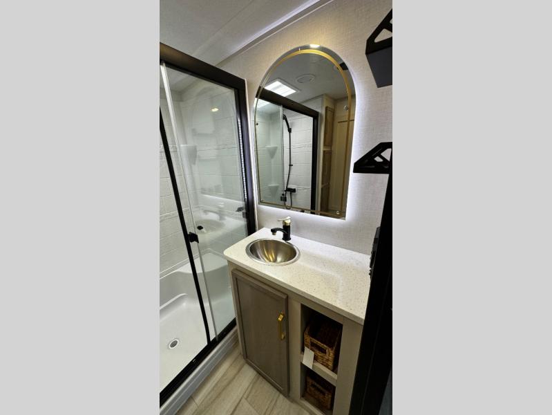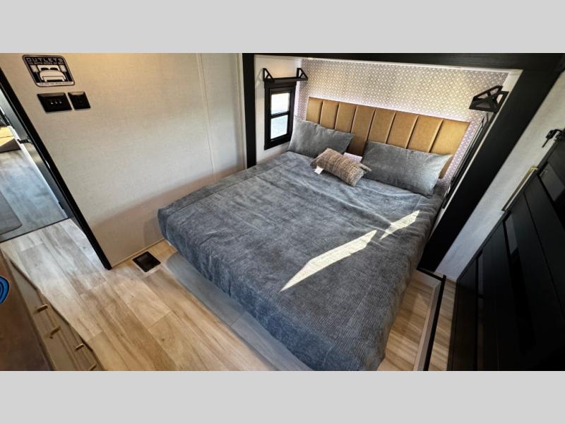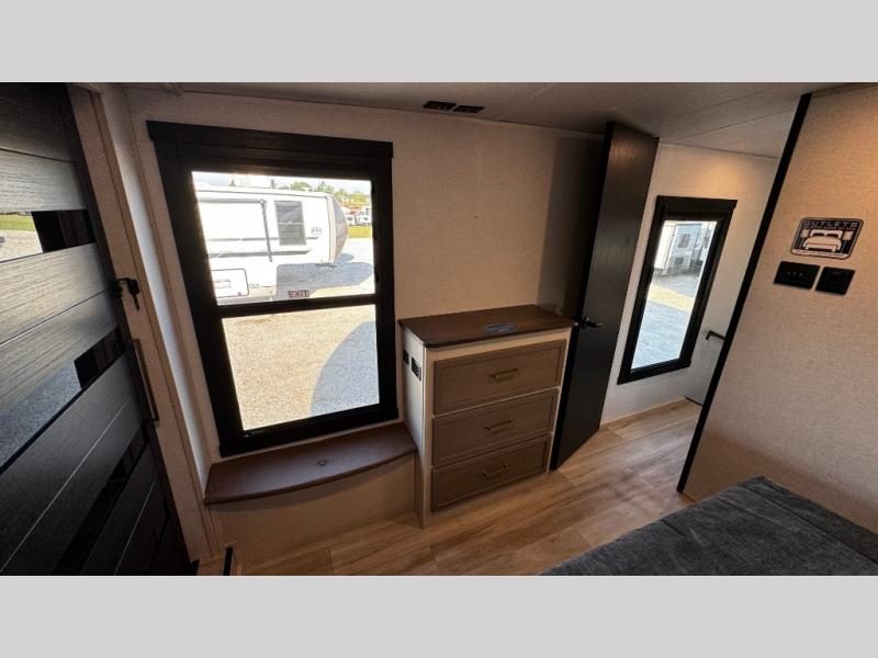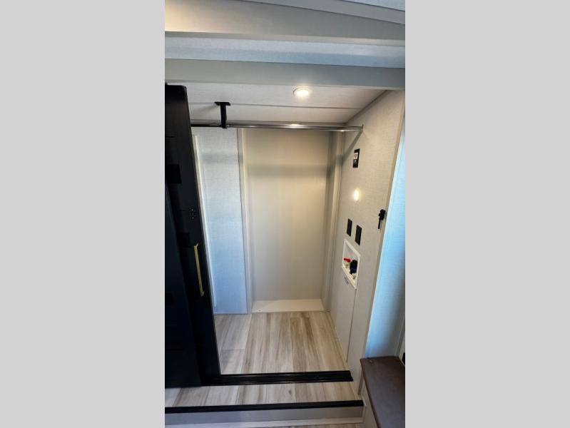You will love the amount of space you have in this triple slide out fifth wheel, with dual opposing slides in the rear living area/kitchen. Your crew can get cozy on the theater seating across from the pop-up TV and fireplace, play a game at the table and chairs, and sleep on the tri-fold sofa. The chef of your group will love the large kitchen island with an additional countertop extension, plus there is a pantry and 16 cu. ft. 12V refrigerator for food storage. The full bath includes a residential-style walk-in shower with a skylight, a linen closet, and a medicine cabinet to keep everything tidy. And you will sleep like a baby in the front private bedroom with a custom king bed, a dresser with a bench, and washer/dryer prep in the walk-in closet!