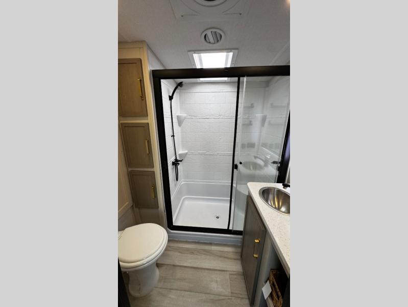 With any Wildwood Heritage Glen fifth wheel by Forest River, the quality construction, attention to detail and design along with a bright and welcoming interior allows you to relax in comfort with conveniences while exploring outdoors. The Summer Wind colored horizontal plank linoleum flooring is unique, beautiful and durable, and there are gold-accented faucets with stainless steel sinks in the bathrooms for added luxury. The Accessibelly underbelly with 12V tank heaters will help protect your unit from the elements, and the power stabilizer jacks and landing gear will make set-up a breeze. More features that provide convenience include the high-end solid surface countertops, an RV Airflow System that provides at least 25% better airflow, and solar prep for off-grid capabilities.