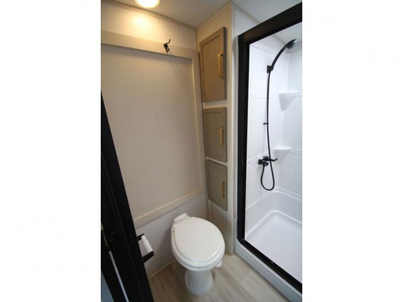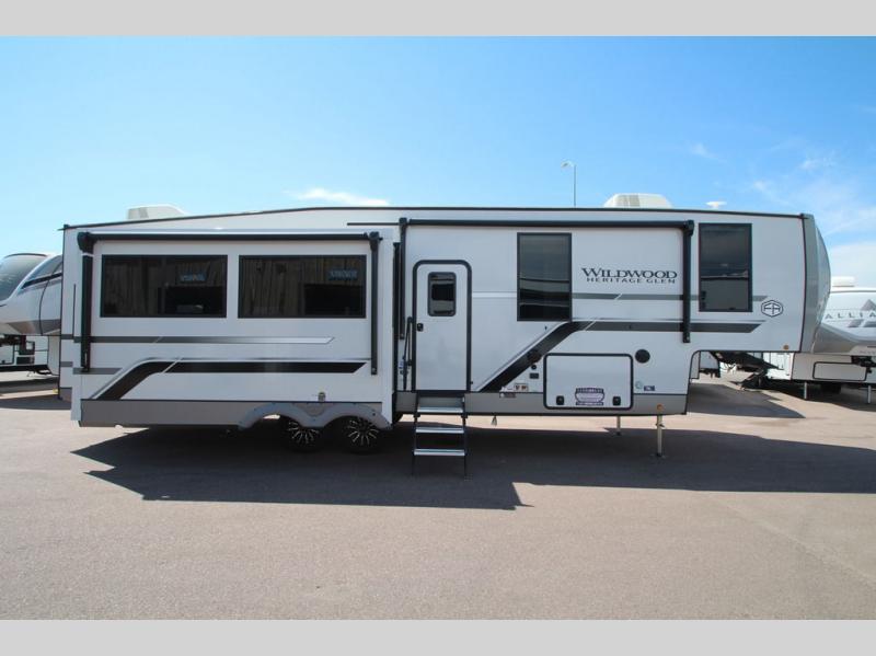 With any Wildwood Heritage Glen fifth wheel by Forest River, the quality construction, attention to detail and design along with a bright and welcoming interior allows you to relax in comfort with conveniences while exploring outdoors. The Summer Wind colored horizontal plank linoleum flooring is unique, beautiful and durable, and there are gold-accented faucets with stainless steel sinks in the bathrooms for added luxury. The Accessibelly underbelly with 12V tank heaters will help protect your unit from the elements, and the power stabilizer jacks and landing gear will make set-up a breeze. More features that provide convenience include the high-end solid surface countertops, an RV Airflow System that provides at least 25% better airflow, and solar prep for off-grid capabilities.