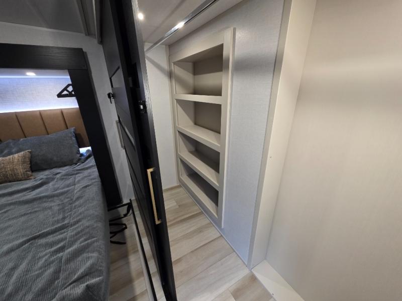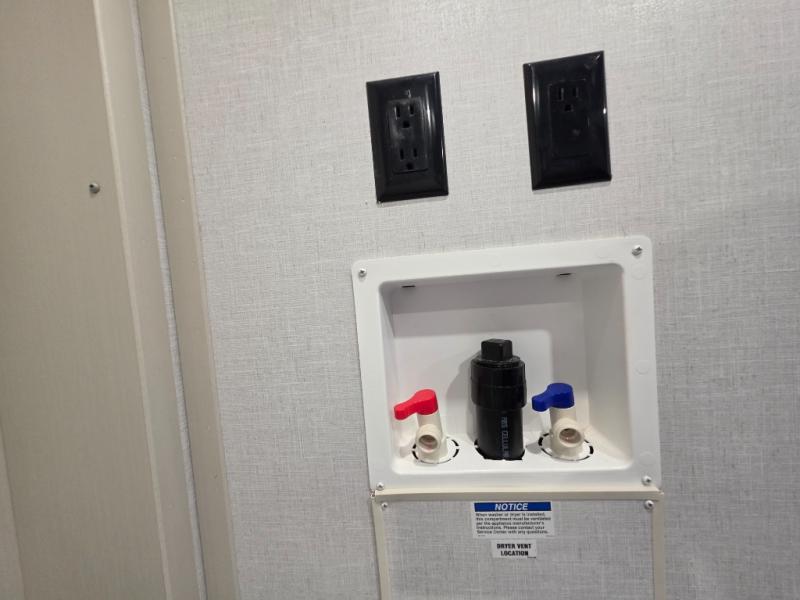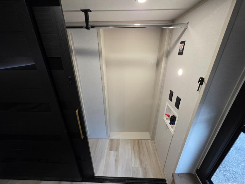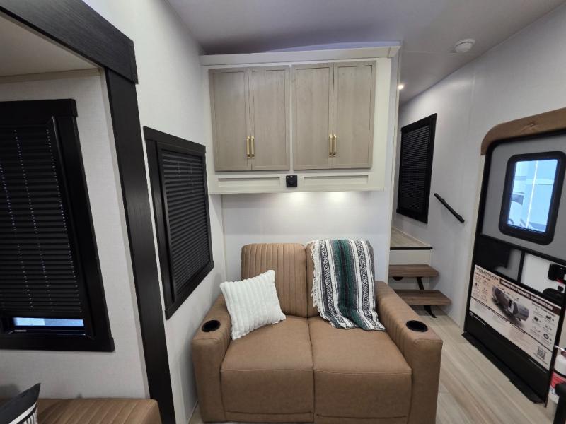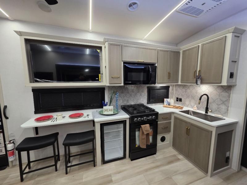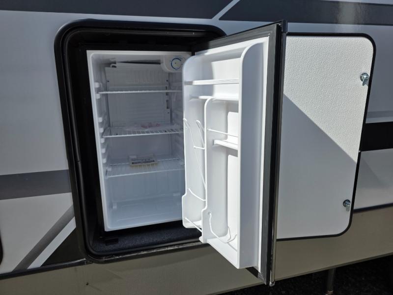 You'll love every minute spent in this feature-packed fifth wheel! Your guests or the little ones will love the rear bunkhouse with double-size bunks and Versa Tilt on the bottom bunk and a ladder to easily climb on the top bunk. The front private bedroom will be all yours with a custom king bed slide out, a dresser, and a front closet with shelves plus washer and dryer prep. Everyone can meet in the main living room and kitchen that includes a tri-fold sofa, 60" theater seating, a fixed bar top, and a beverage center with a wine/beverage refrigerator. There is also a 50" TV to enjoy movie nights, or you may just find yourselves outdoors under the two power awnings with LED lights. And the outdoor refrigerator is a nice addition to this fifth wheel!