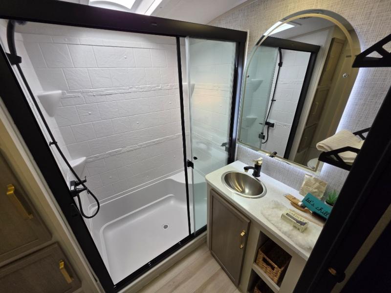 With any Wildwood Heritage Glen fifth wheel by Forest River, the quality construction, attention to detail and design along with a bright and welcoming interior allows you to relax in comfort with conveniences while exploring outdoors. The Summer Wind colored horizontal plank linoleum flooring is unique, beautiful and durable, and there are gold-accented faucets with stainless steel sinks in the bathrooms for added luxury. The Accessibelly underbelly with 12V tank heaters will help protect your unit from the elements, and the power stabilizer jacks and landing gear will make set-up a breeze. More features that provide convenience include the high-end solid surface countertops, an RV Airflow System that provides at least 25% better airflow, and solar prep for off-grid capabilities.