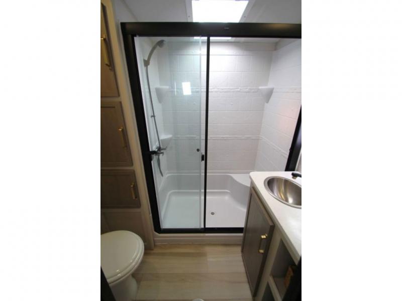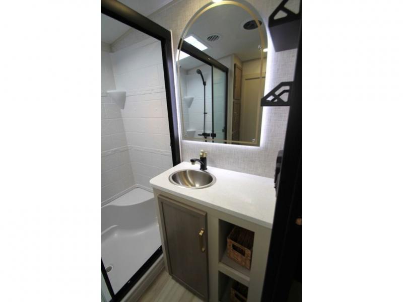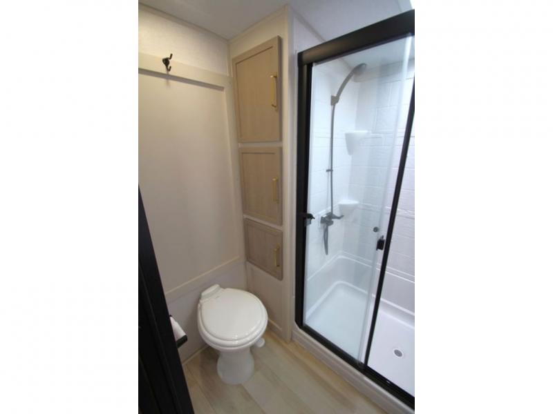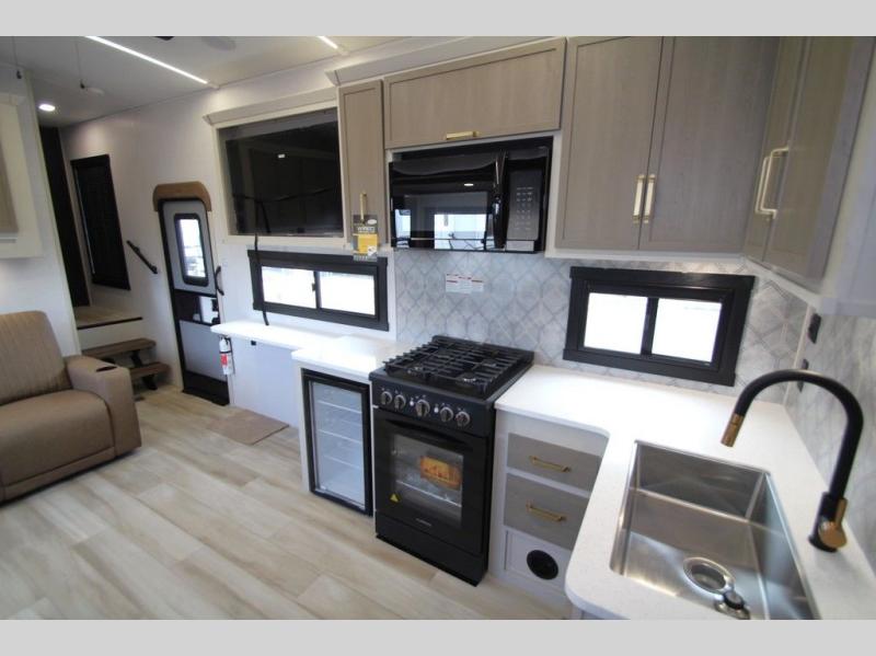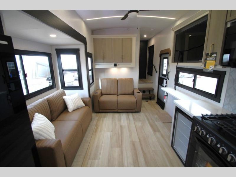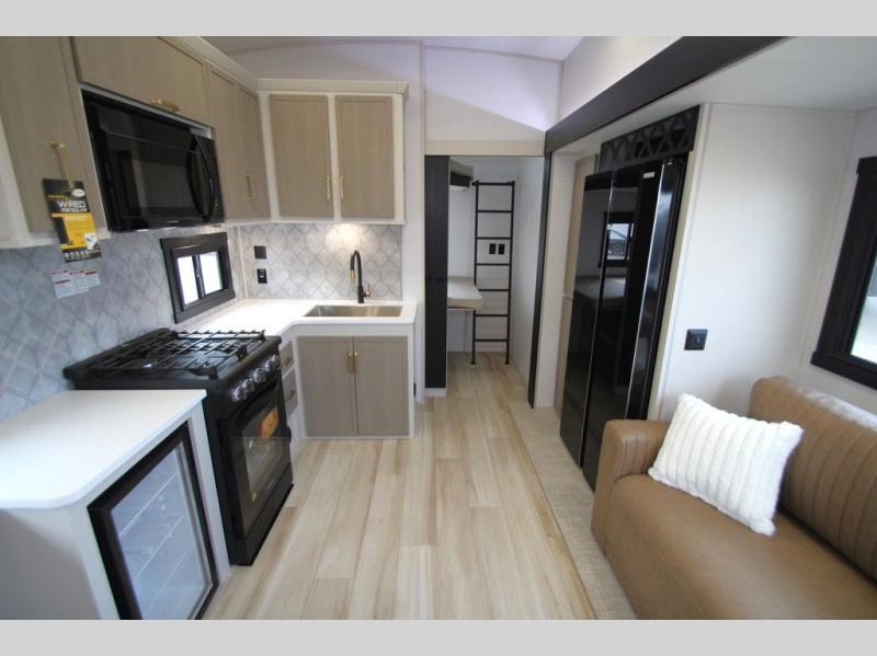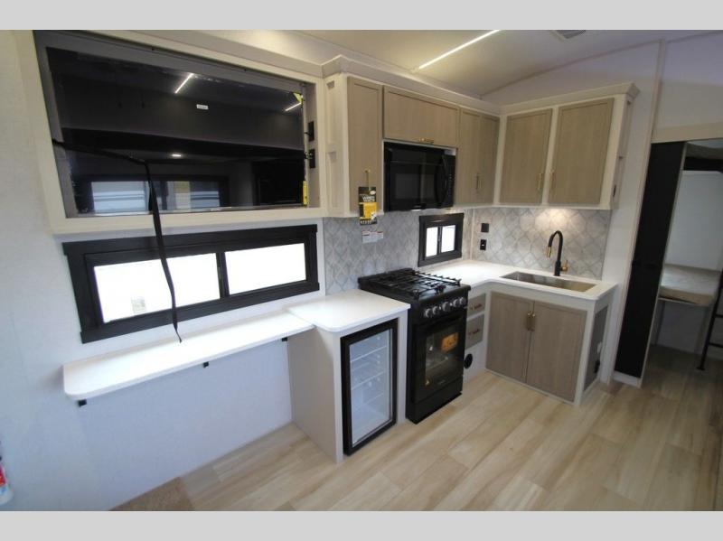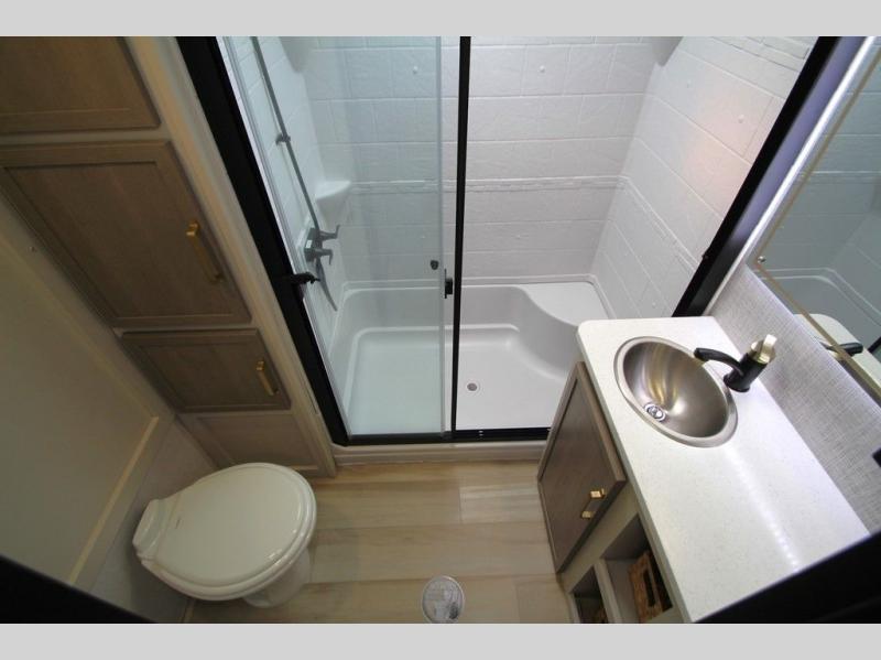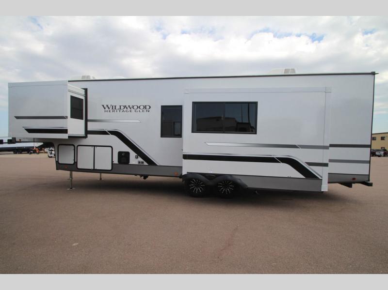 With any Wildwood Heritage Glen fifth wheel by Forest River, the quality construction, attention to detail and design along with a bright and welcoming interior allows you to relax in comfort with conveniences while exploring outdoors. The Summer Wind colored horizontal plank linoleum flooring is unique, beautiful and durable, and there are gold-accented faucets with stainless steel sinks in the bathrooms for added luxury. The Accessibelly underbelly with 12V tank heaters will help protect your unit from the elements, and the power stabilizer jacks and landing gear will make set-up a breeze. More features that provide convenience include the high-end solid surface countertops, an RV Airflow System that provides at least 25% better airflow, and solar prep for off-grid capabilities.