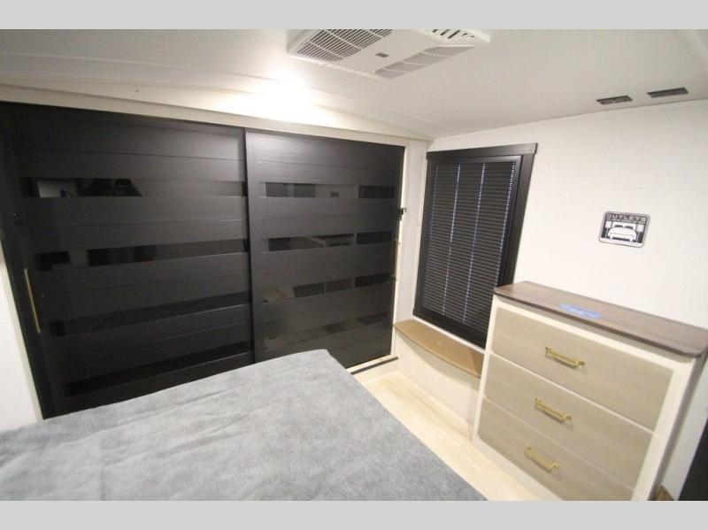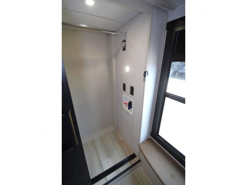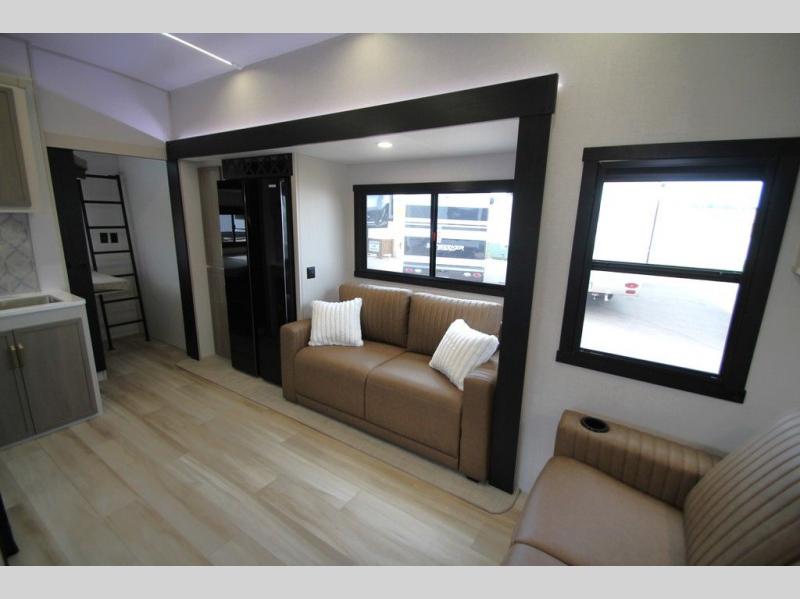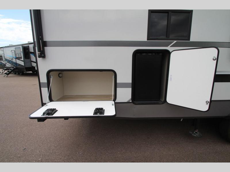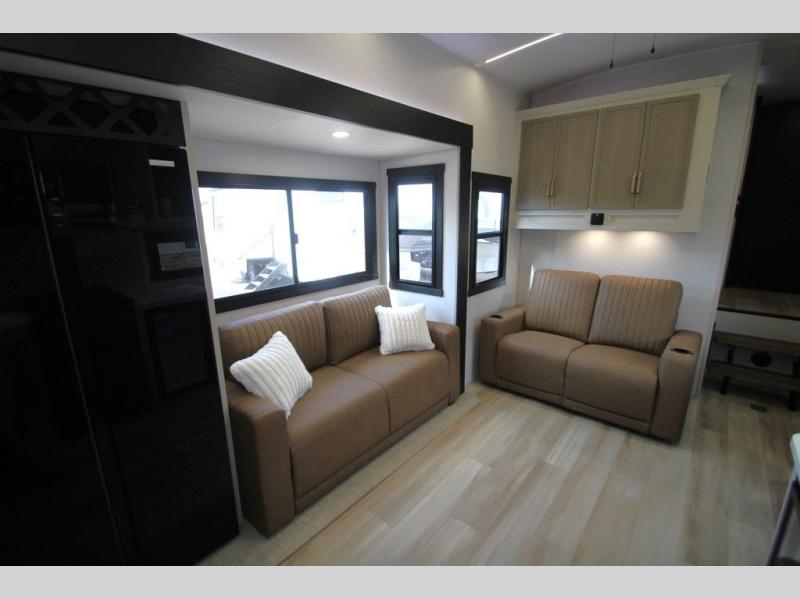 You'll love every minute spent in this feature-packed fifth wheel! Your guests or the little ones will love the rear bunkhouse with double-size bunks and Versa Tilt on the bottom bunk and a ladder to easily climb on the top bunk. The front private bedroom will be all yours with a custom king bed slide out, a dresser, and a front closet with shelves plus washer and dryer prep. Everyone can meet in the main living room and kitchen that includes a tri-fold sofa, 60" theater seating, a fixed bar top, and a beverage center with a wine/beverage refrigerator. There is also a 50" TV to enjoy movie nights, or you may just find yourselves outdoors under the two power awnings with LED lights. And the outdoor refrigerator is a nice addition to this fifth wheel!