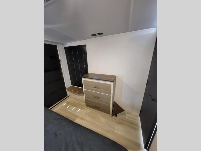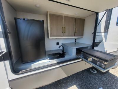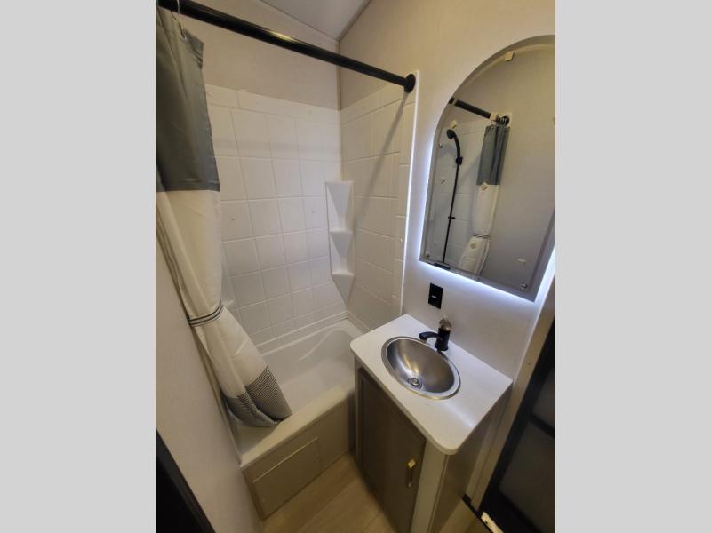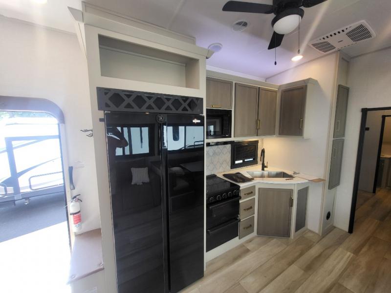 Not all fifth wheels are alike, and once you own this Wildwood Heritage Glen, you will understand! The rear entry into the second full bathroom allows the kids or your friends to enter and exit quickly to get back outside to the fun. They will also be able to shower and then enter their private bunkhouse that has two bunks, a convertible sofa bed, and two slides that offer lots of floor space to play. You will have your own oasis on the opposite side in the front private bedroom that has a custom king bed with Versa Tilt, a full-width wardrobe, and washer and dryer prep. The other full bathroom is only steps away from the main entrance and living area. The inside kitchen offers even more amenities, and the fourth slide provides a family U-shaped dinette and tri-fold sofa.