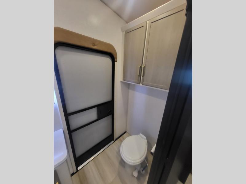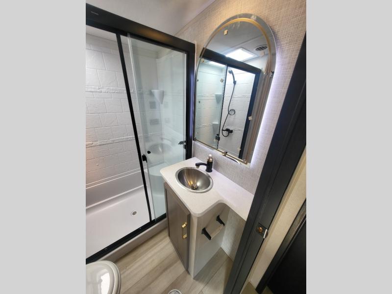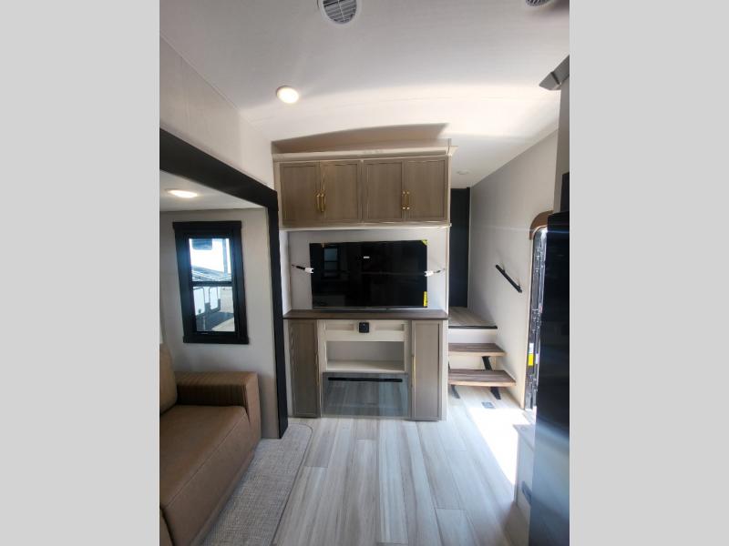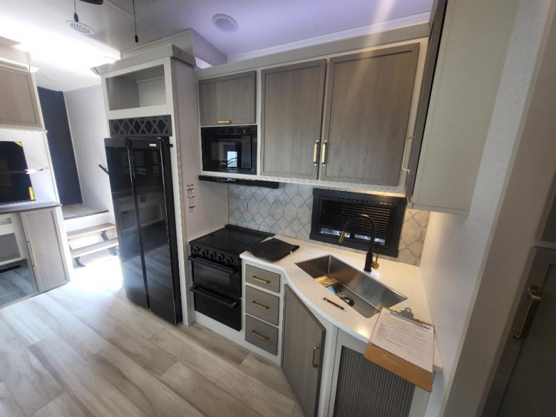 With any Wildwood Heritage Glen fifth wheel by Forest River, the quality construction, attention to detail and design along with a bright and welcoming interior allows you to relax in comfort with conveniences while exploring outdoors. The European Oak colored horizontal plank linoleum flooring is unique, beautiful and durable, and there are gold-accented faucets with stainless steel sinks in the bathrooms for added luxury. The Accessibelly underbelly with 12V tank heaters on all holding tanks allows you to camp anytime of year, and the power stabilizer jacks and landing gear will make set-up a breeze. More features that provide convenience include the high-end solid surface countertops, an RV Airflow System that provides at least 25% better airflow, an automotive grade painted front cap with a gel coat, and solar prep for off-grid capabilities.