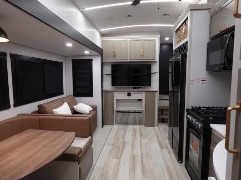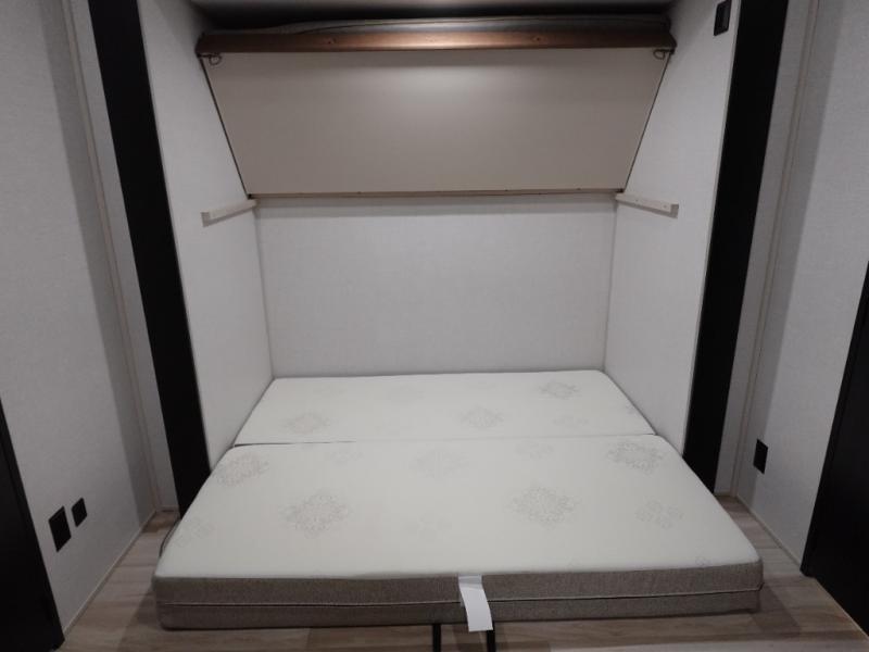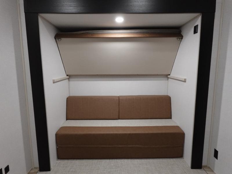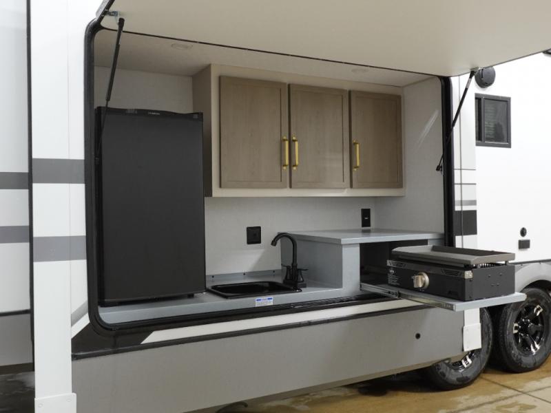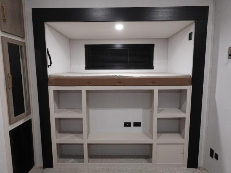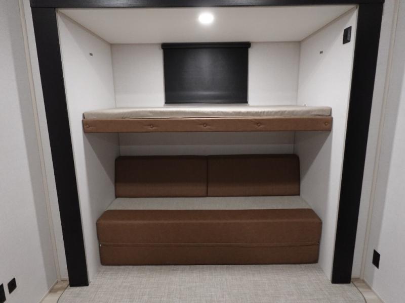 Not all fifth wheels are alike, and once you own this Wildwood Heritage Glen, you will understand! The rear entry into the second full bathroom allows the kids or your friends to enter and exit quickly to get back outside to the fun. They will also be able to shower and then enter their private bunkhouse that has two bunks, a convertible sofa bed, and two slides that offer lots of floor space to play. You will have your own oasis on the opposite side in the front private bedroom that has a custom king bed, a full-width wardrobe, and washer and dryer prep. The other full bathroom is only steps away from the main entrance and living area. The inside kitchen offers even more amenities, and the fourth slide provides a family U-shaped dinette and tri-fold sofa.