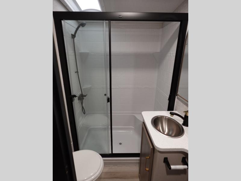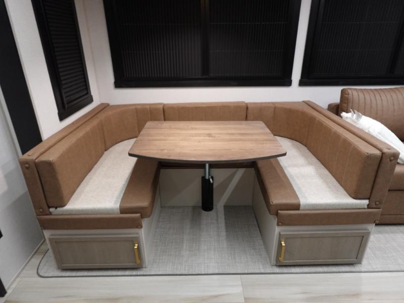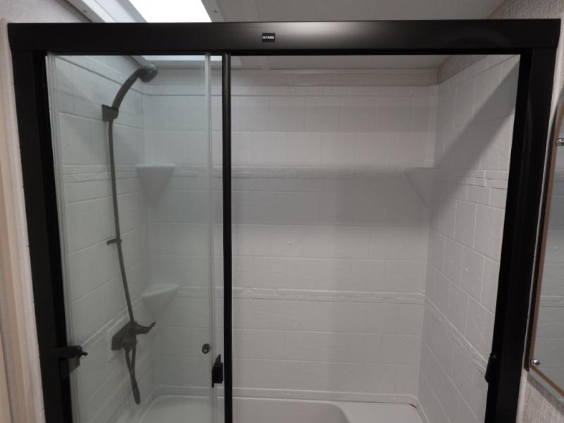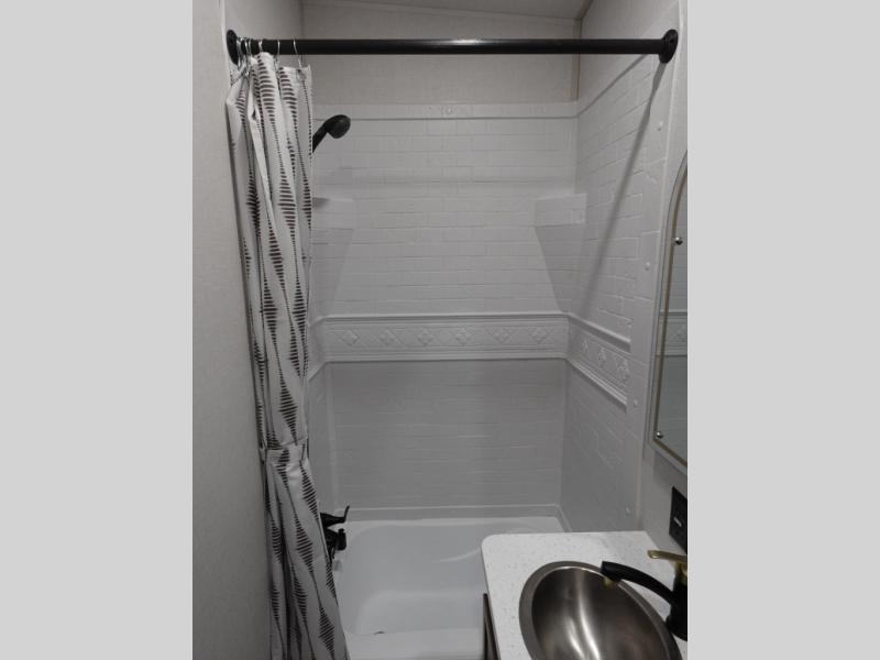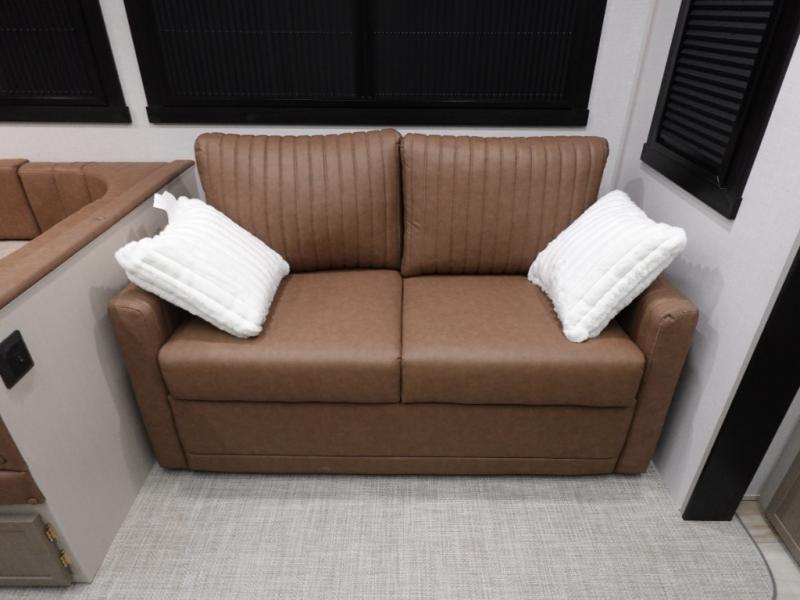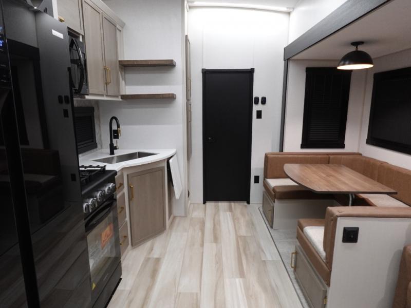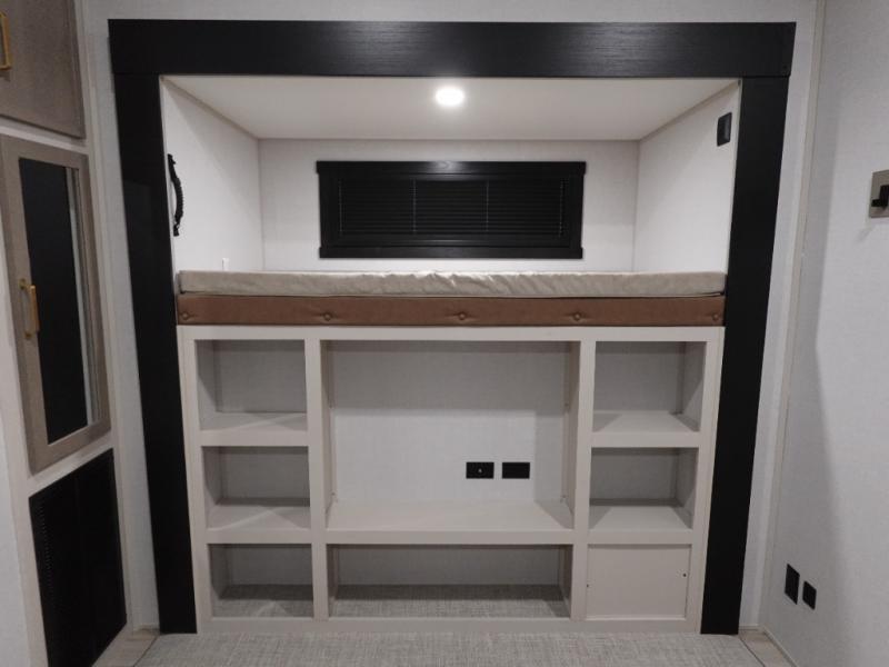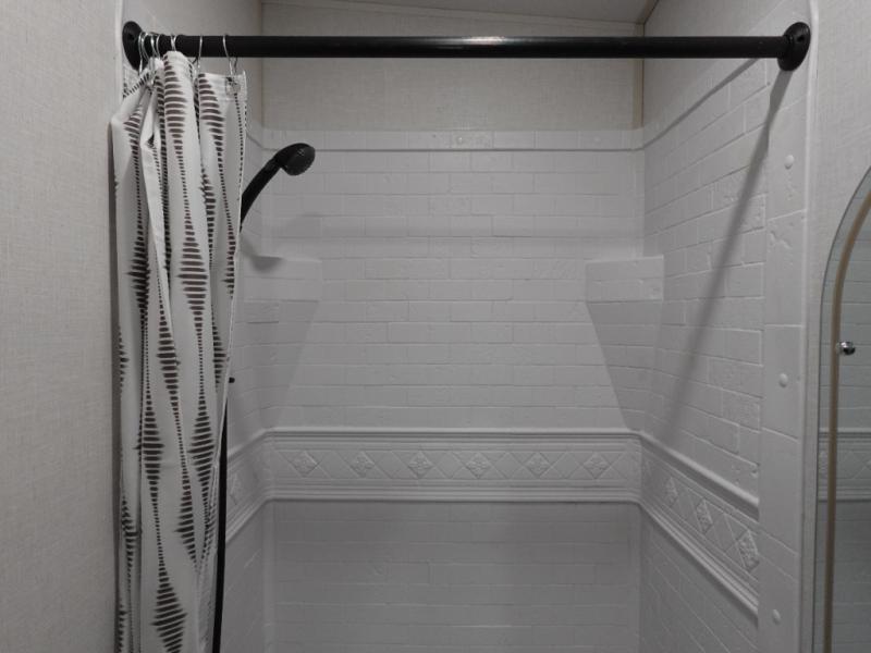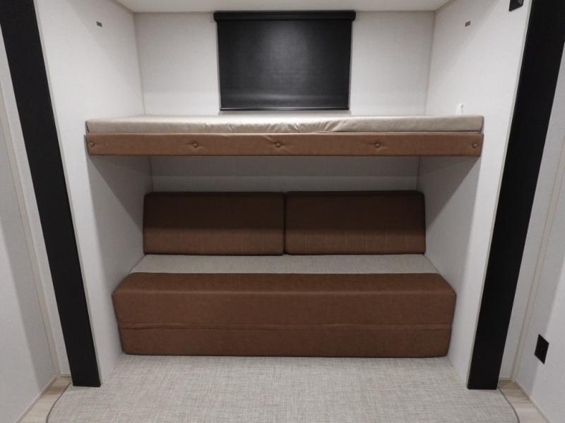 Not all fifth wheels are alike, and once you own this Wildwood Heritage Glen, you will understand! The rear entry into the second full bathroom allows the kids or your friends to enter and exit quickly to get back outside to the fun. They will also be able to shower and then enter their private bunkhouse that has two bunks, a convertible sofa bed, and two slides that offer lots of floor space to play. You will have your own oasis on the opposite side in the front private bedroom that has a custom king bed, a full-width wardrobe, and washer and dryer prep. The other full bathroom is only steps away from the main entrance and living area. The inside kitchen offers even more amenities, and the fourth slide provides a family U-shaped dinette and tri-fold sofa.