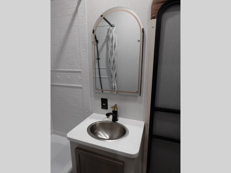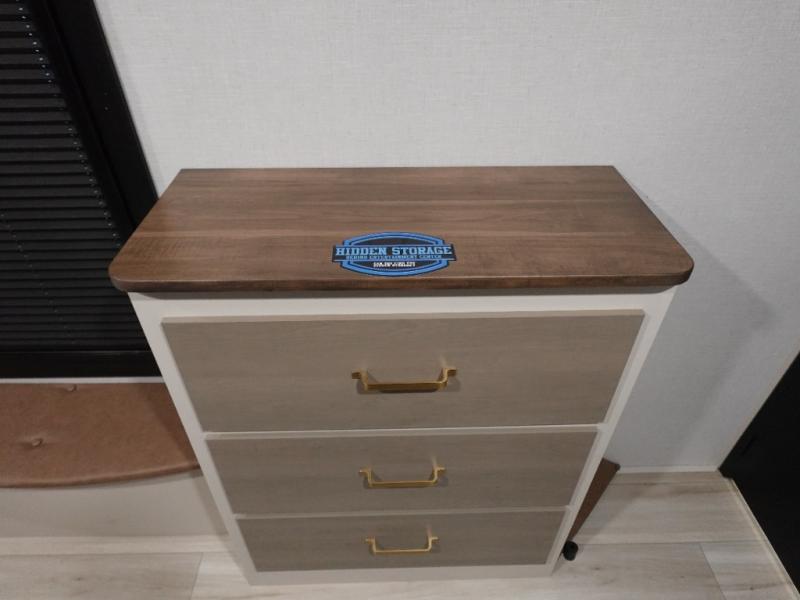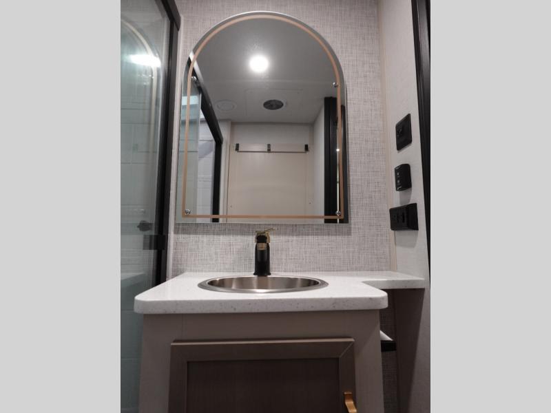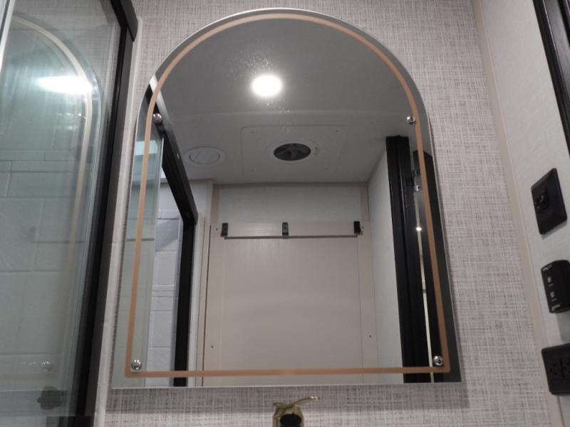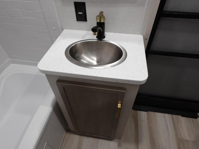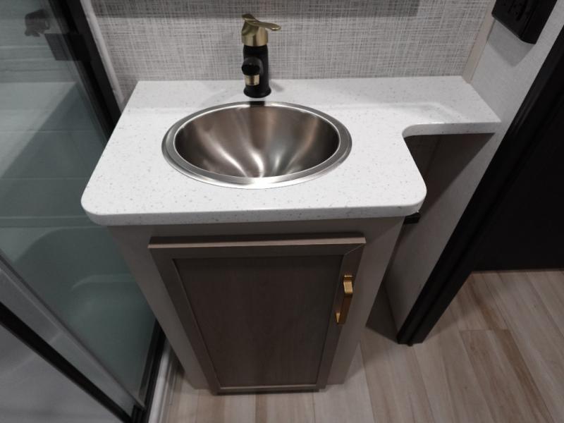 With any Wildwood Heritage Glen fifth wheel by Forest River, the quality construction, attention to detail and design along with a bright and welcoming interior allows you to relax in comfort with conveniences while exploring outdoors. The Summer Wind colored horizontal plank linoleum flooring is unique, beautiful and durable, and there are gold-accented faucets with stainless steel sinks in the bathrooms for added luxury. The Accessibelly underbelly with 12V tank heaters will help protect your unit from the elements, and the power stabilizer jacks and landing gear will make set-up a breeze. More features that provide convenience include the high-end solid surface countertops, an RV Airflow System that provides at least 25% better airflow, and solar prep for off-grid capabilities.