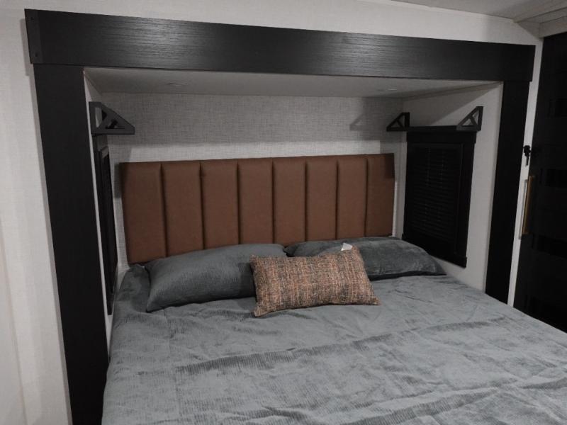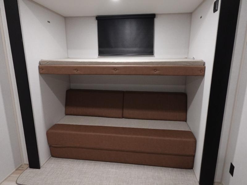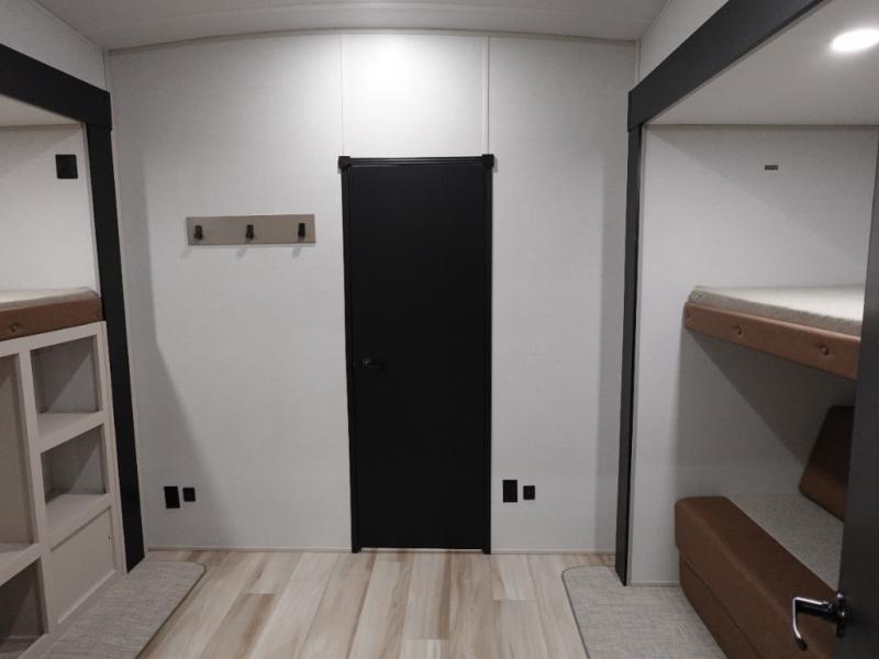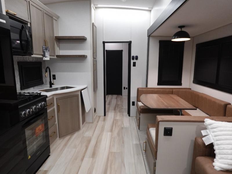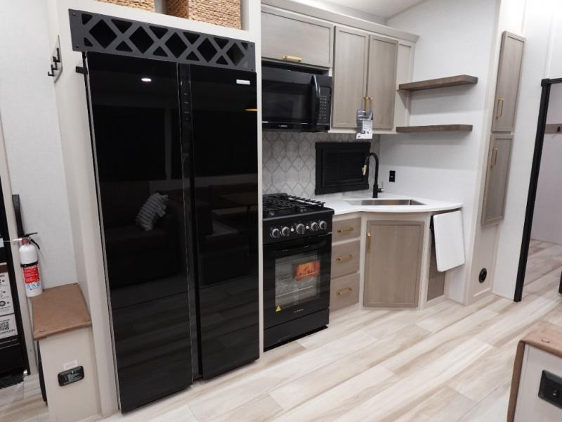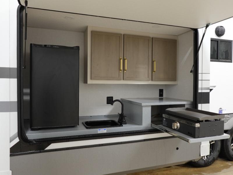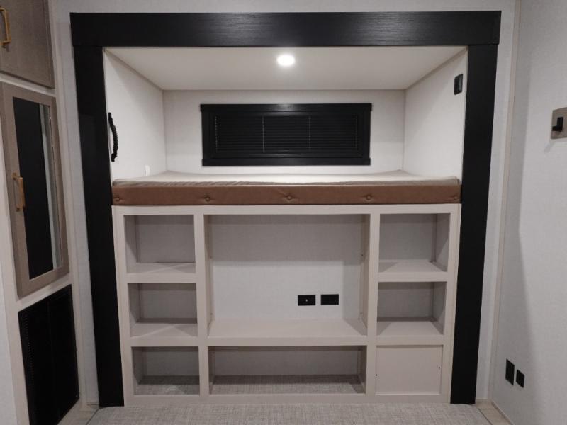 Not all fifth wheels are alike, and once you own this Wildwood Heritage Glen, you will understand! The rear entry into the second full bathroom allows the kids or your friends to enter and exit quickly to get back outside to the fun. They will also be able to shower and then enter their private bunkhouse that has two bunks, a convertible sofa bed, and two slides that offer lots of floor space to play. You will have your own oasis on the opposite side in the front private bedroom that has a custom king bed, a full-width wardrobe, and washer and dryer prep. The other full bathroom is only steps away from the main entrance and living area. The inside kitchen offers even more amenities, and the fourth slide provides a family U-shaped dinette and tri-fold sofa.