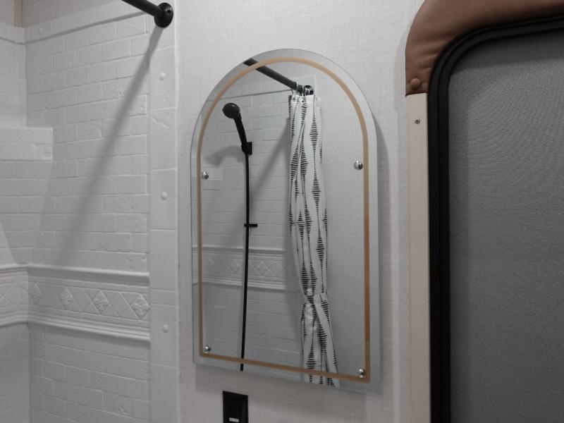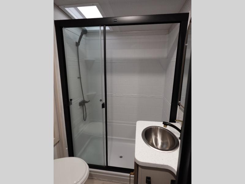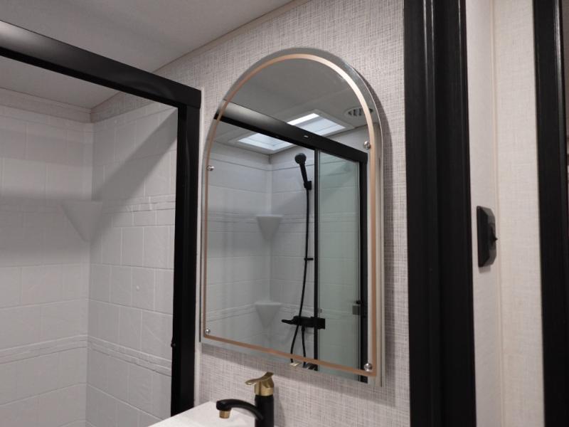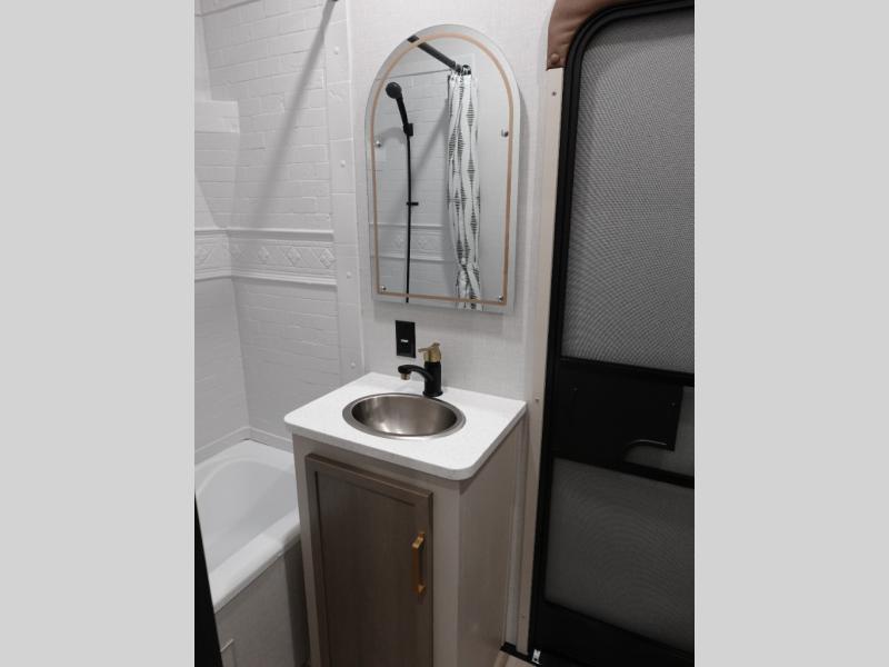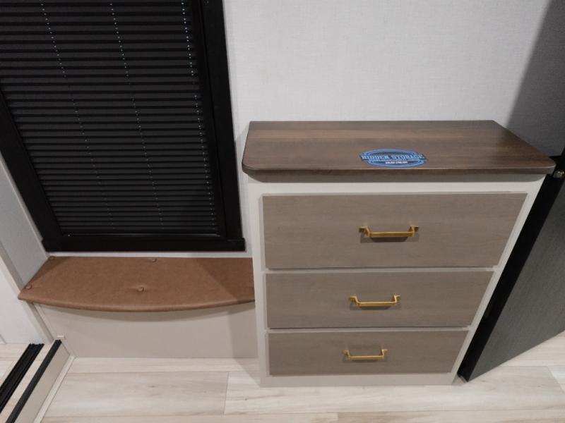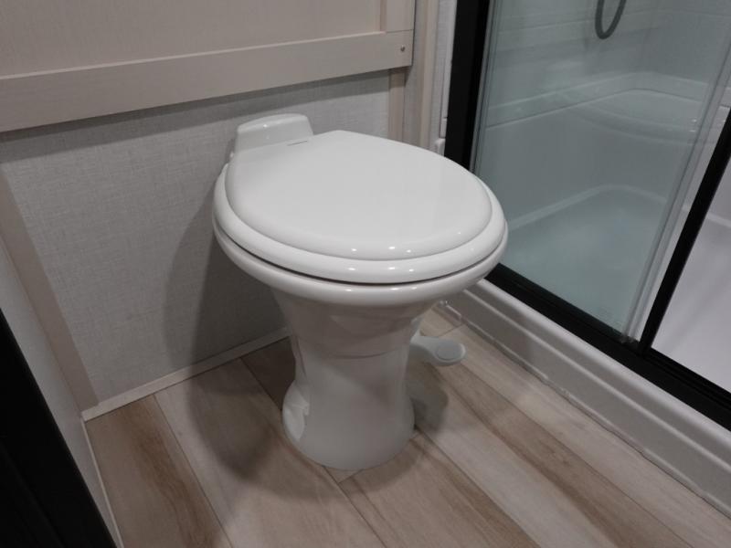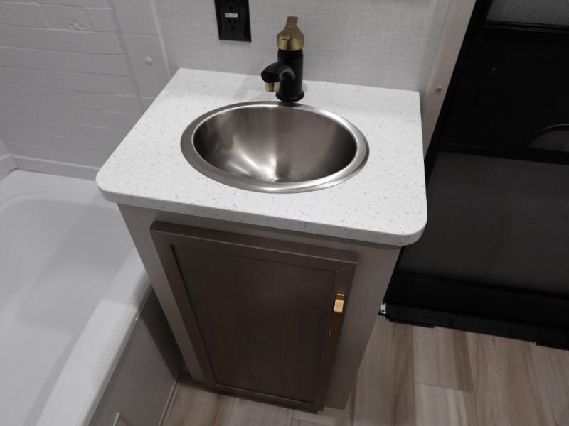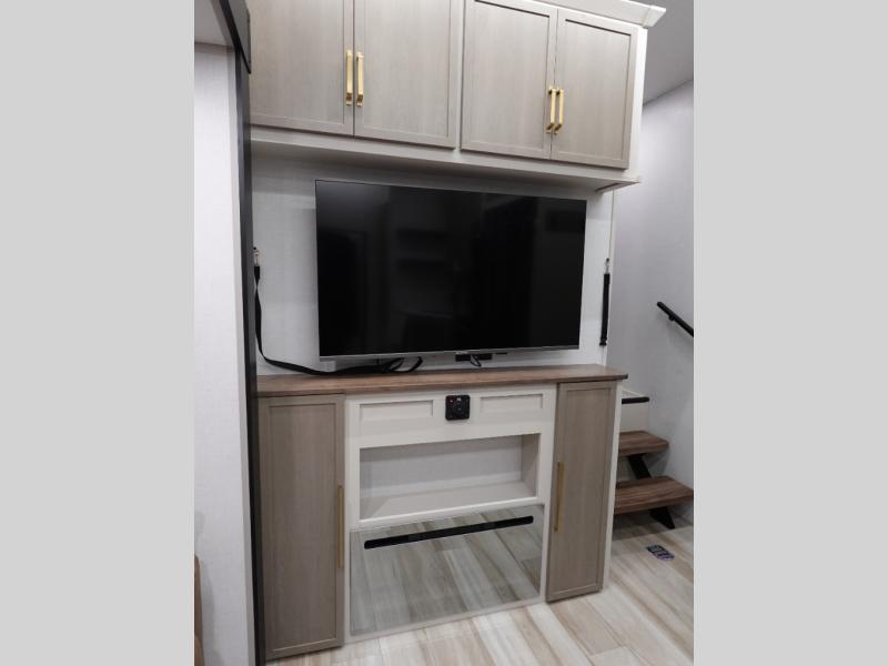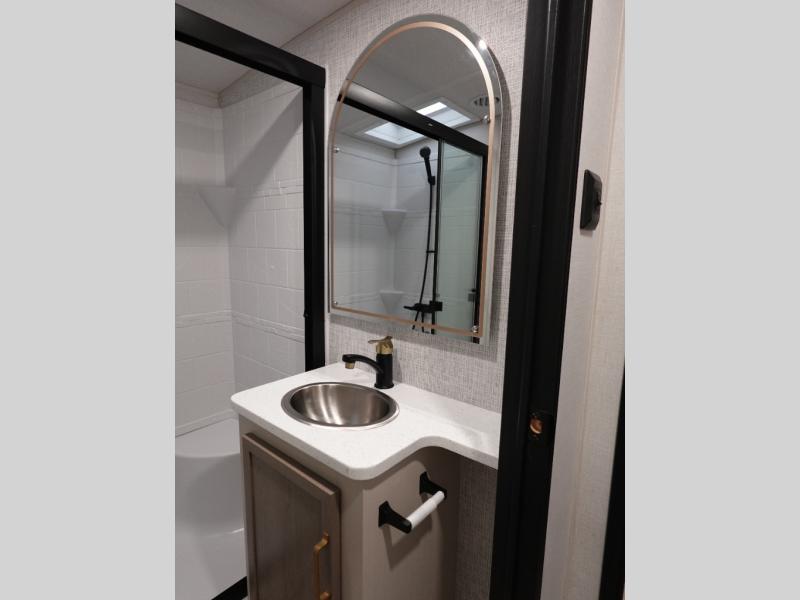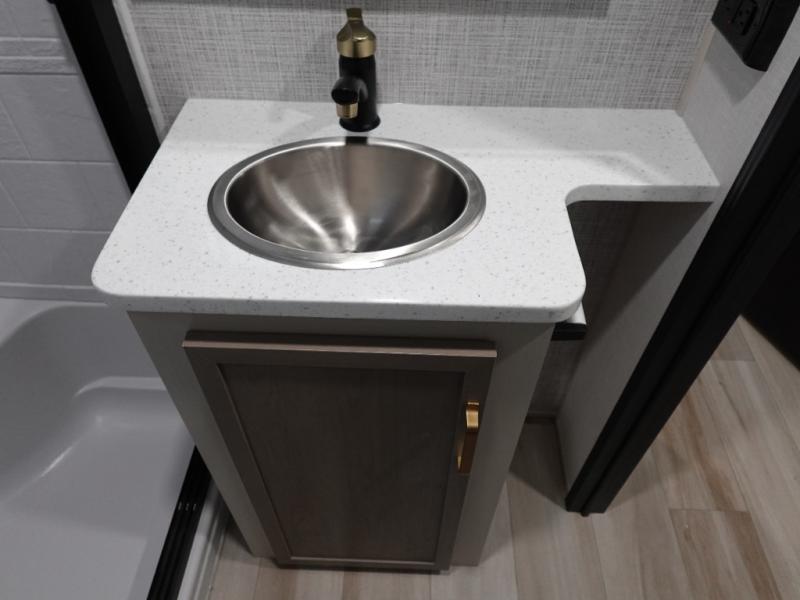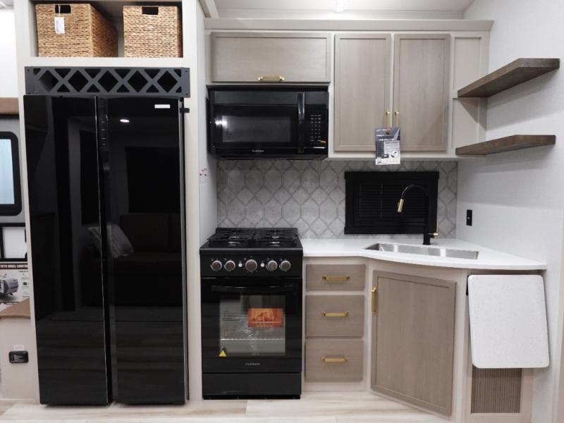 With any Wildwood Heritage Glen fifth wheel by Forest River, the quality construction, attention to detail and design along with a bright and welcoming interior allows you to relax in comfort with conveniences while exploring outdoors. The Summer Wind colored horizontal plank linoleum flooring is unique, beautiful and durable, and there are gold-accented faucets with stainless steel sinks in the bathrooms for added luxury. The Accessibelly underbelly with 12V tank heaters will help protect your unit from the elements, and the power stabilizer jacks and landing gear will make set-up a breeze. More features that provide convenience include the high-end solid surface countertops, an RV Airflow System that provides at least 25% better airflow, and solar prep for off-grid capabilities.