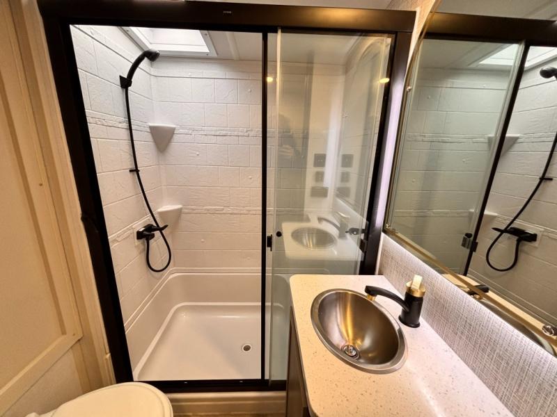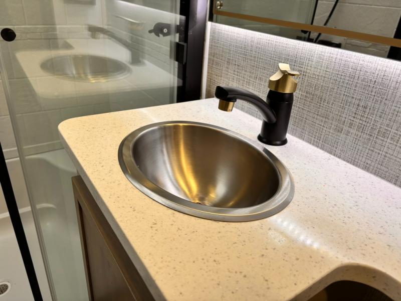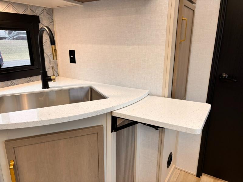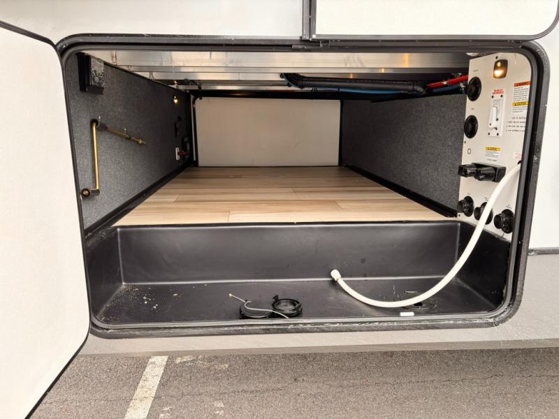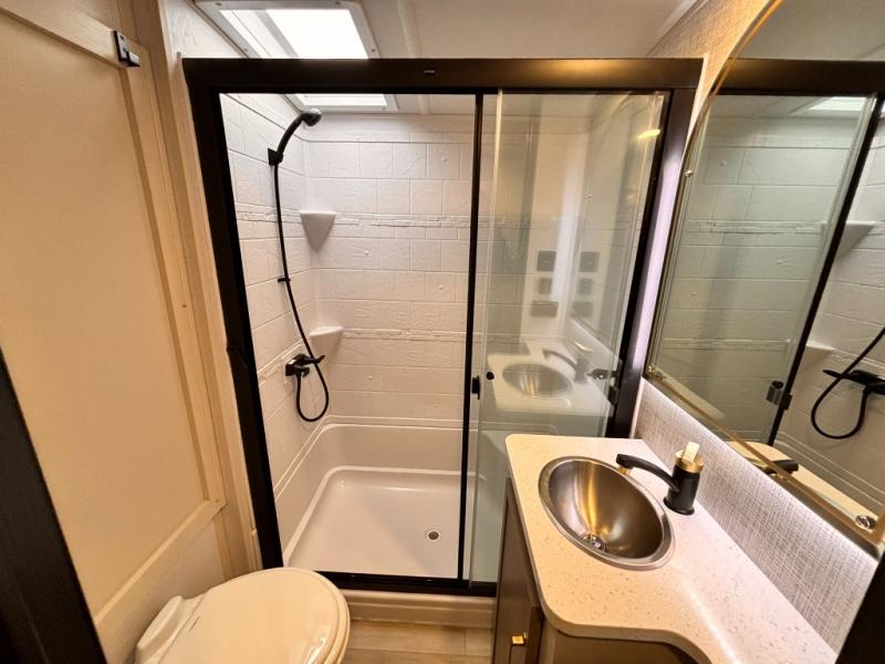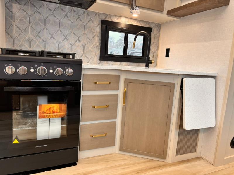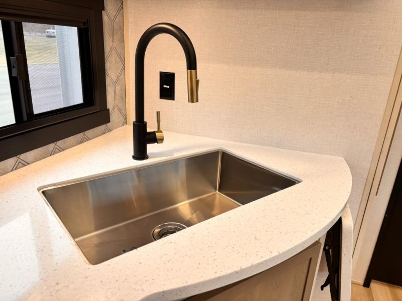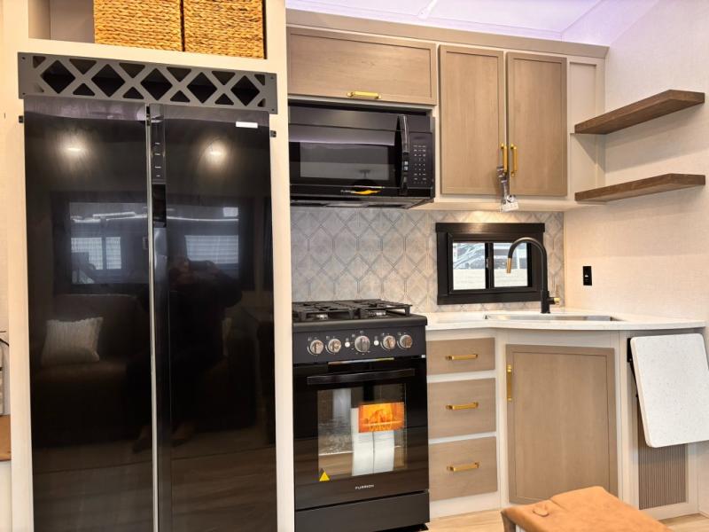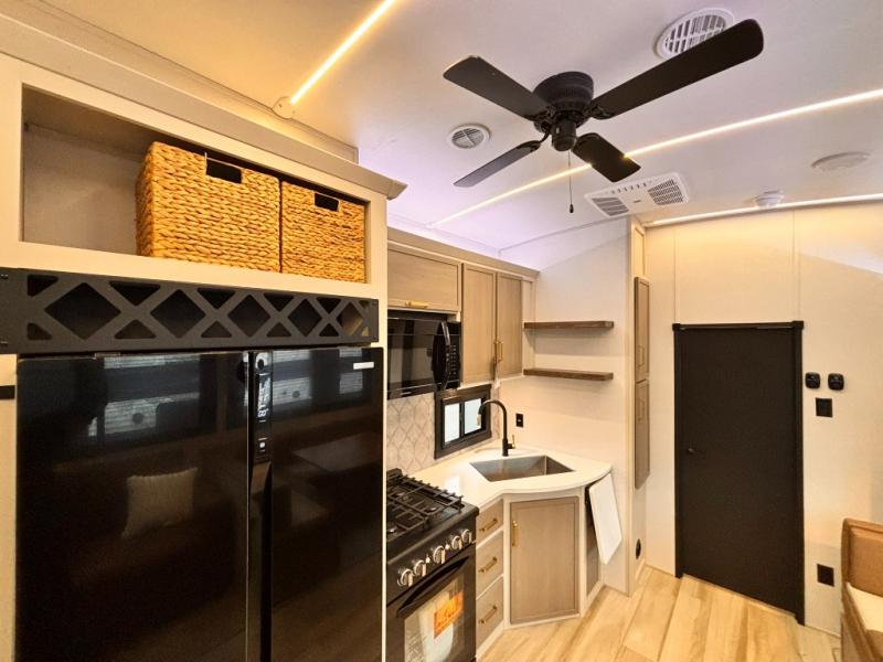 With any Wildwood Heritage Glen fifth wheel by Forest River, the quality construction, attention to detail and design along with a bright and welcoming interior allows you to relax in comfort with conveniences while exploring outdoors. The Summer Wind colored horizontal plank linoleum flooring is unique, beautiful and durable, and there are gold-accented faucets with stainless steel sinks in the bathrooms for added luxury. The Accessibelly underbelly with 12V tank heaters will help protect your unit from the elements, and the power stabilizer jacks and landing gear will make set-up a breeze. More features that provide convenience include the high-end solid surface countertops, an RV Airflow System that provides at least 25% better airflow, and solar prep for off-grid capabilities.