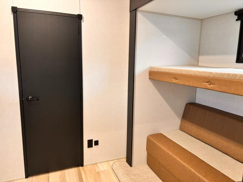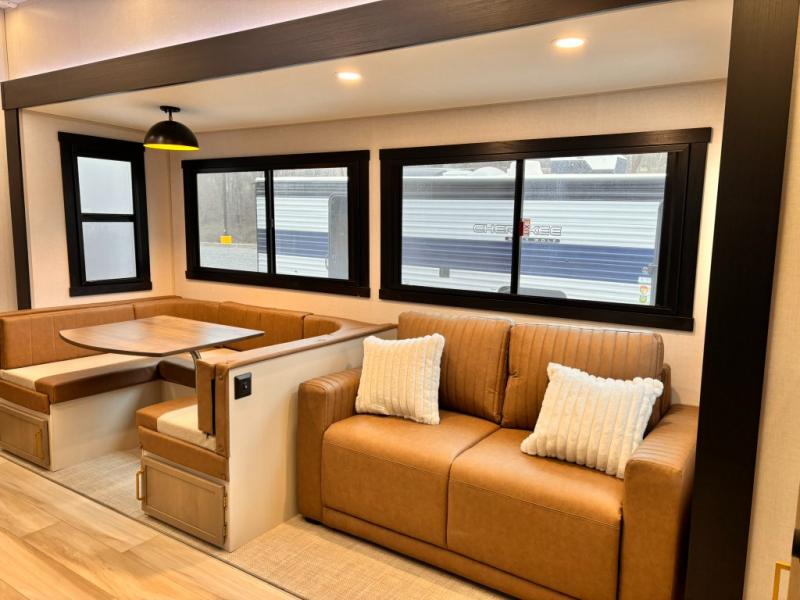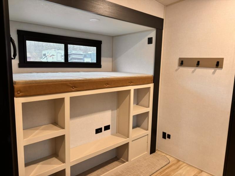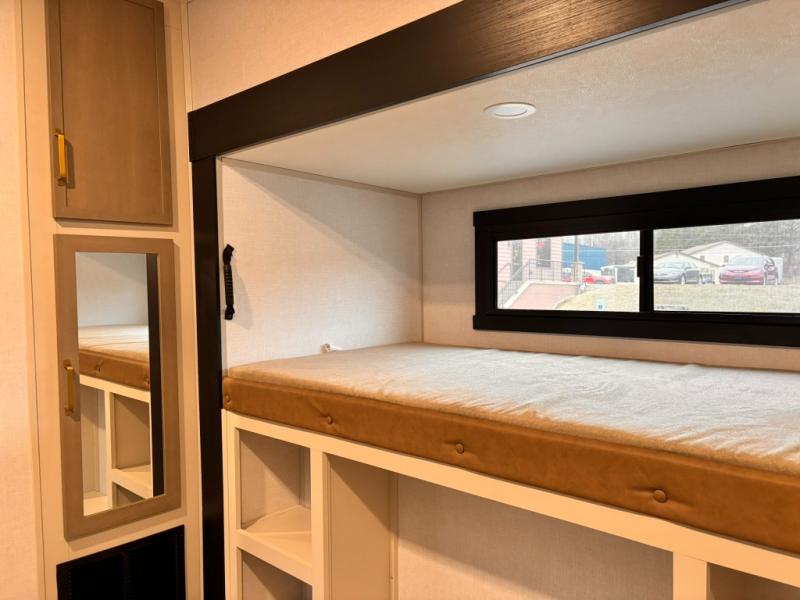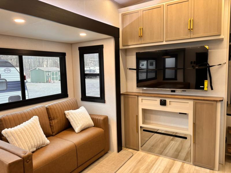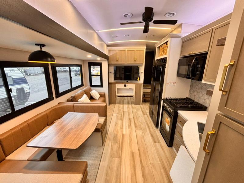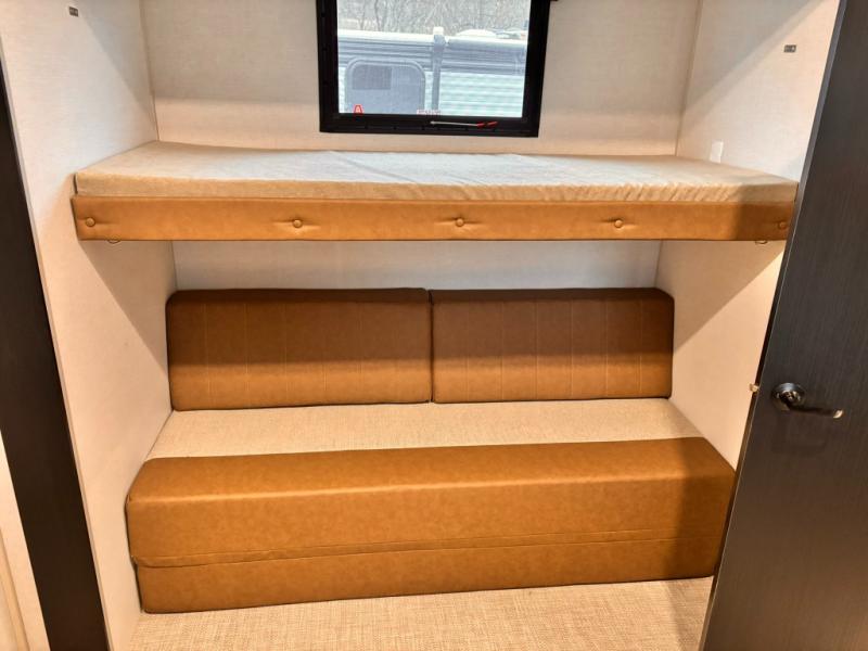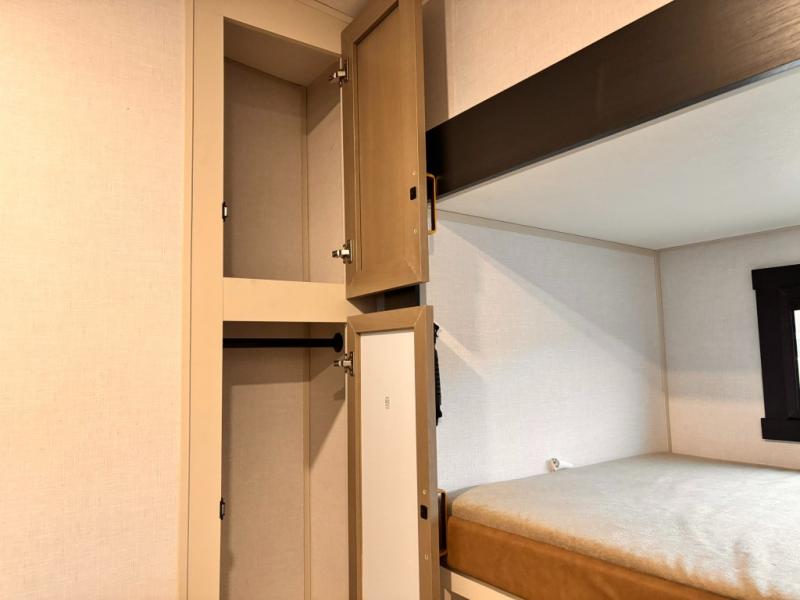 Not all fifth wheels are alike, and once you own this Wildwood Heritage Glen, you will understand! The rear entry into the second full bathroom allows the kids or your friends to enter and exit quickly to get back outside to the fun. They will also be able to shower and then enter their private bunkhouse that has two bunks, a convertible sofa bed, and two slides that offer lots of floor space to play. You will have your own oasis on the opposite side in the front private bedroom that has a custom king bed, a full-width wardrobe, and washer and dryer prep. The other full bathroom is only steps away from the main entrance and living area. The inside kitchen offers even more amenities, and the fourth slide provides a family U-shaped dinette and tri-fold sofa.