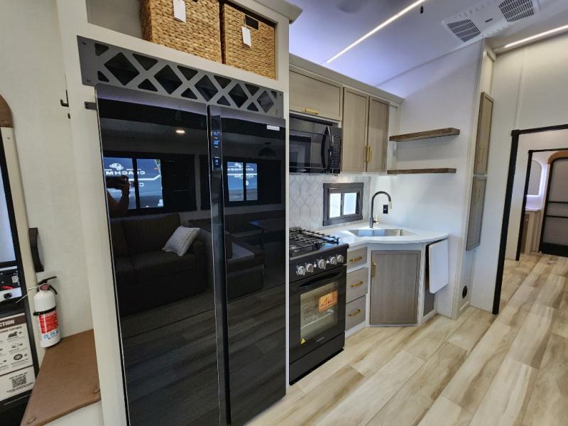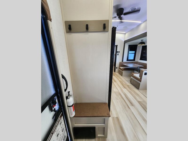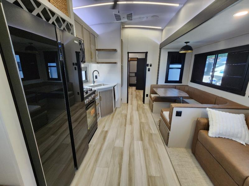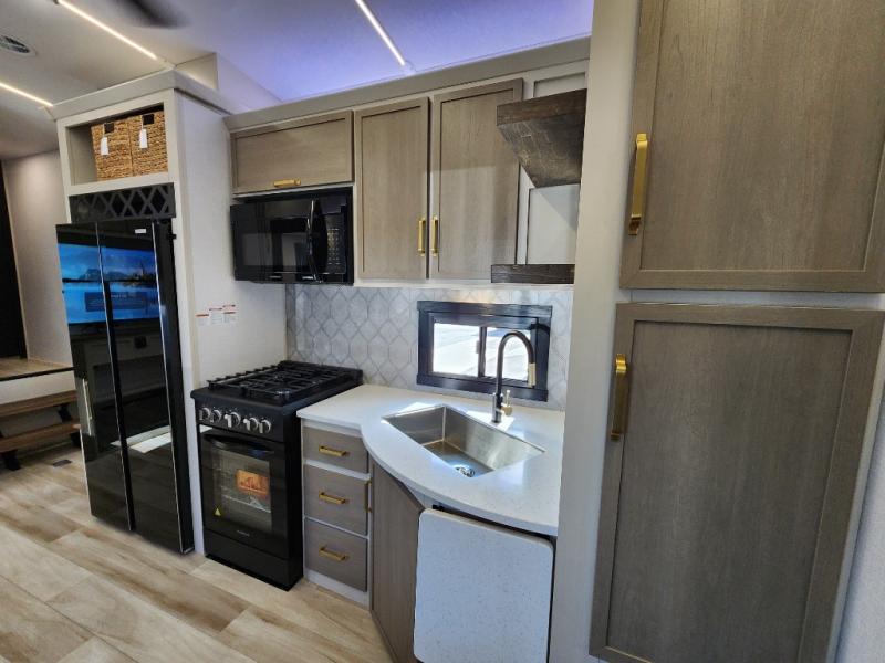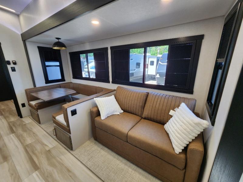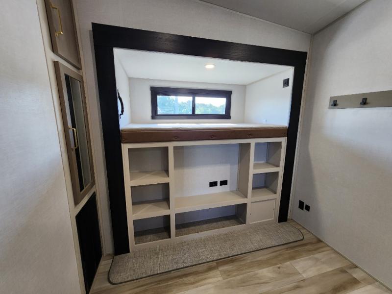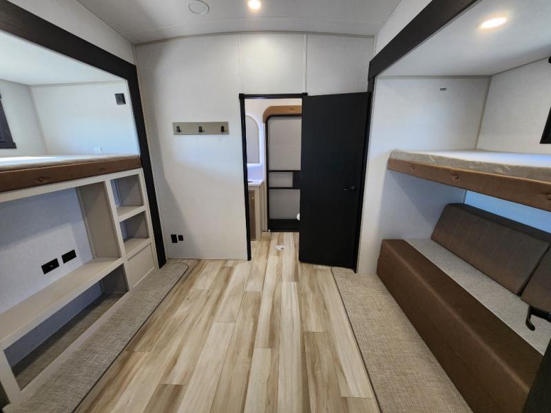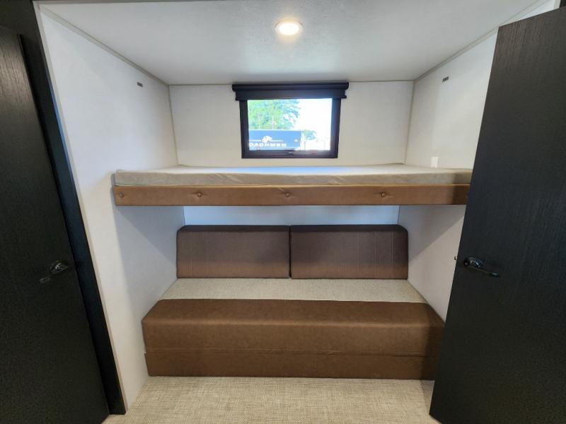 Not all fifth wheels are alike, and once you own this Wildwood Heritage Glen, you will understand! The rear entry into the second full bathroom allows the kids or your friends to enter and exit quickly to get back outside to the fun. They will also be able to shower and then enter their private bunkhouse that has two bunks, a convertible sofa bed, and two slides that offer lots of floor space to play. You will have your own oasis on the opposite side in the front private bedroom that has a custom king bed, a full-width wardrobe, and washer and dryer prep. The other full bathroom is only steps away from the main entrance and living area. The inside kitchen offers even more amenities, and the fourth slide provides a family U-shaped dinette and tri-fold sofa.