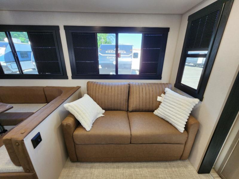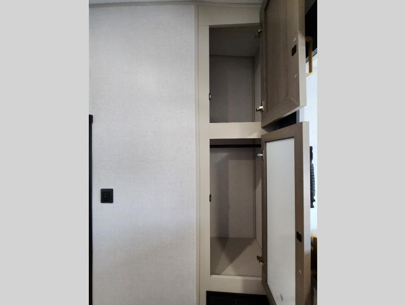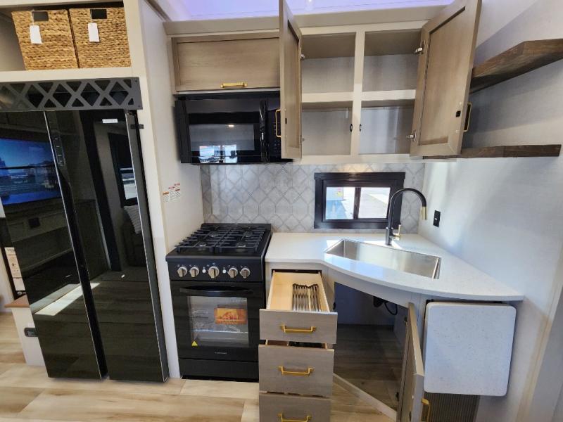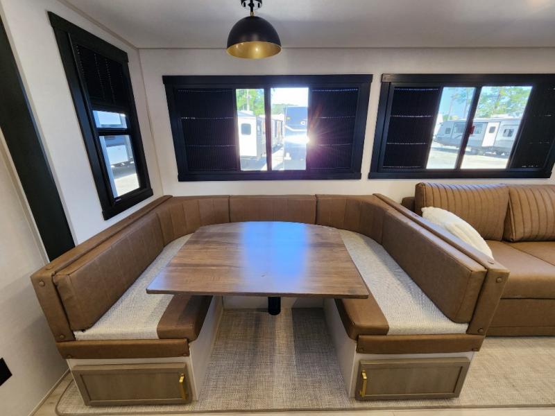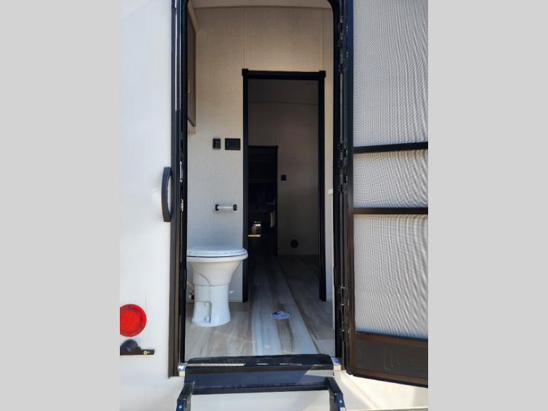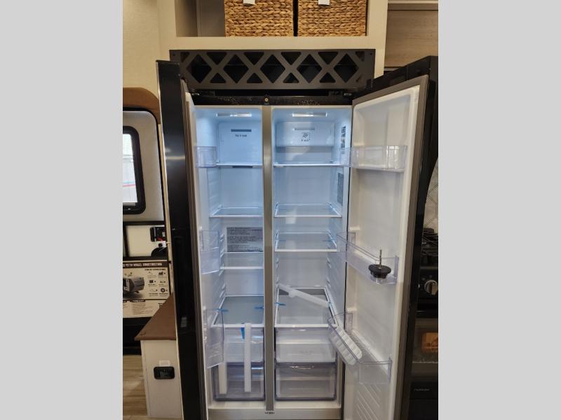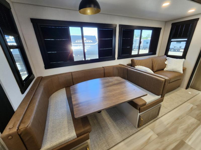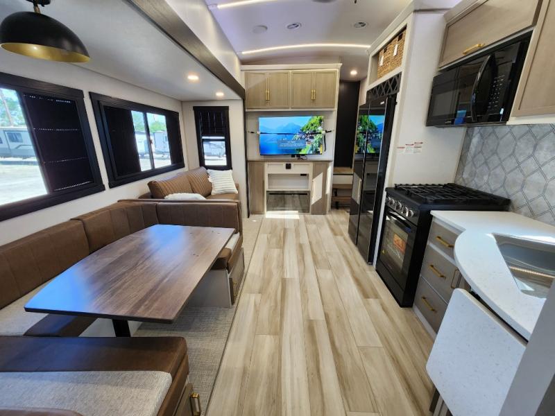 Not all fifth wheels are alike, and once you own this Wildwood Heritage Glen, you will understand! The rear entry into the second full bathroom allows the kids or your friends to enter and exit quickly to get back outside to the fun. They will also be able to shower and then enter their private bunkhouse that has two bunks, a convertible sofa bed, and two slides that offer lots of floor space to play. You will have your own oasis on the opposite side in the front private bedroom that has a custom king bed, a full-width wardrobe, and washer and dryer prep. The other full bathroom is only steps away from the main entrance and living area. The inside kitchen offers even more amenities, and the fourth slide provides a family U-shaped dinette and tri-fold sofa.