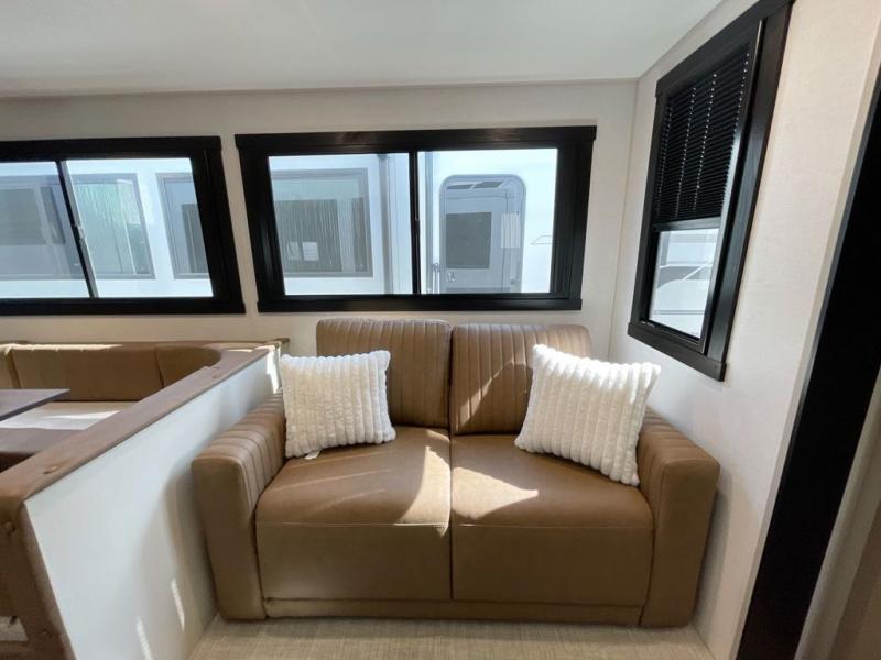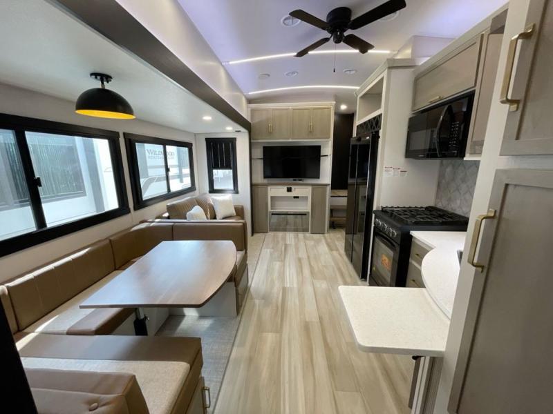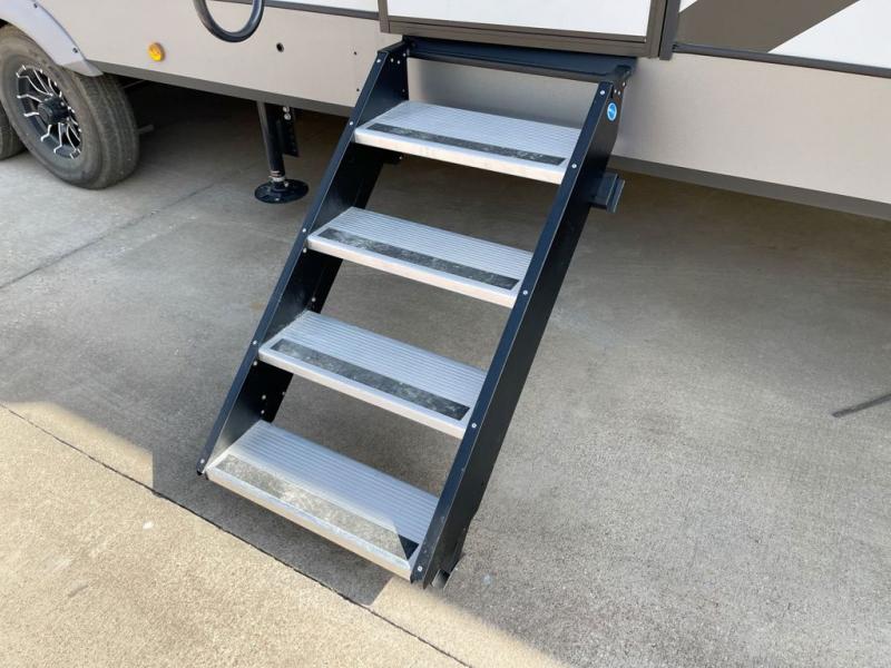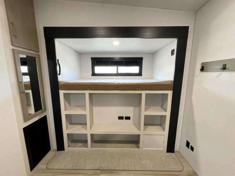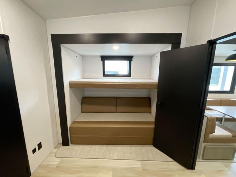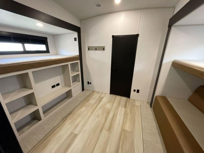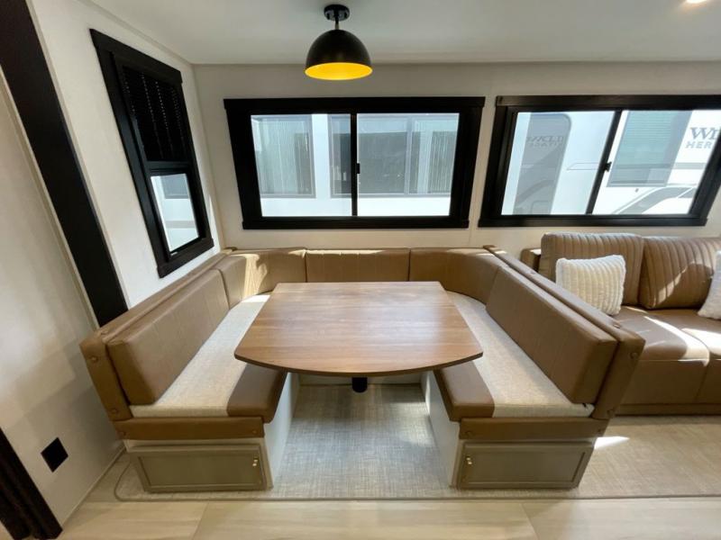 Not all fifth wheels are alike, and once you own this Wildwood Heritage Glen, you will understand! The rear entry into the second full bathroom allows the kids or your friends to enter and exit quickly to get back outside to the fun. They will also be able to shower and then enter their private bunkhouse that has two bunks, a convertible sofa bed, and two slides that offer lots of floor space to play. You will have your own oasis on the opposite side in the front private bedroom that has a custom king bed, a full-width wardrobe, and washer and dryer prep. The other full bathroom is only steps away from the main entrance and living area. The inside kitchen offers even more amenities, and the fourth slide provides a family U-shaped dinette and tri-fold sofa.