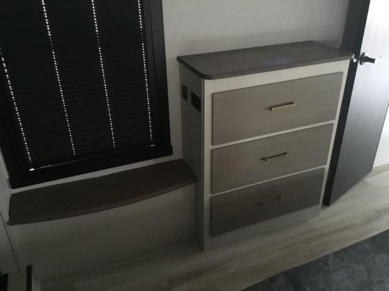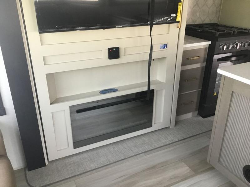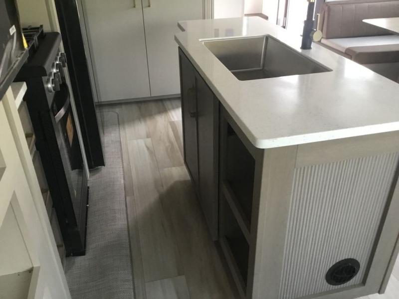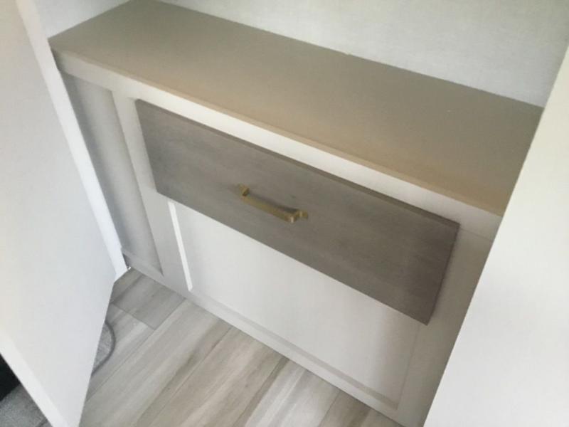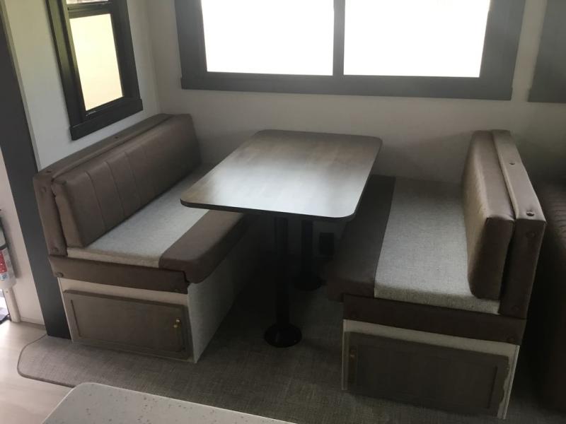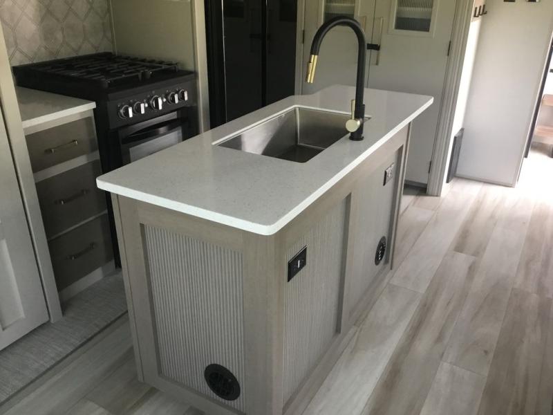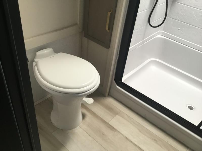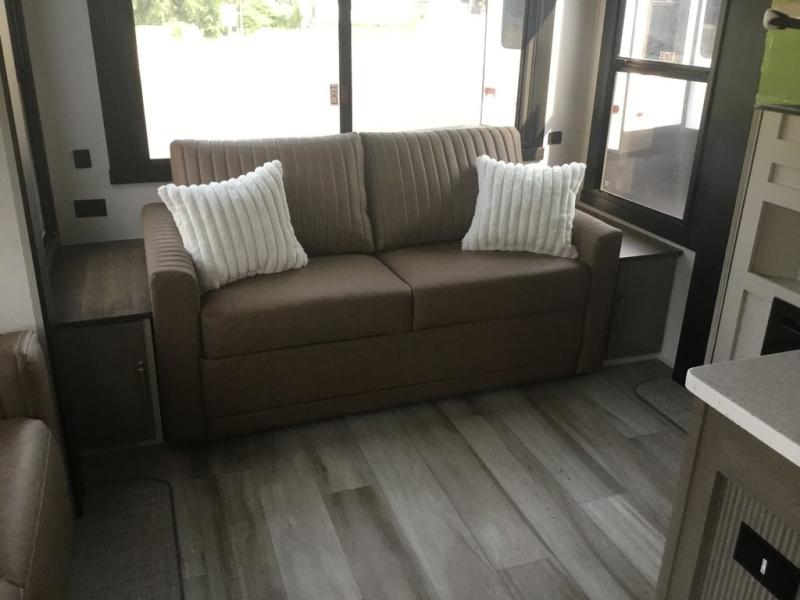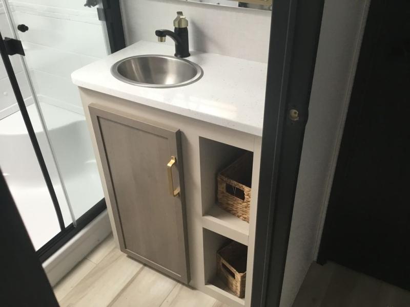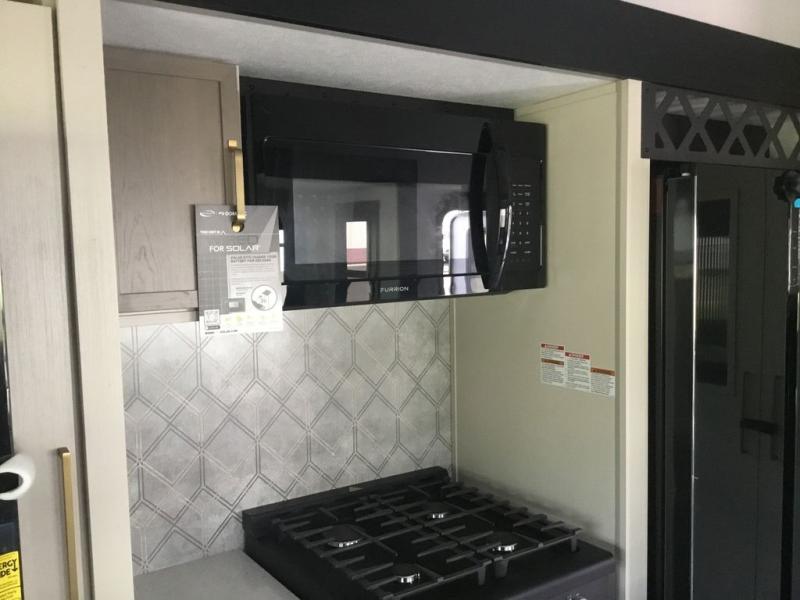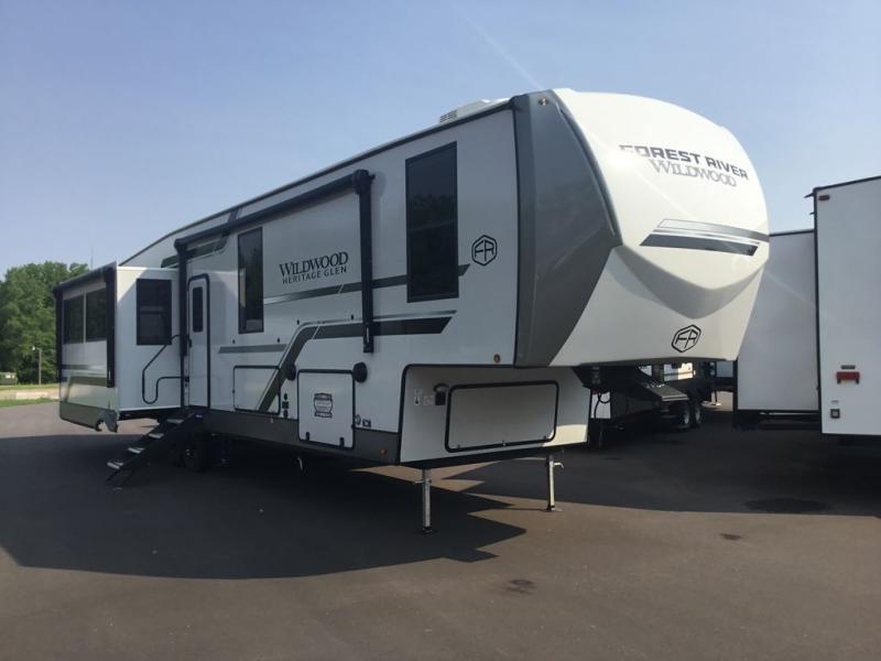 With any Wildwood Heritage Glen fifth wheel by Forest River, the quality construction, attention to detail and design along with a bright and welcoming interior allows you to relax in comfort with conveniences while exploring outdoors. The Summer Wind colored horizontal plank linoleum flooring is unique, beautiful and durable, and there are gold-accented faucets with stainless steel sinks in the bathrooms for added luxury. The Accessibelly underbelly with 12V tank heaters will help protect your unit from the elements, and the power stabilizer jacks and landing gear will make set-up a breeze. More features that provide convenience include the high-end solid surface countertops, an RV Airflow System that provides at least 25% better airflow, and solar prep for off-grid capabilities.