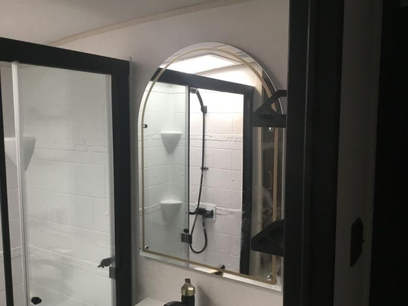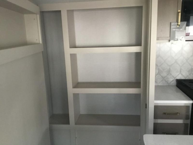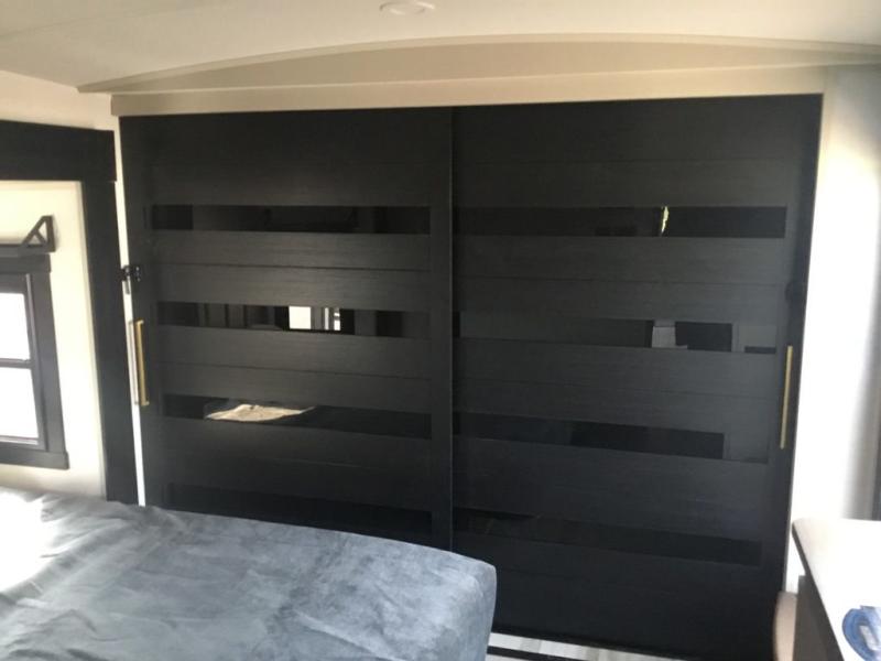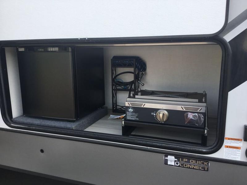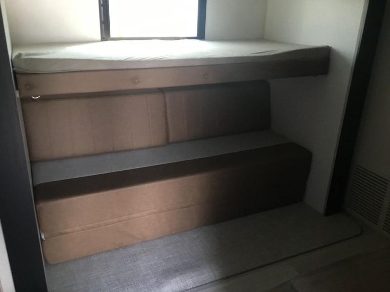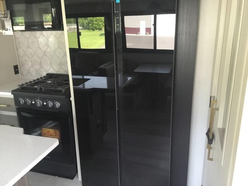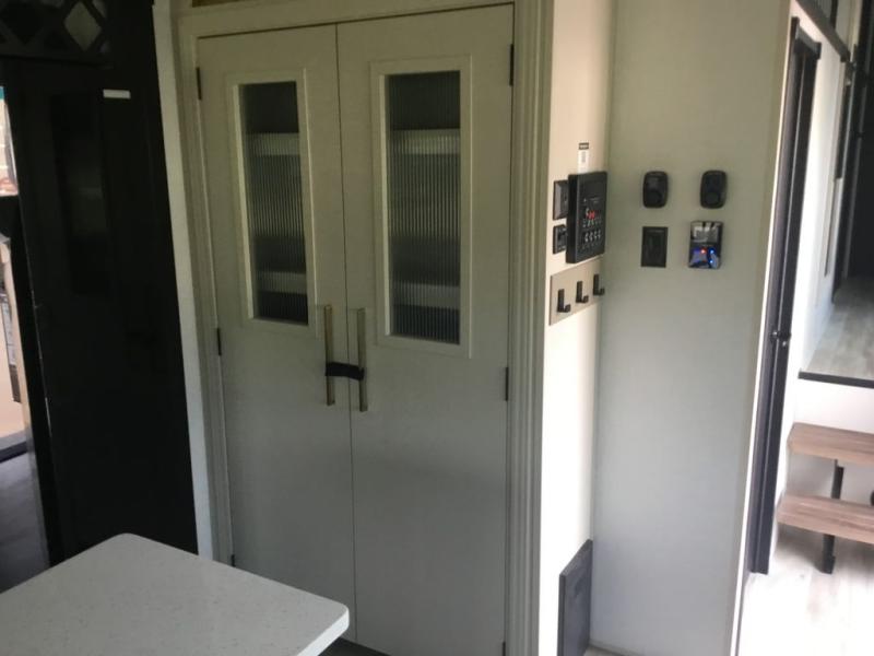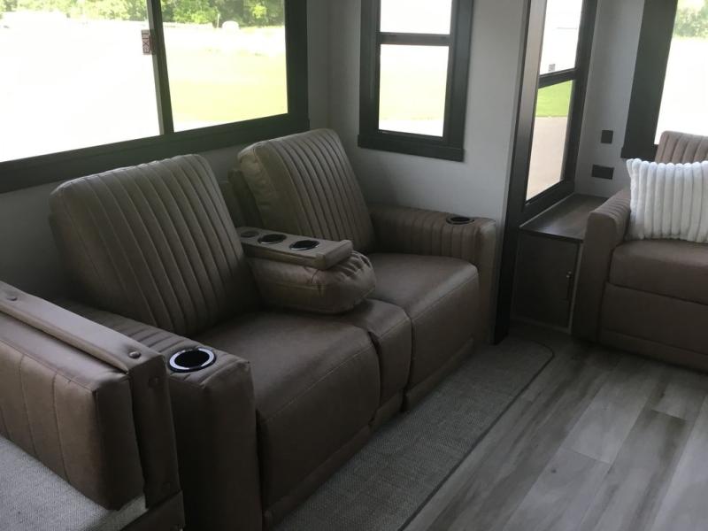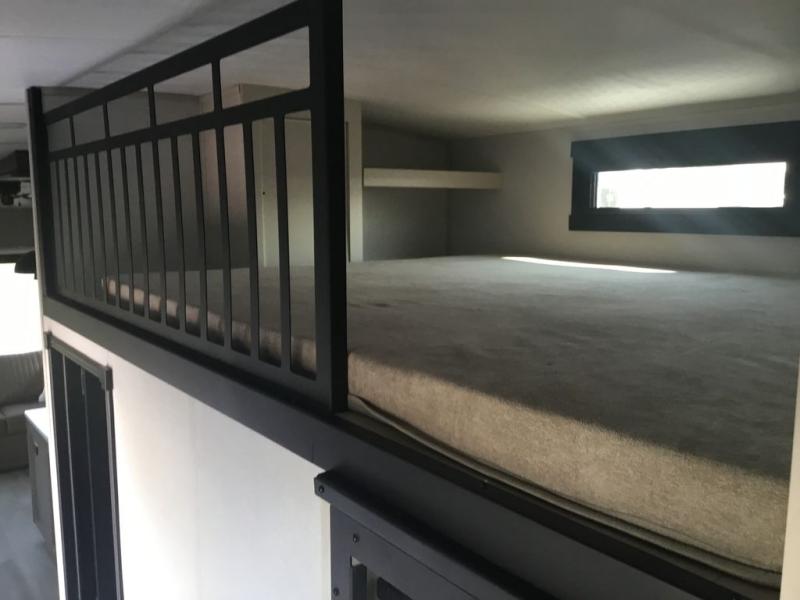 Imagine having your own master bedroom with a custom king bed, a full-width wardrobe, plus washer and dryer prep in this Wildwood Heritage Glen fifth wheel. You might even use the bench to put on your slippers before heading to the bathroom to get cleaned up in the residential walk-in shower. Your kids or friends can sleep in the middle bunkhouse that has a flip-up bunk, a Versa queen convertible sofa bed, and a loft above. You might also utilize this room as an office thanks to the desk. The chef will love all the appliances, the kitchen island, the deluxe French door pantry, and the 16 cu. ft. 12V refrigerator. There is also plenty of seating on all the furniture, and the cupholders in the theatre seats are handy.