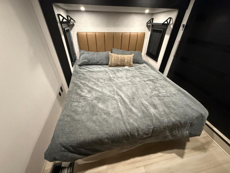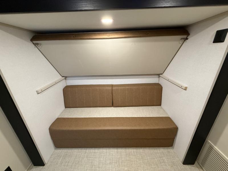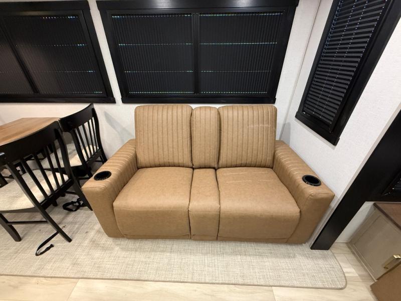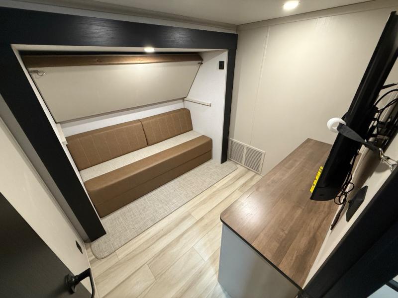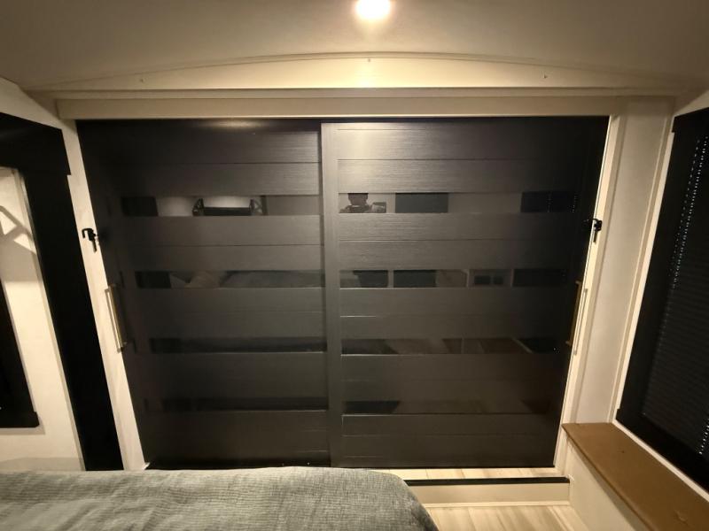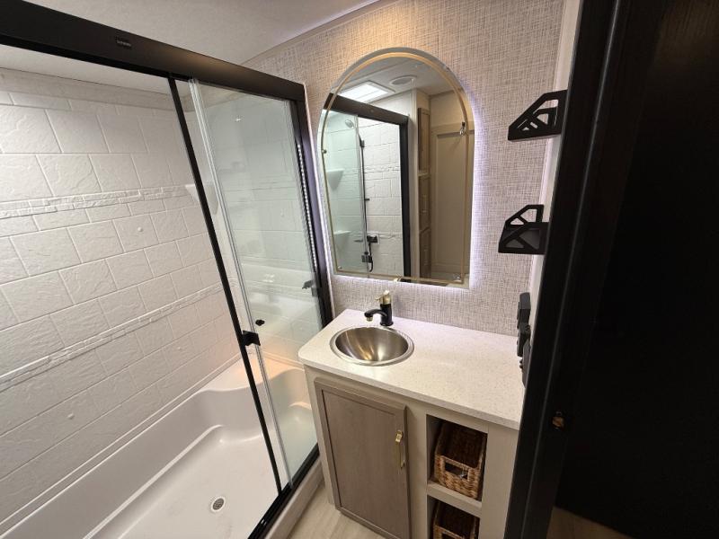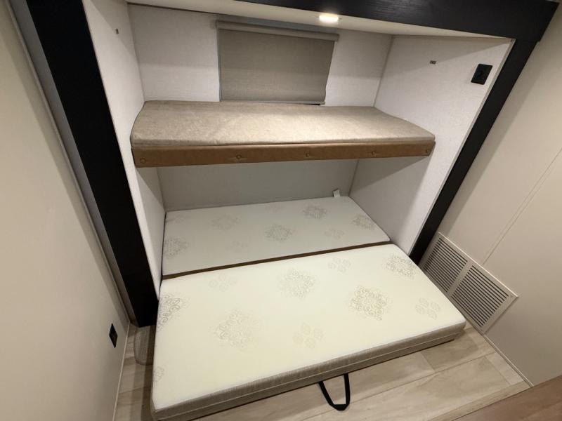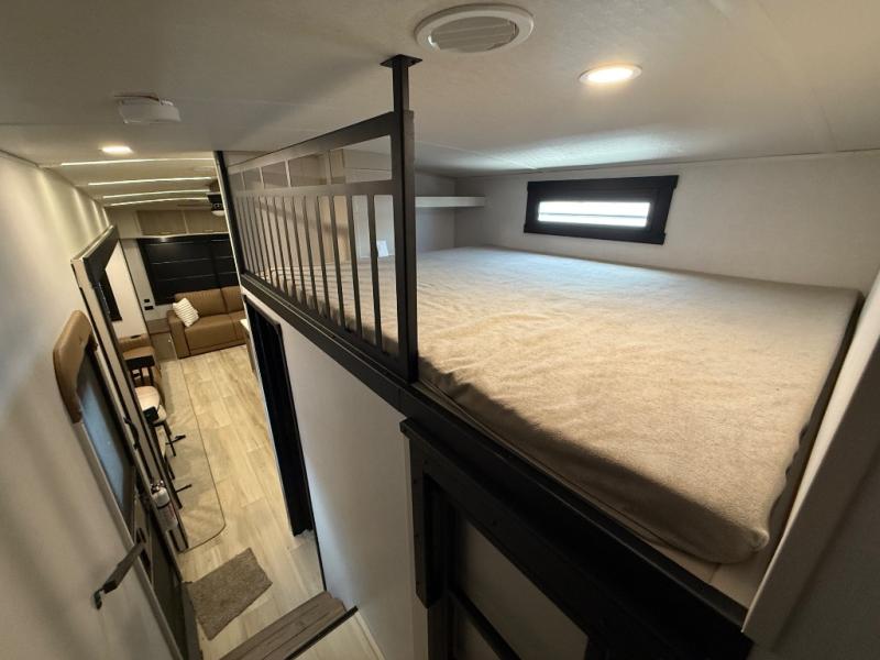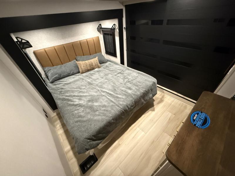 Imagine having your own master bedroom with a custom king bed with Versa Tilt, a full-width wardrobe, plus washer and dryer prep in this Wildwood Heritage Glen fifth wheel. You might even use the bench to put on your slippers before heading to the bathroom to get cleaned up in the residential walk-in shower. Your kids or friends can sleep in the middle bunkhouse that has a flip-up bunk, a Versa queen convertible sofa bed, and a loft above. You might also utilize this room as an office thanks to the desk. The chef will love all the appliances, the kitchen island, the deluxe French door pantry, and the 16 cu. ft. 12V refrigerator. There is also plenty of seating on all the furniture, and the cupholders in the theatre seats are handy.