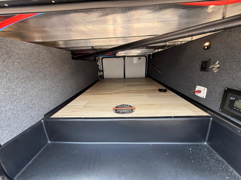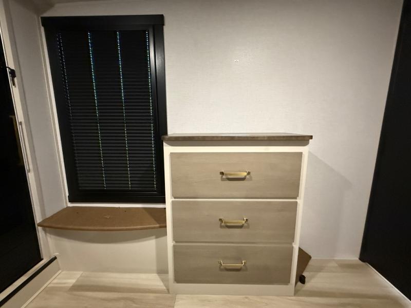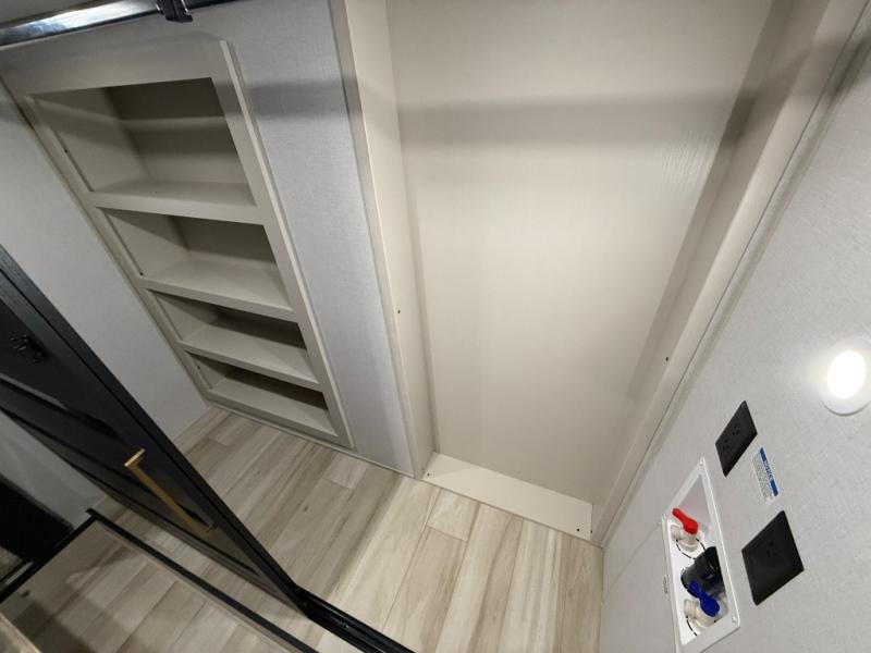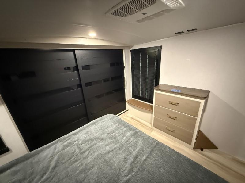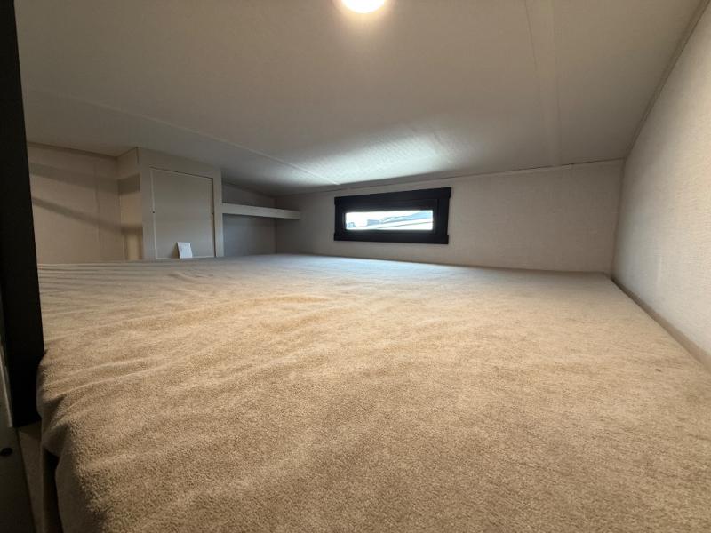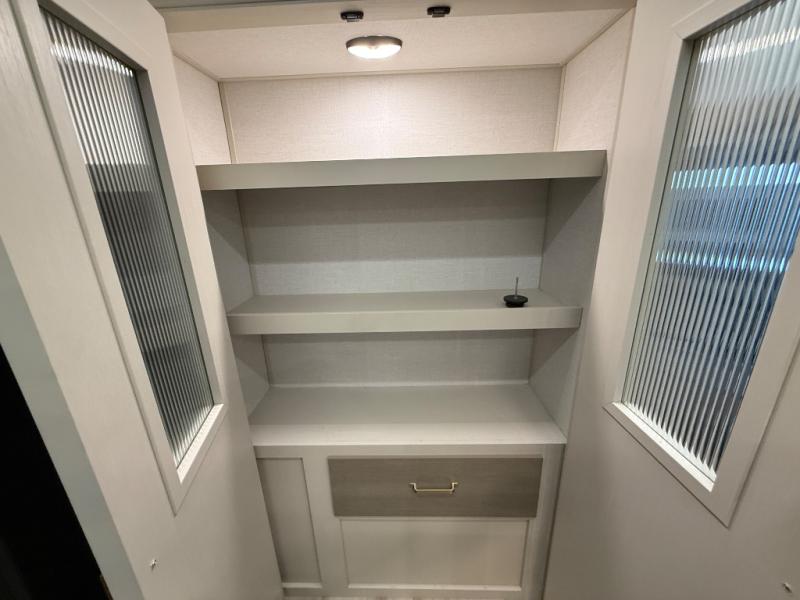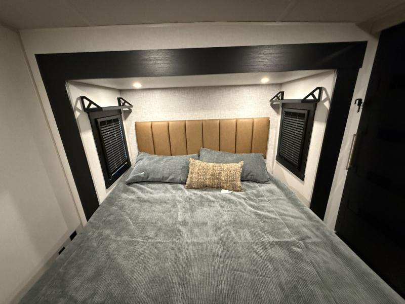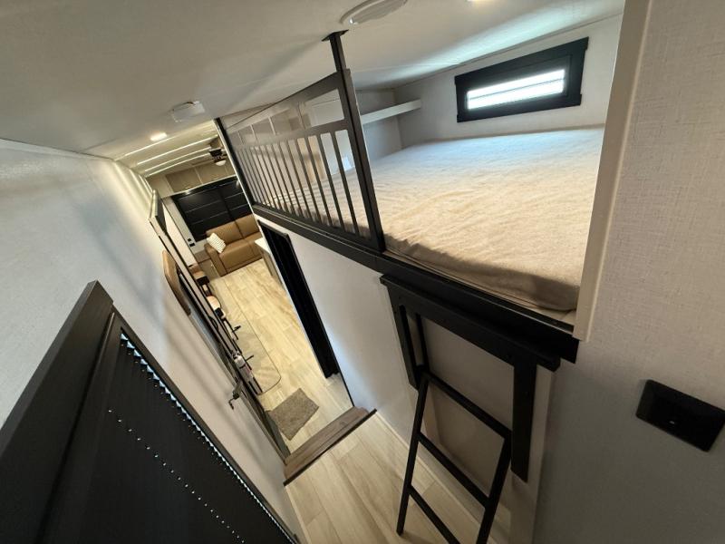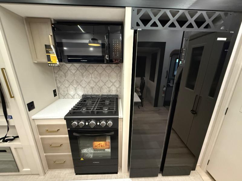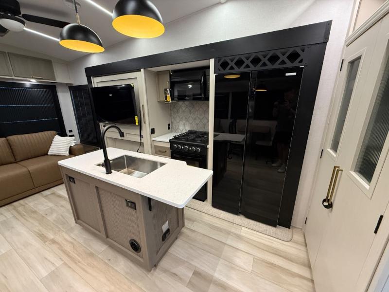 Imagine having your own master bedroom with a custom king bed with Versa Tilt, a full-width wardrobe, plus washer and dryer prep in this Wildwood Heritage Glen fifth wheel. You might even use the bench to put on your slippers before heading to the bathroom to get cleaned up in the residential walk-in shower. Your kids or friends can sleep in the middle bunkhouse that has a flip-up bunk, a Versa queen convertible sofa bed, and a loft above. You might also utilize this room as an office thanks to the desk. The chef will love all the appliances, the kitchen island, the deluxe French door pantry, and the 16 cu. ft. 12V refrigerator. There is also plenty of seating on all the furniture, and the cupholders in the theatre seats are handy.