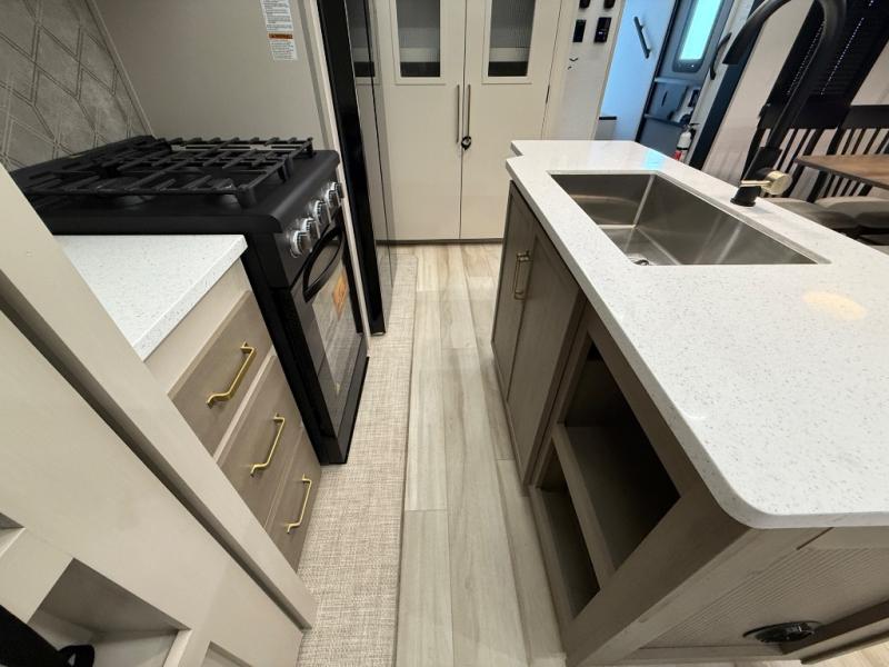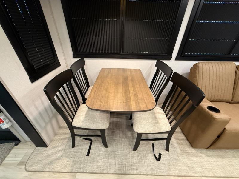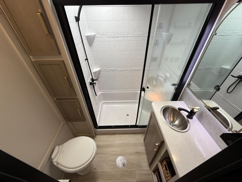 With any Wildwood Heritage Glen fifth wheel by Forest River, the quality construction, attention to detail and design along with a bright and welcoming interior allows you to relax in comfort with conveniences while exploring outdoors. The European Oak colored horizontal plank linoleum flooring is unique, beautiful and durable, and there are gold-accented faucets with stainless steel sinks in the bathrooms for added luxury. The Accessibelly underbelly with 12V tank heaters on all holding tanks allows you to camp anytime of year, and the power stabilizer jacks and landing gear will make set-up a breeze. More features that provide convenience include the high-end solid surface countertops, an RV Airflow System that provides at least 25% better airflow, an automotive grade painted front cap with a gel coat, and solar prep for off-grid capabilities.