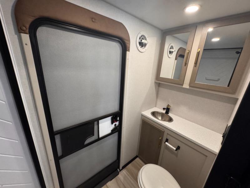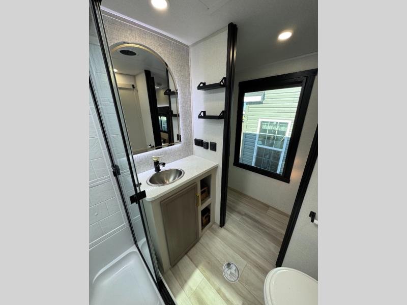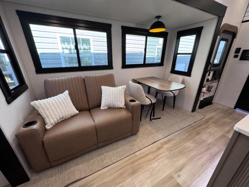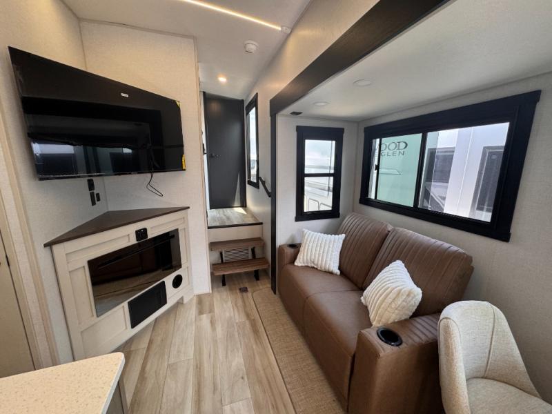 With any Wildwood Heritage Glen fifth wheel by Forest River, the quality construction, attention to detail and design along with a bright and welcoming interior allows you to relax in comfort with conveniences while exploring outdoors. The Summer Wind colored horizontal plank linoleum flooring is unique, beautiful and durable, and there are gold-accented faucets with stainless steel sinks in the bathrooms for added luxury. The Accessibelly underbelly with 12V tank heaters on all holding tanks allows you to camp anytime of year, and the power stabilizer jacks and landing gear will make set-up a breeze. More features that provide convenience include the high-end solid surface countertops, an RV Airflow System that provides at least 25% better airflow, and solar prep for off-grid capabilities.