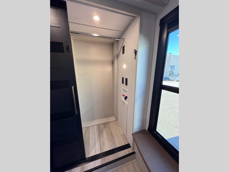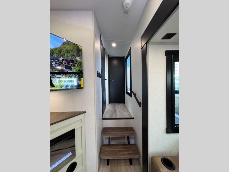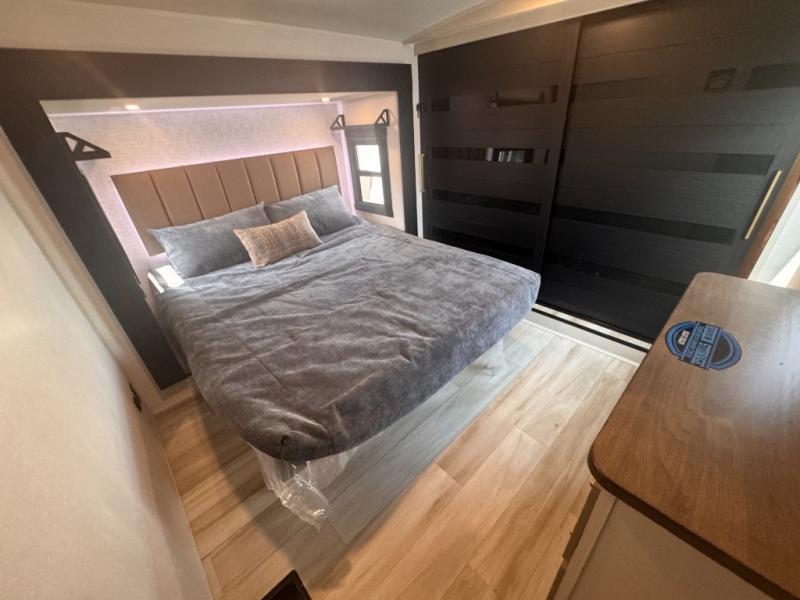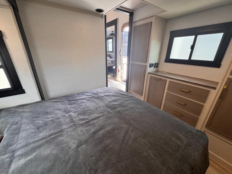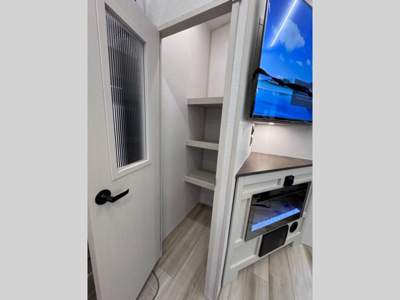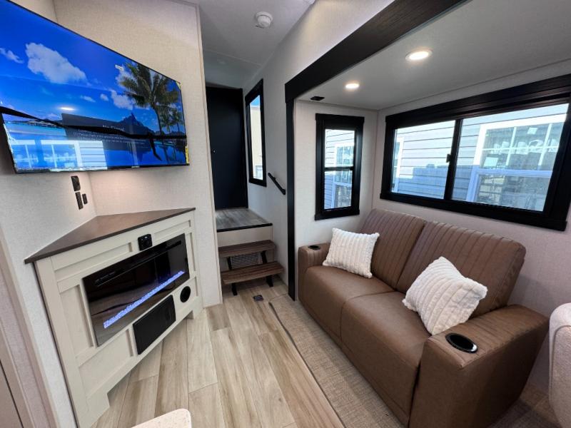 You can't beat this fifth wheel that has just about everything you could need for camping trips! There are two private bedrooms; one up front with a custom king bed with and one in the back with a custom queen bed and its own full rear bath. You'll also find the second entry door located in the rear bathroom for added convenience! The kids are sure to love the loft with a ladder, two bunk mats, plus storage, or you can utilize this space for just storage if you don't have any guests staying over. The middle living area will be the perfect place to meet together since there are dual opposing slides for added space, theater seating and a table and chairs, plus a large kitchen island that will bring the whole room together. There is even a fireplace for a more cozy feel and a walk-in pantry to keep snacks