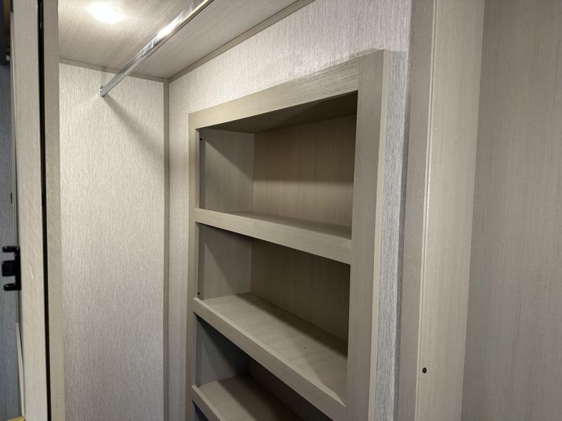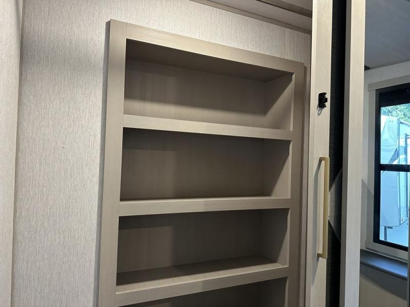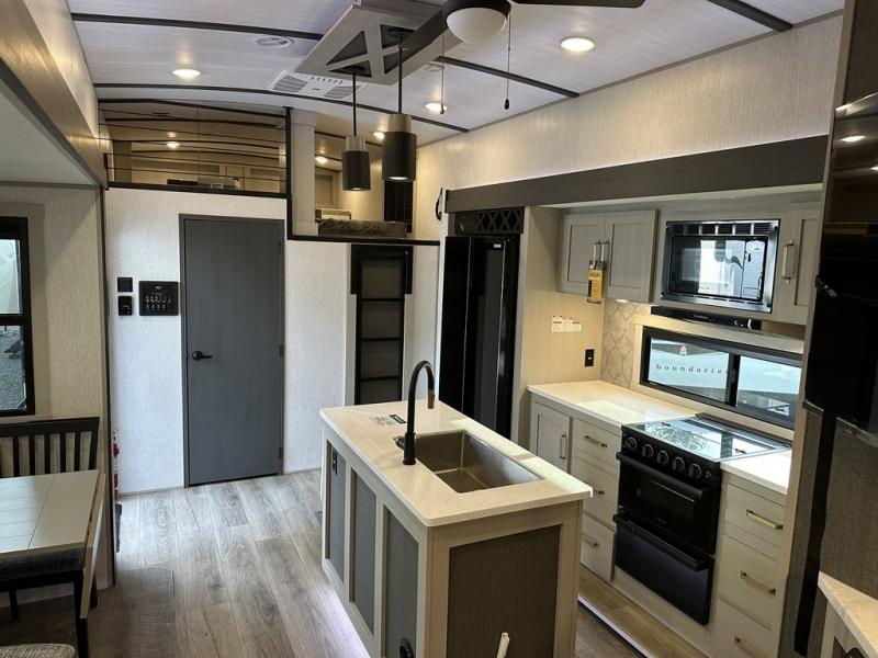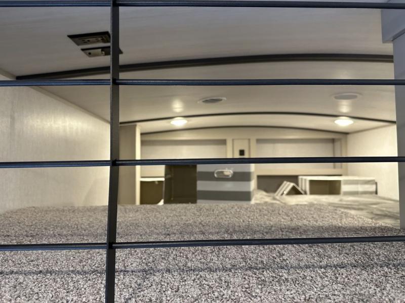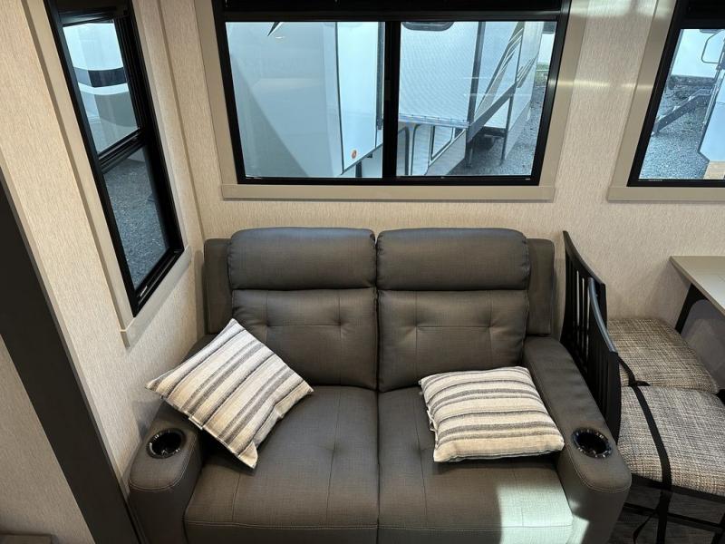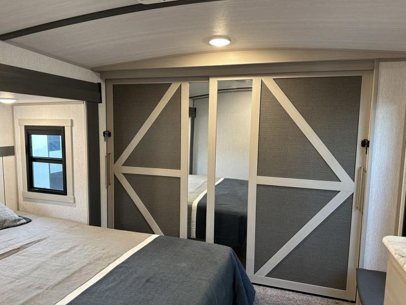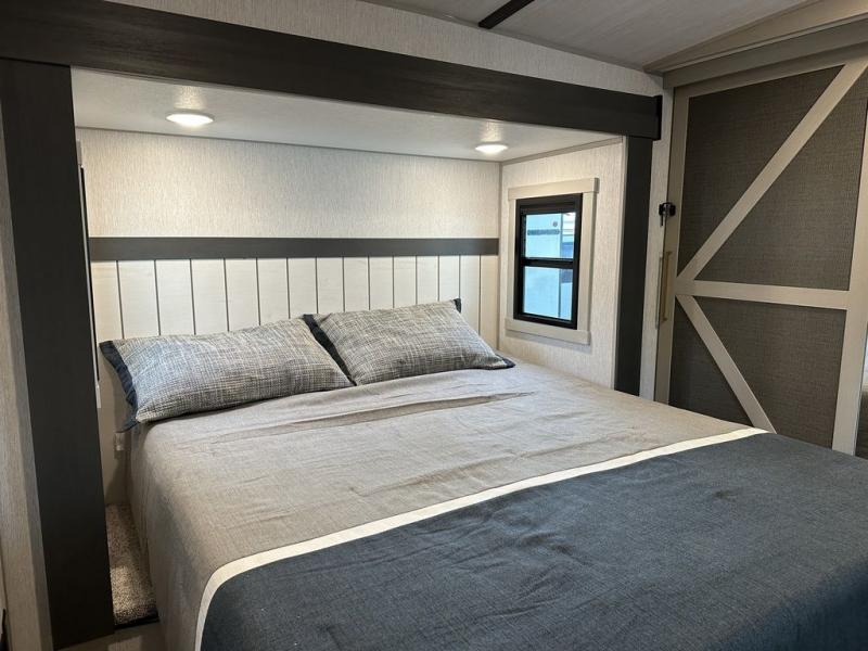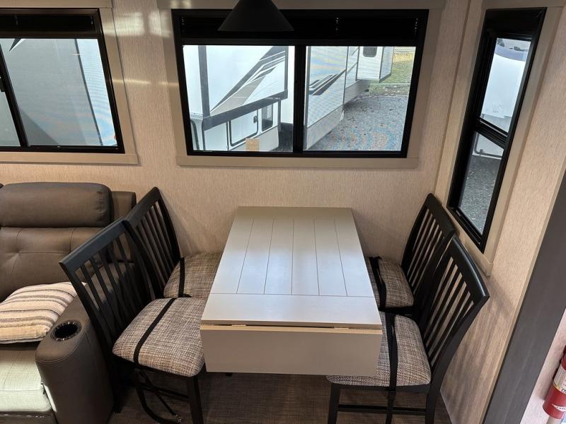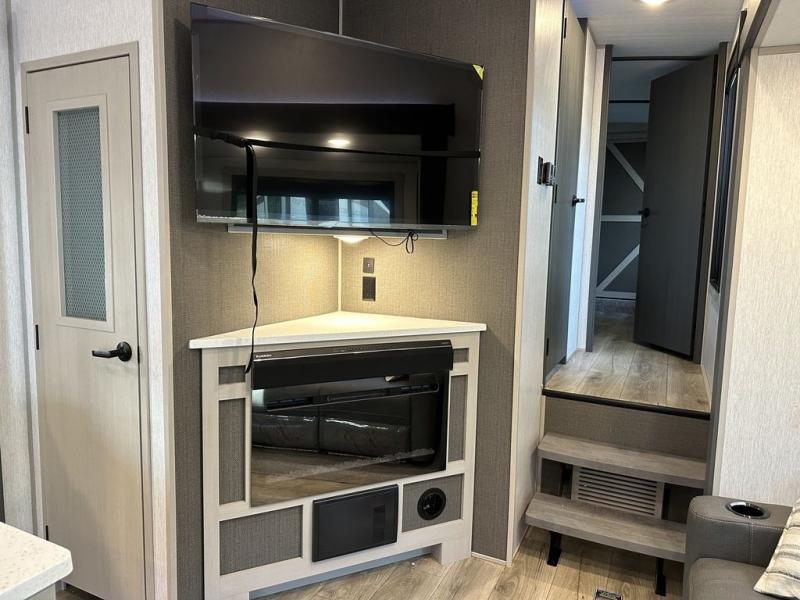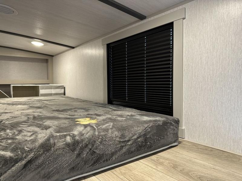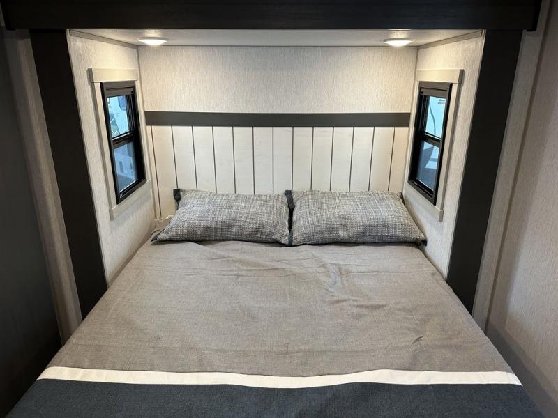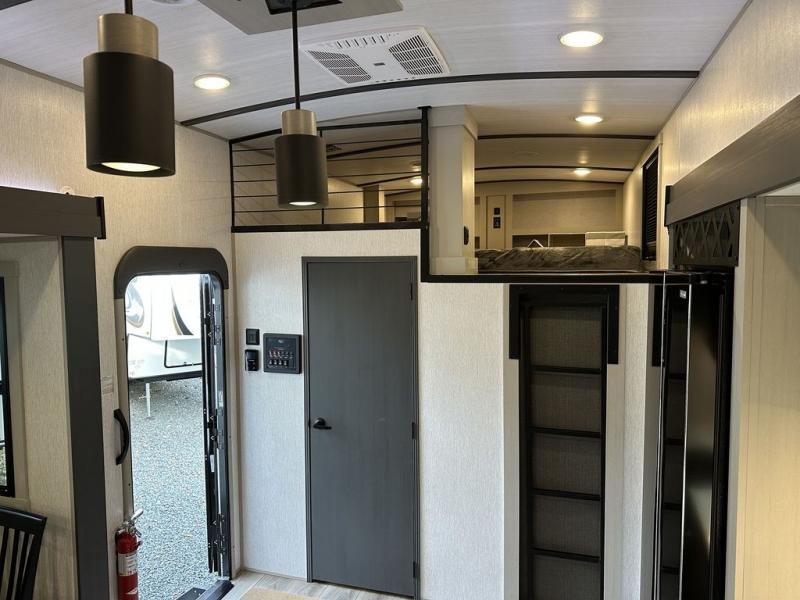 You can't beat this fifth wheel that has just about everything you could need for camping trips! There are two private bedrooms; one up front with a custom king bed with and one in the back with a custom queen bed and its own full rear bath. You'll also find the second entry door located in the rear bathroom for added convenience! The kids are sure to love the loft with a ladder, two bunk mats, plus storage, or you can utilize this space for just storage if you don't have any guests staying over. The middle living area will be the perfect place to meet together since there are dual opposing slides for added space, theater seating and a table and chairs, plus a large kitchen island that will bring the whole room together. There is even a fireplace for a more cozy feel and a walk-in pantry to keep snacks