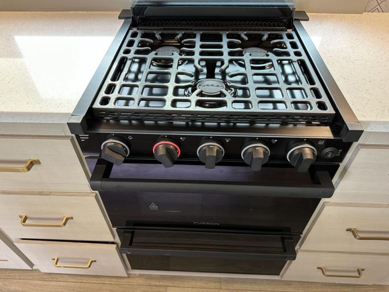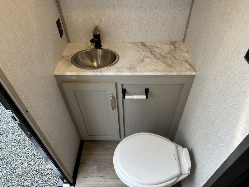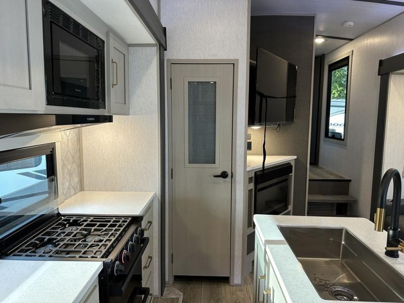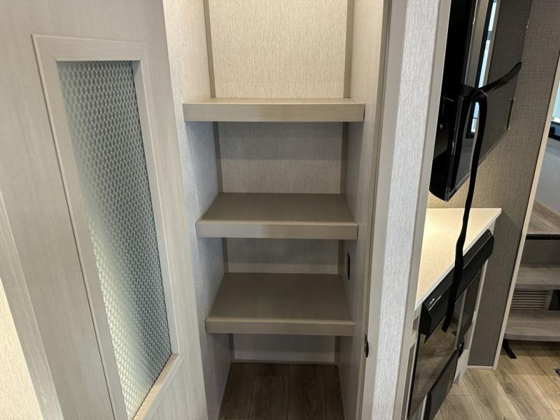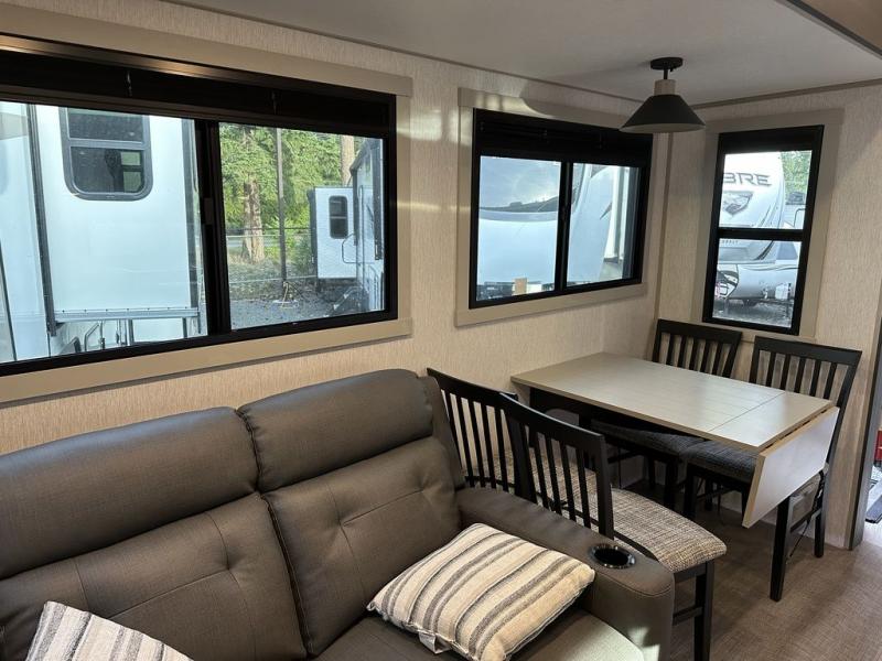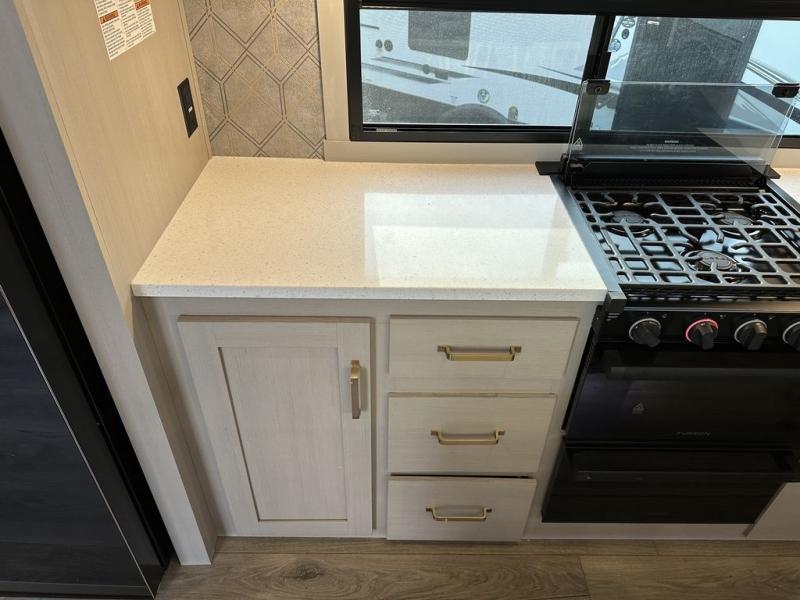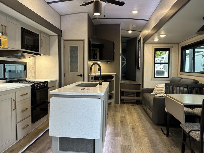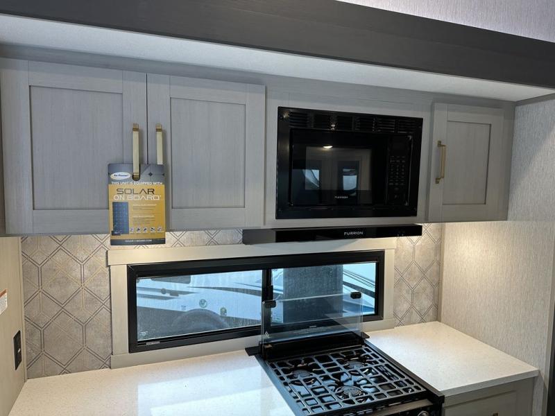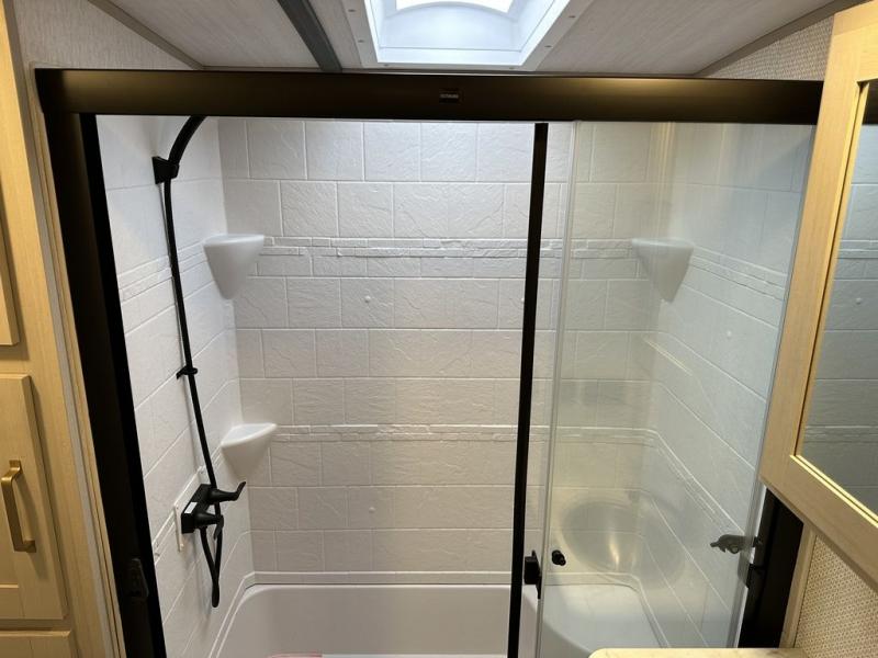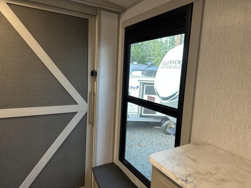 With any Wildwood Heritage Glen fifth wheel by Forest River, the quality construction, attention to detail and design along with a bright and welcoming interior allows you to relax in comfort with conveniences while exploring outdoors. The Summer Wind colored horizontal plank linoleum flooring is unique, beautiful and durable, and there are gold-accented faucets with stainless steel sinks in the bathrooms for added luxury. The Accessibelly underbelly with 12V tank heaters will help protect your unit from the elements, and the power stabilizer jacks and landing gear will make set-up a breeze. More features that provide convenience include the high-end solid surface countertops, an RV Airflow System that provides at least 25% better airflow, and solar prep for off-grid capabilities.