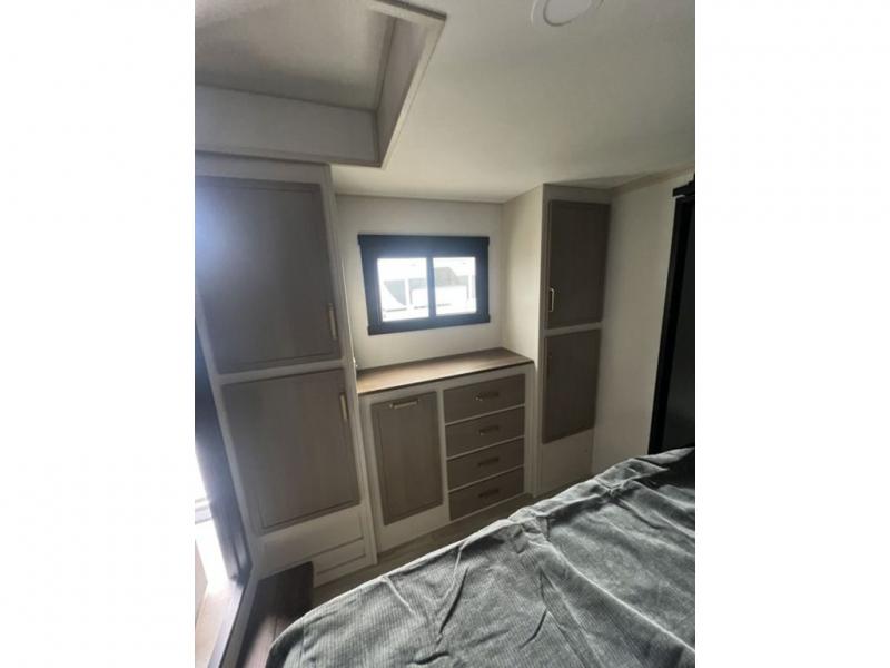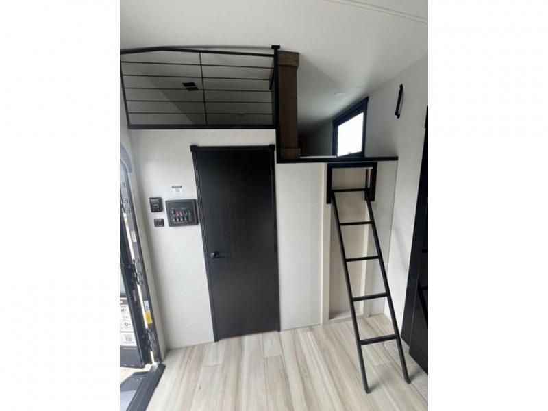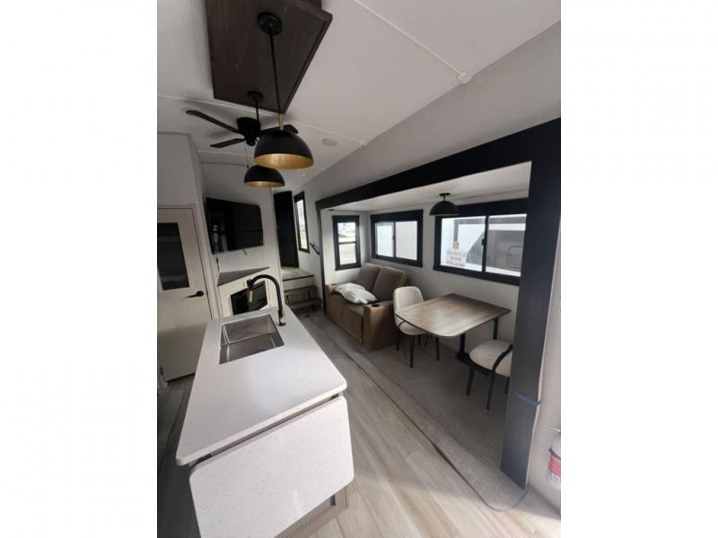 You can't beat this fifth wheel that has just about everything you could need for camping trips! There are two private bedrooms; one up front with a custom king bed with and one in the back with a custom queen bed and its own full rear bath. You'll also find the second entry door located in the rear bathroom for added convenience! The kids are sure to love the loft with a ladder, two bunk mats, plus storage, or you can utilize this space for just storage if you don't have any guests staying over. The middle living area will be the perfect place to meet together since there are dual opposing slides for added space, theater seating and a table and chairs, plus a large kitchen island that will bring the whole room together. There is even a fireplace for a more cozy feel and a walk-in pantry to keep snacks