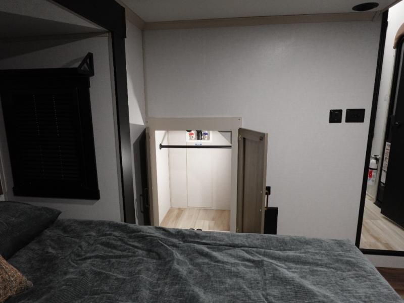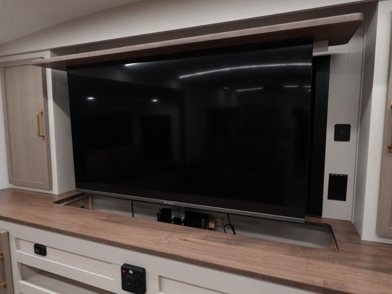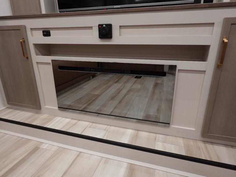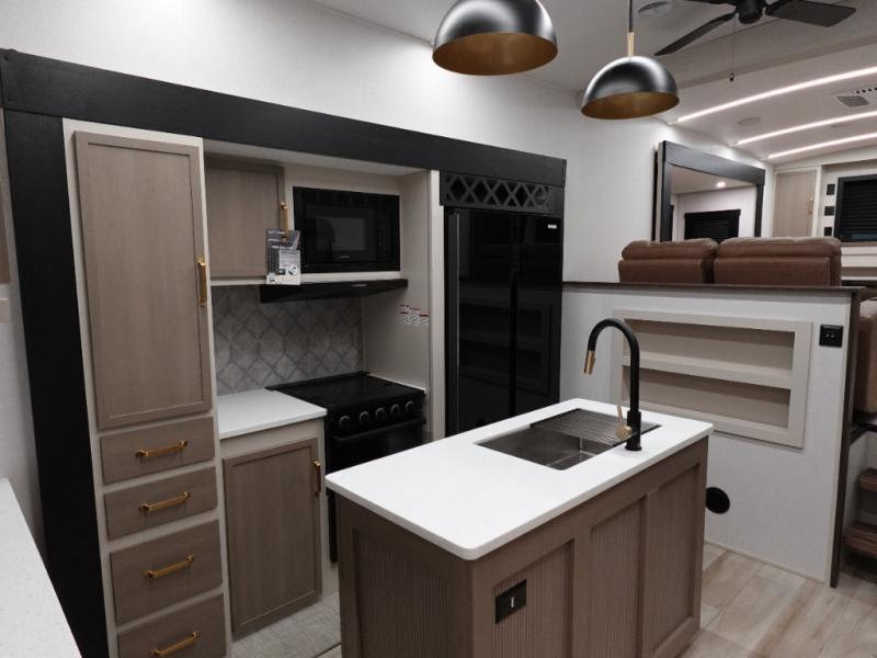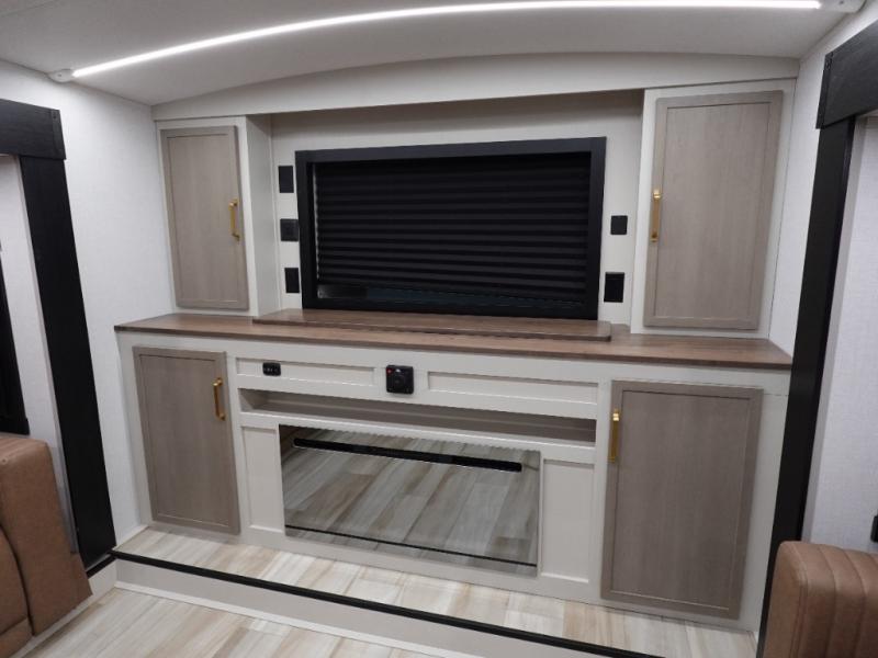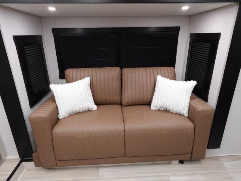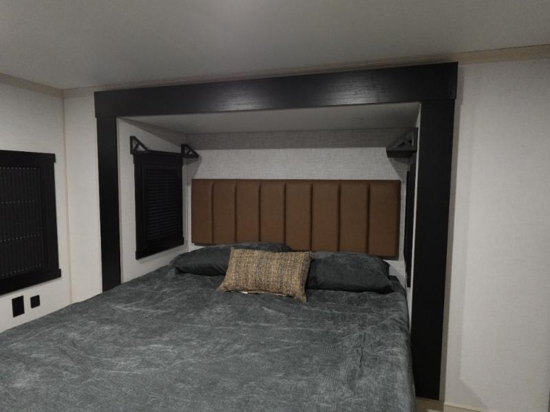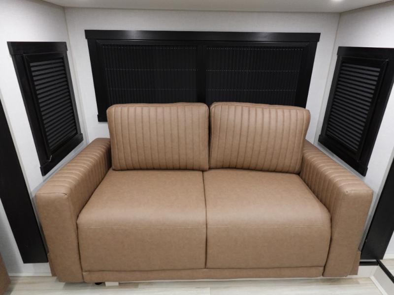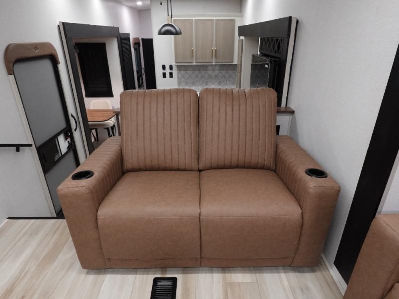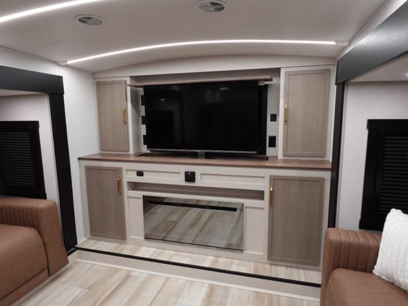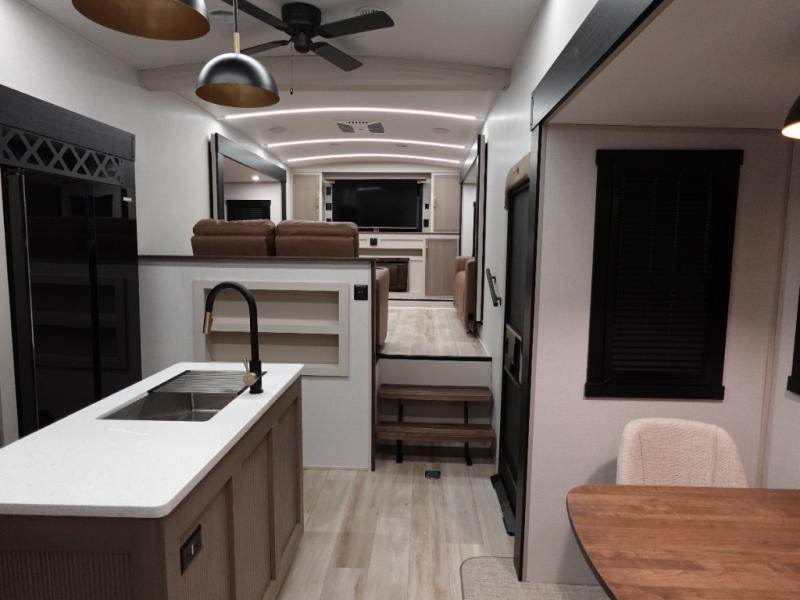 If you are looking for plenty of space, great views, and a place to call home, you have found it with this Wildwood Heritage Glen fifth wheel! The living area is separate from the kitchen and includes dual opposing tri-fold sofas with panoramic windows, theater seating with cupholders, and a 50" LED TV with a fireplace and storage along the front wall. The separate kitchen also offers lots of space with dual slides, a kitchen island, a free-standing table and chairs, and a hutch. You will find the loft stairs beside the full bathroom with a walk-in shower, and the rear private bedroom has a custom king bed slide for endless nights of rest and rejuvenation. There is so much more to enjoy from the loft above the bedroom, the pantry for lots of snack storage as well as the panoramic window in the kitchen and the residential walk-in shower in the full bathroom to mention a few.