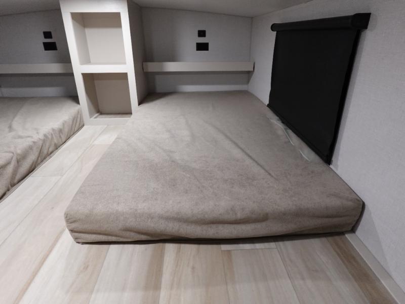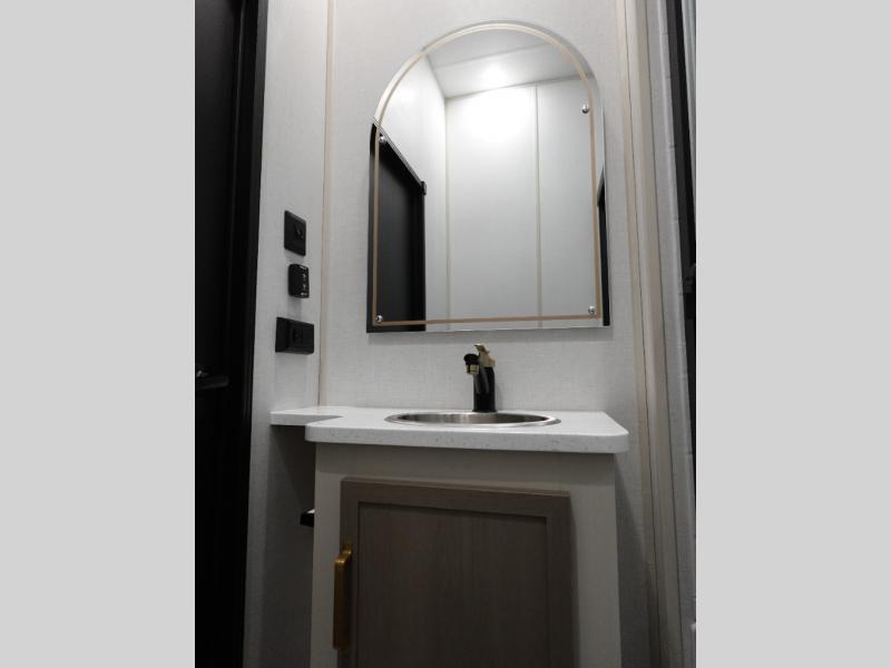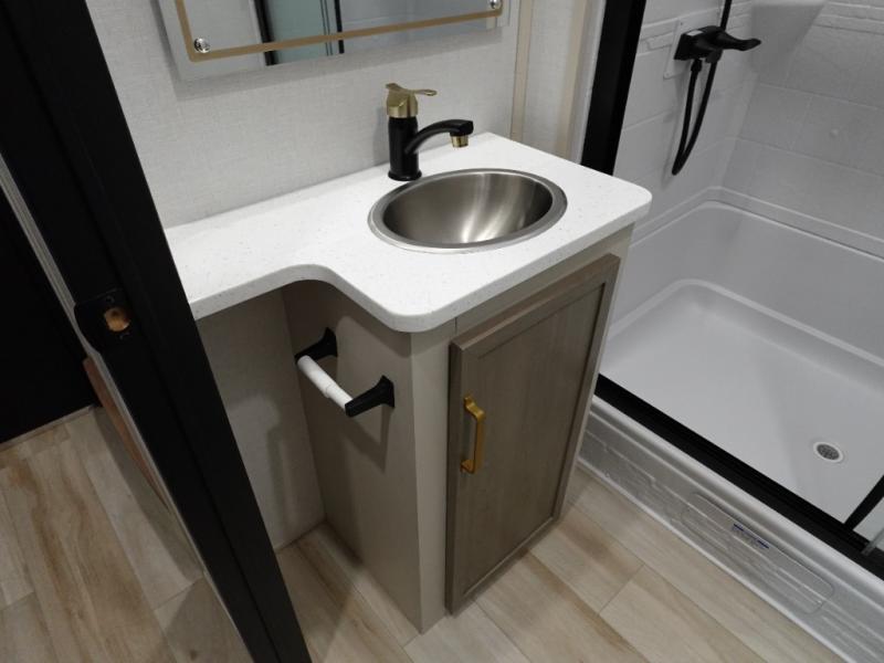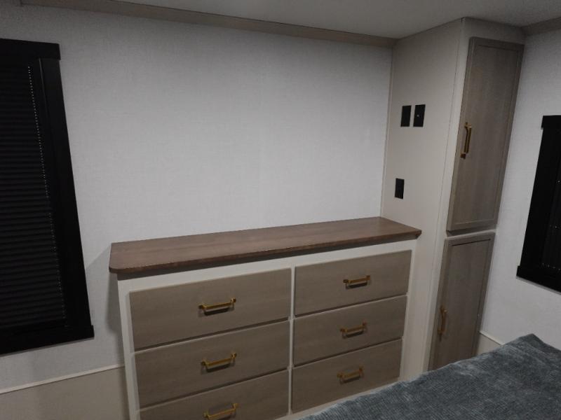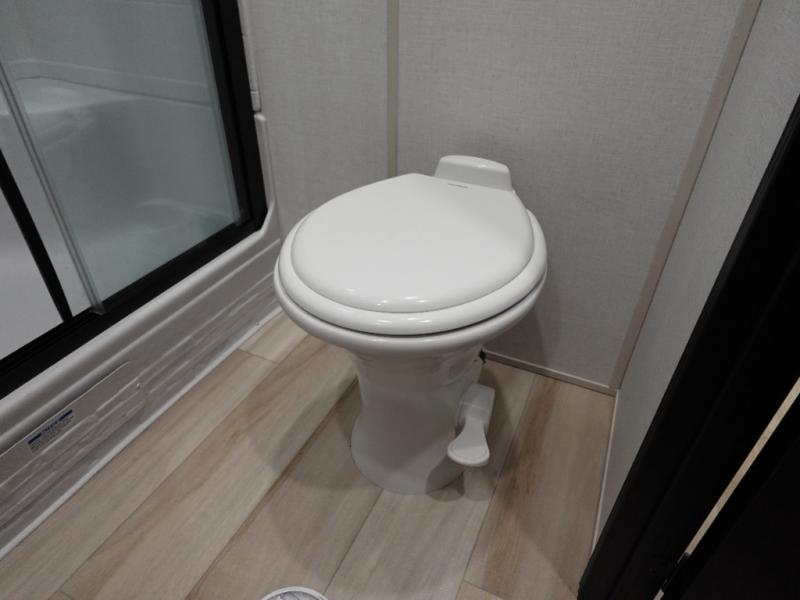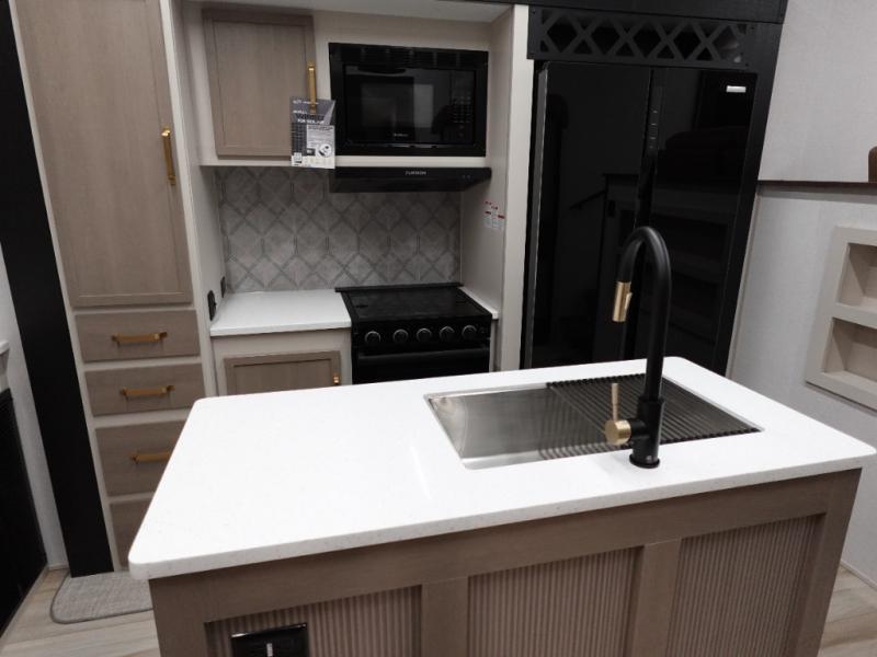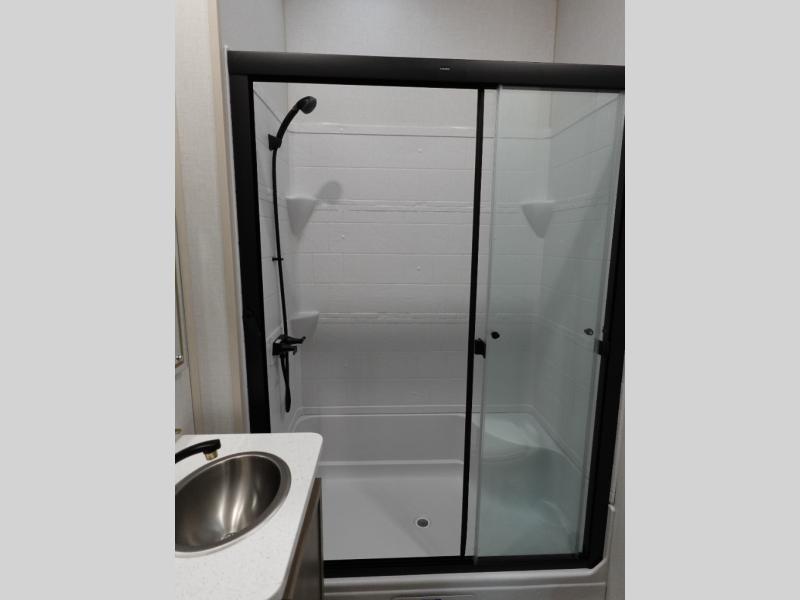 With any Wildwood Heritage Glen fifth wheel by Forest River, the quality construction, attention to detail and design along with a bright and welcoming interior allows you to relax in comfort with conveniences while exploring outdoors. The Summer Wind colored horizontal plank linoleum flooring is unique, beautiful and durable, and there are gold-accented faucets with stainless steel sinks in the bathrooms for added luxury. The Accessibelly underbelly with 12V tank heaters on all holding tanks allows you to camp anytime of year, and the power stabilizer jacks and landing gear will make set-up a breeze. More features that provide convenience include the high-end solid surface countertops, an RV Airflow System that provides at least 25% better airflow, and solar prep for off-grid capabilities.