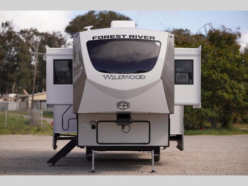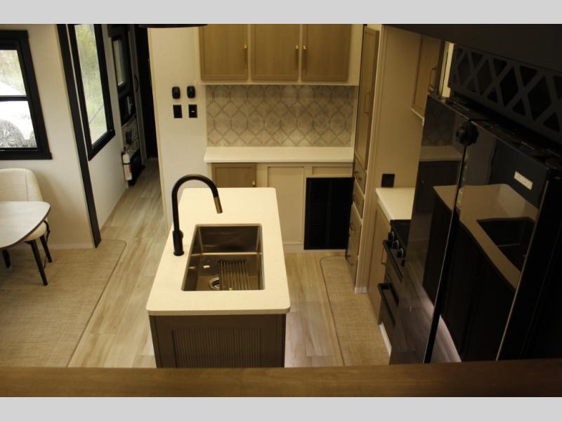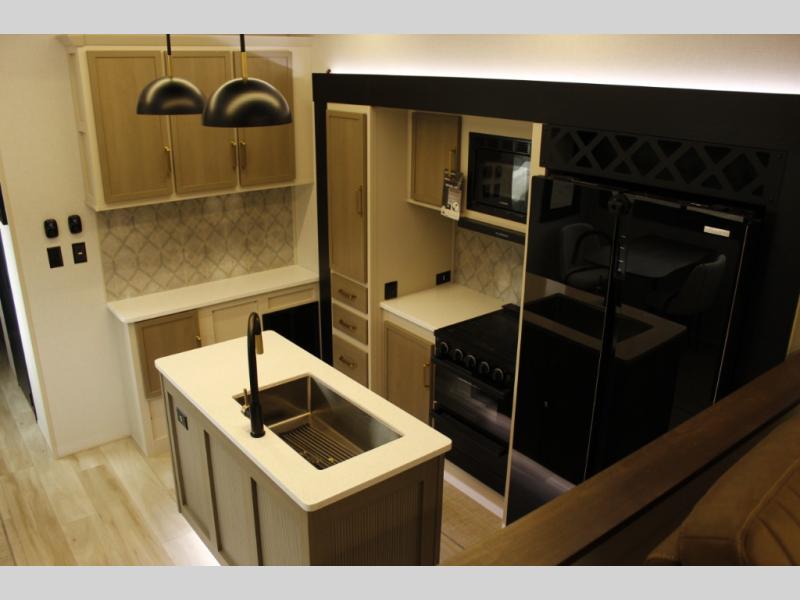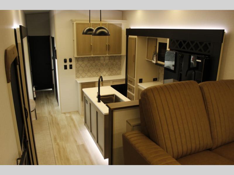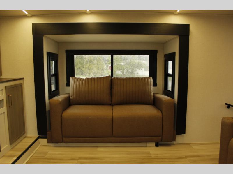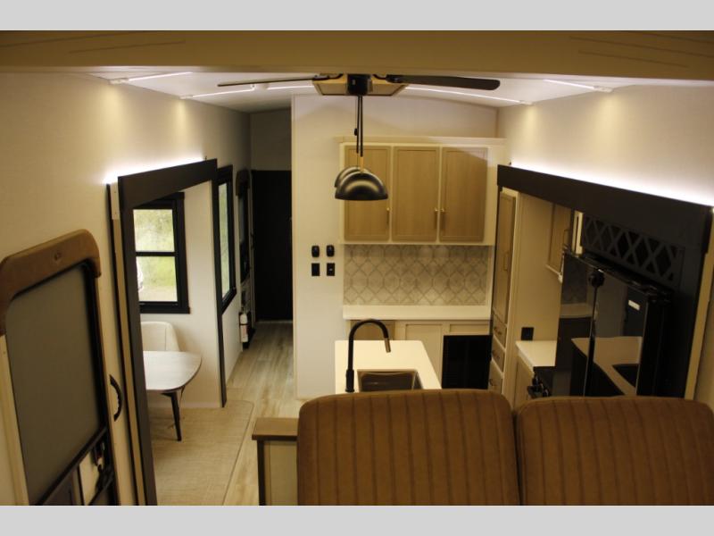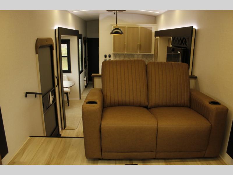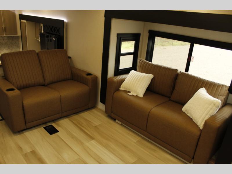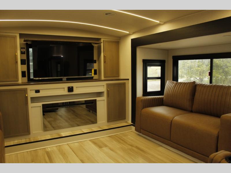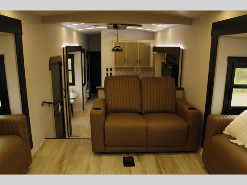 If you are looking for plenty of space, great views, and a place to call home, you have found it with this Wildwood Heritage Glen fifth wheel! The living area is separate from the kitchen and includes dual opposing tri-fold sofas with panoramic windows, theater seating with cupholders, and a 50" LED TV with a fireplace and storage along the front wall. The separate kitchen also offers lots of space with dual slides, a kitchen island, a free-standing table and chairs, and a hutch. You will find the loft stairs beside the full bathroom with a walk-in shower, and the rear private bedroom has a custom king bed slide for endless nights of rest and rejuvenation. There is so much more to enjoy from the loft above the bedroom, the pantry for lots of snack storage as well as the panoramic window in the kitchen and the residential walk-in shower in the full bathroom to mention a few.