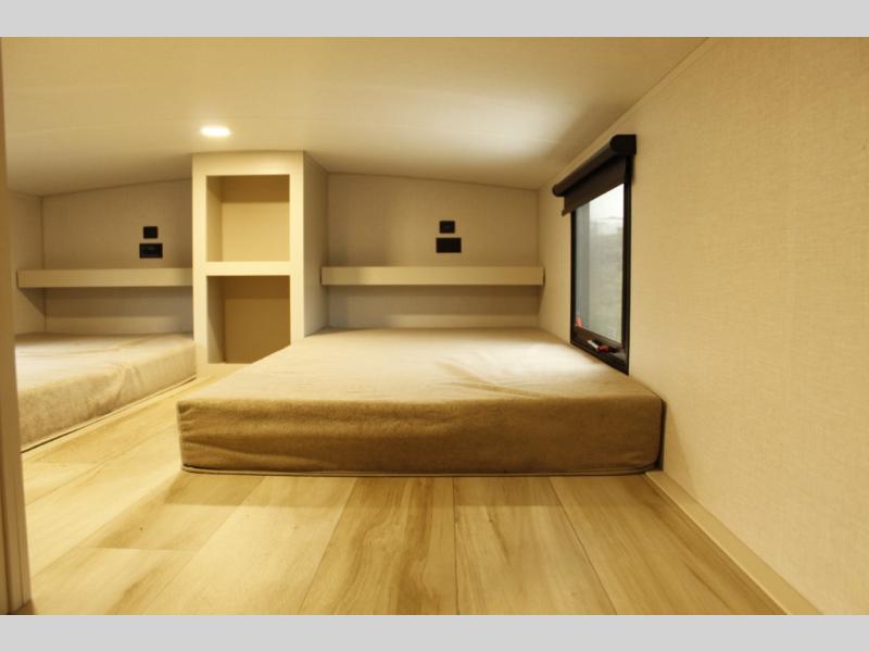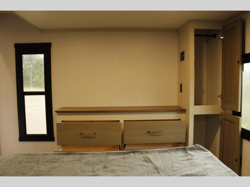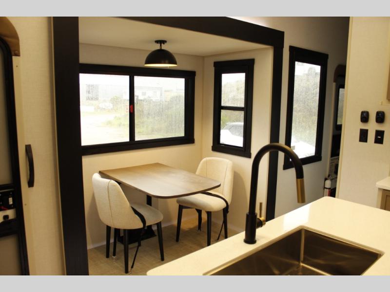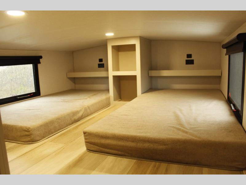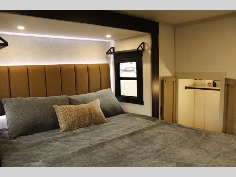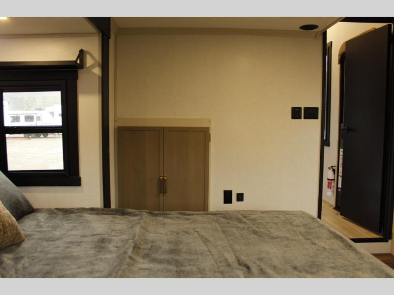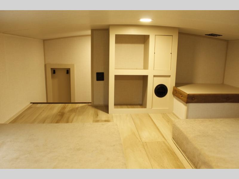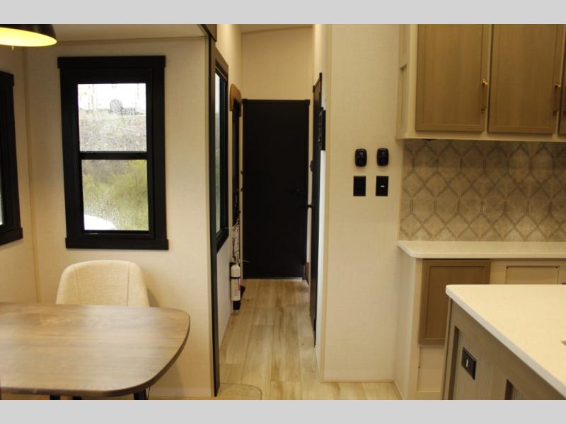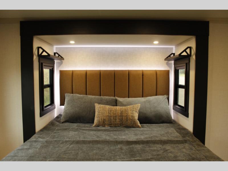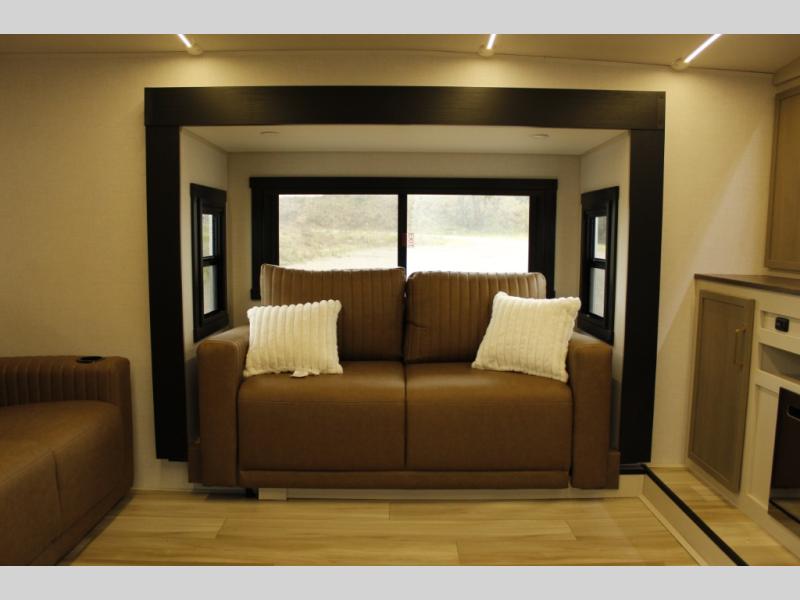 If you are looking for plenty of space, great views, and a place to call home, you have found it with this Wildwood Heritage Glen fifth wheel! The living area is separate from the kitchen and includes dual opposing tri-fold sofas with panoramic windows, theater seating with cupholders, and a 50" LED TV with a fireplace and storage along the front wall. The separate kitchen also offers lots of space with dual slides, a kitchen island, a free-standing table and chairs, and a hutch. You will find the loft stairs beside the full bathroom with a walk-in shower, and the rear private bedroom has a custom king bed slide for endless nights of rest and rejuvenation. There is so much more to enjoy from the loft above the bedroom, the pantry for lots of snack storage as well as the panoramic window in the kitchen and the residential walk-in shower in the full bathroom to mention a few.