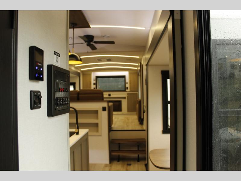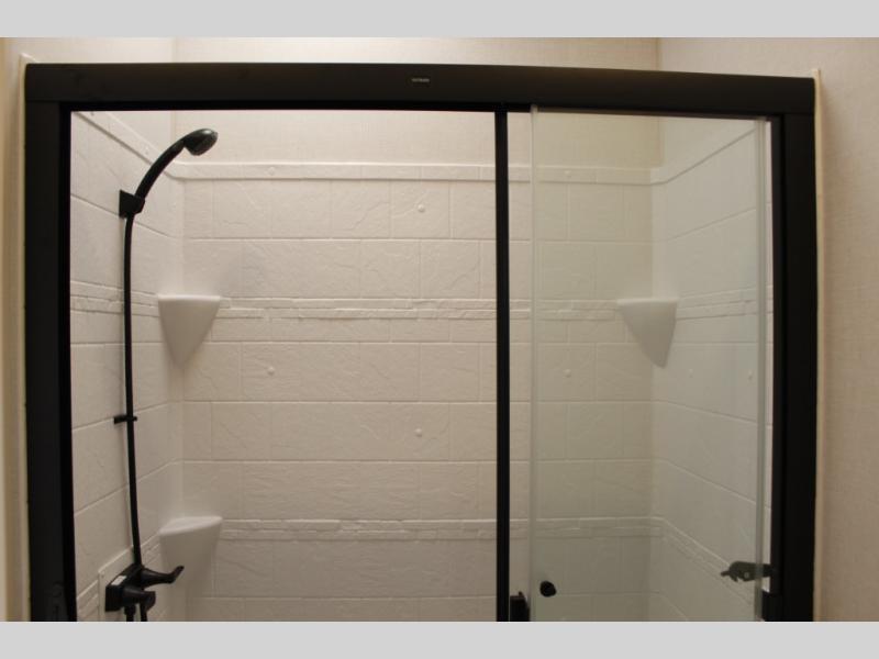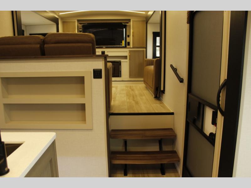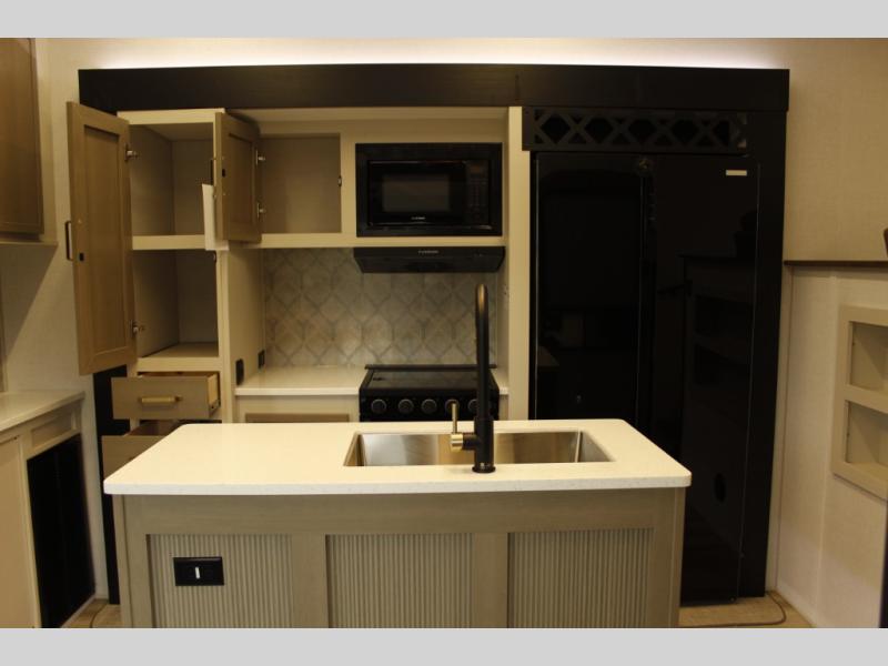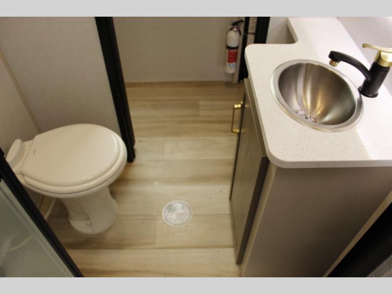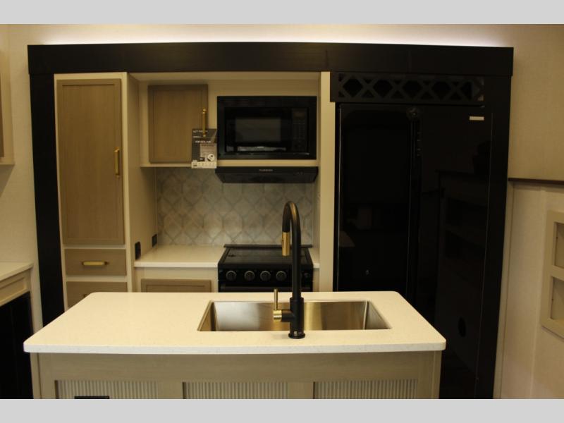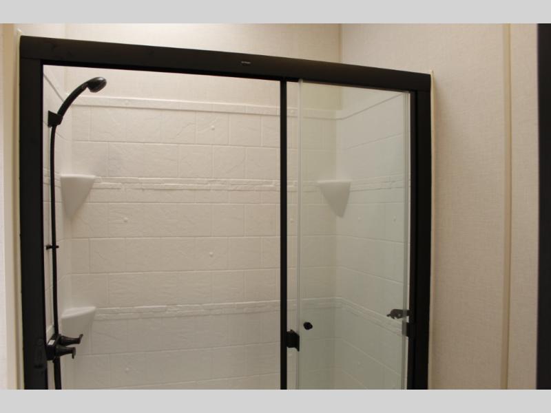 With any Wildwood Heritage Glen fifth wheel by Forest River, the quality construction, attention to detail and design along with a bright and welcoming interior allows you to relax in comfort with conveniences while exploring outdoors. The Summer Wind colored horizontal plank linoleum flooring is unique, beautiful and durable, and there are gold-accented faucets with stainless steel sinks in the bathrooms for added luxury. The Accessibelly underbelly with 12V tank heaters will help protect your unit from the elements, and the power stabilizer jacks and landing gear will make set-up a breeze. More features that provide convenience include the high-end solid surface countertops, an RV Airflow System that provides at least 25% better airflow, and solar prep for off-grid capabilities.