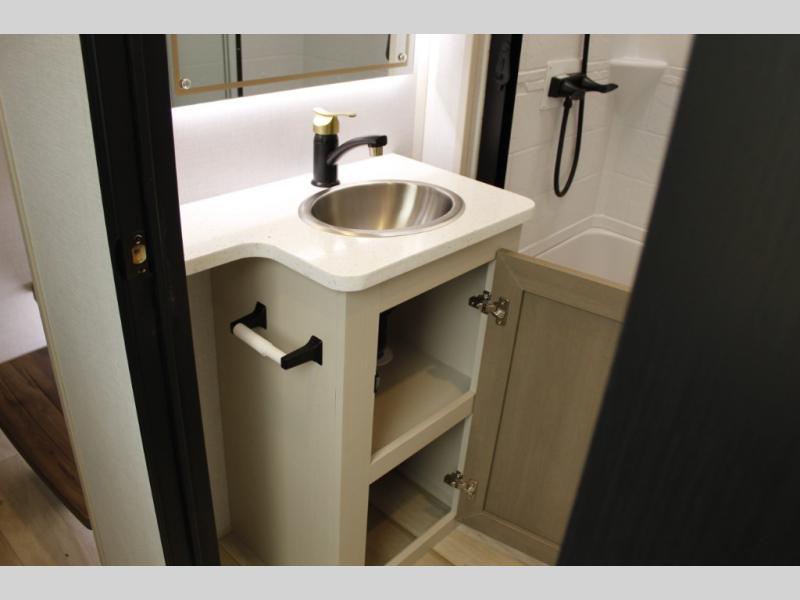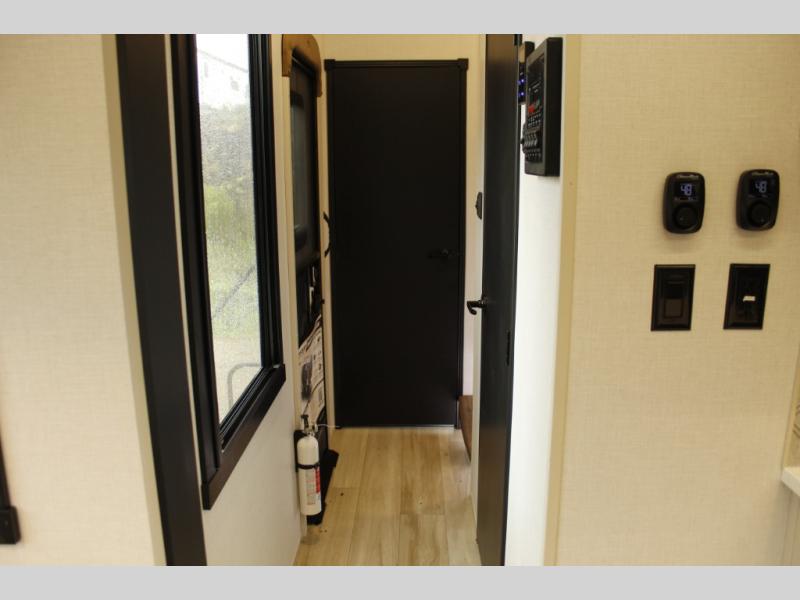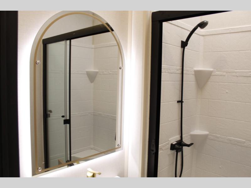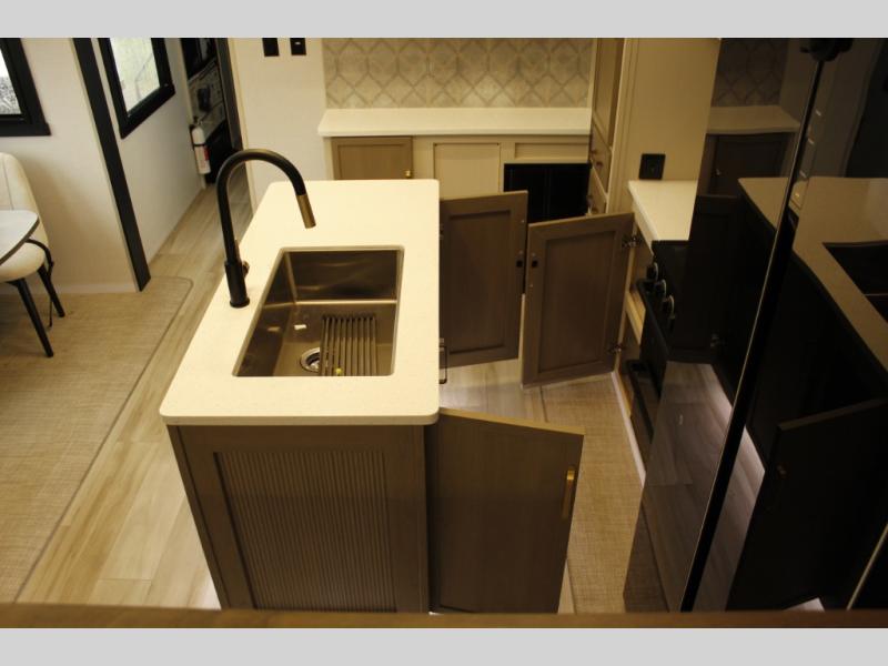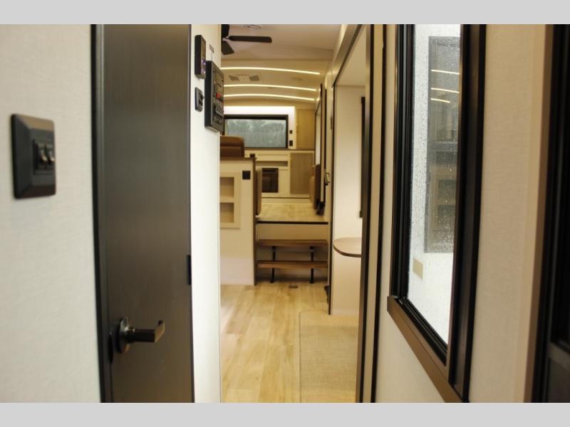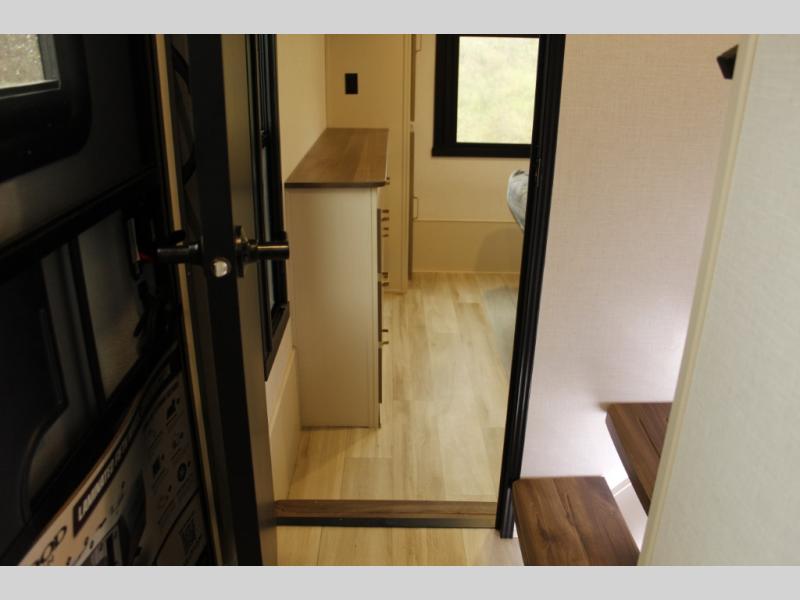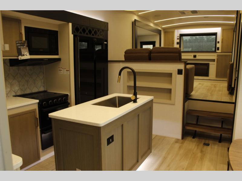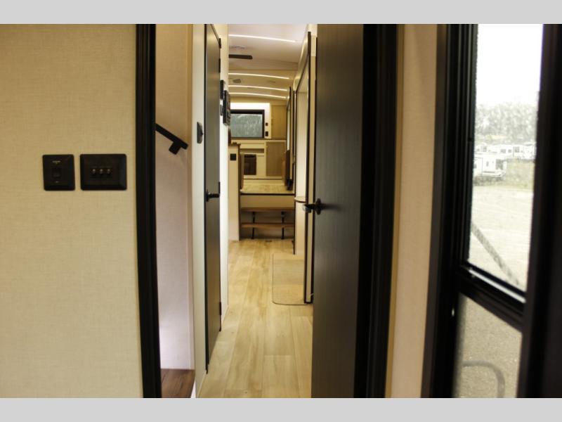 With any Wildwood Heritage Glen fifth wheel by Forest River, the quality construction, attention to detail and design along with a bright and welcoming interior allows you to relax in comfort with conveniences while exploring outdoors. The Summer Wind colored horizontal plank linoleum flooring is unique, beautiful and durable, and there are gold-accented faucets with stainless steel sinks in the bathrooms for added luxury. The Accessibelly underbelly with 12V tank heaters will help protect your unit from the elements, and the power stabilizer jacks and landing gear will make set-up a breeze. More features that provide convenience include the high-end solid surface countertops, an RV Airflow System that provides at least 25% better airflow, and solar prep for off-grid capabilities.