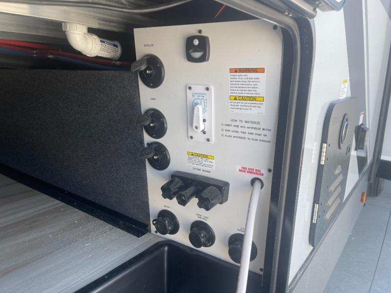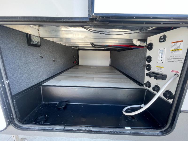 Camping trips and extended stays just got sweeter in this spacious fifth wheel! The rear veranda/porch with a kitchen lets you grill up some burgers as you visit in your camp chairs with friends. Once you head inside, you can make it a movie night since there is a sectional sofa with an ottoman across from the 65" TV and fireplace. A kitchen island with four chairs provides a place to dine together, and there is plenty of food storage between the pantry and 16 cu. ft. 12V refrigerator. You'll love having a custom king bed slide in the front bedroom, along with a dresser and a bench, a wardrobe, plus washer and dryer prep!