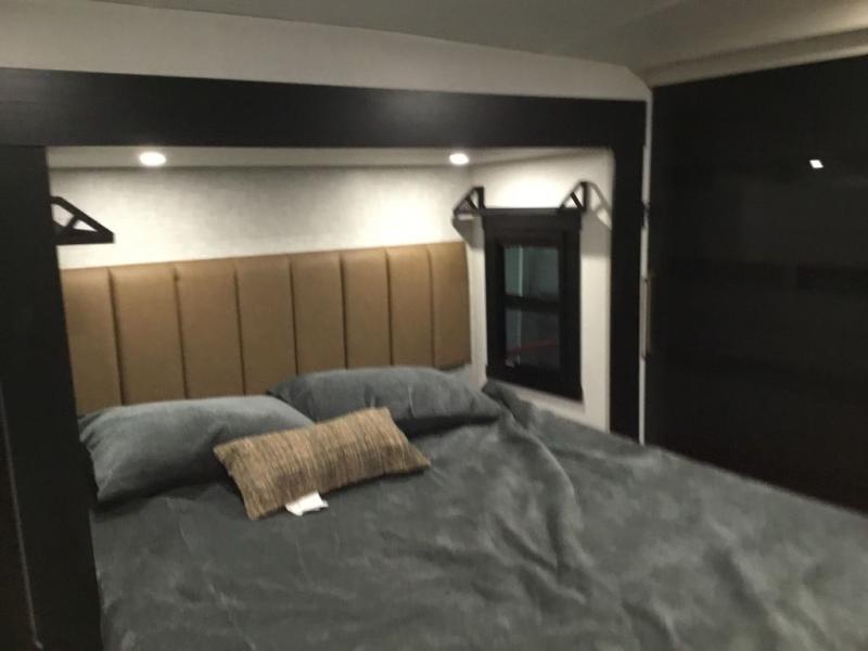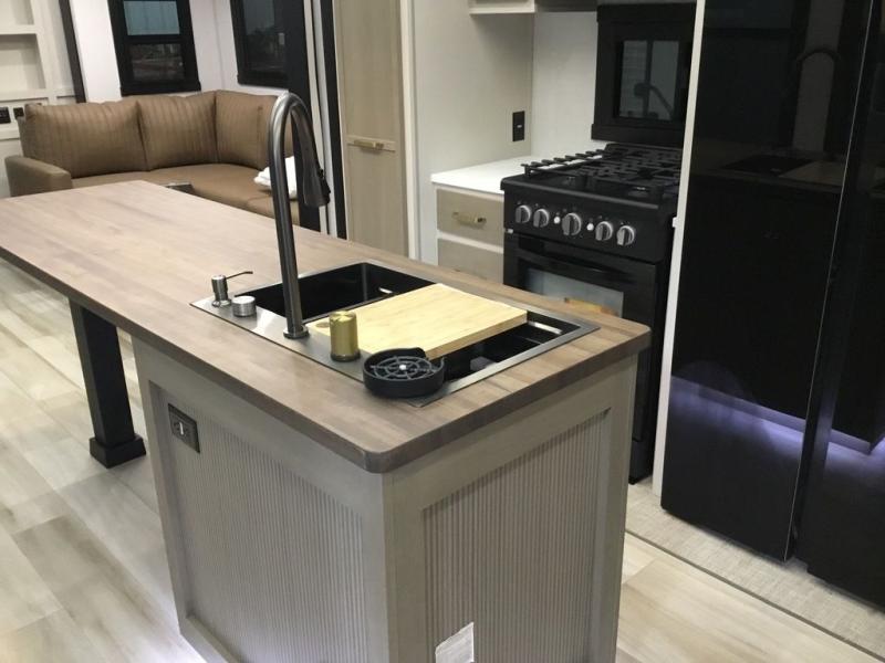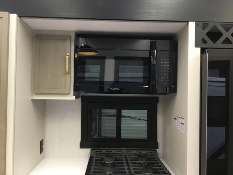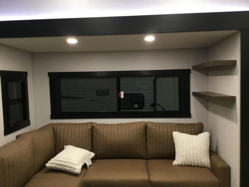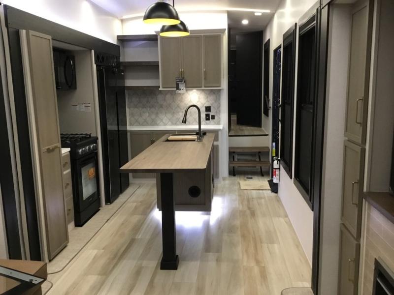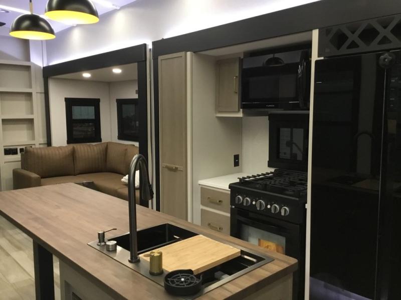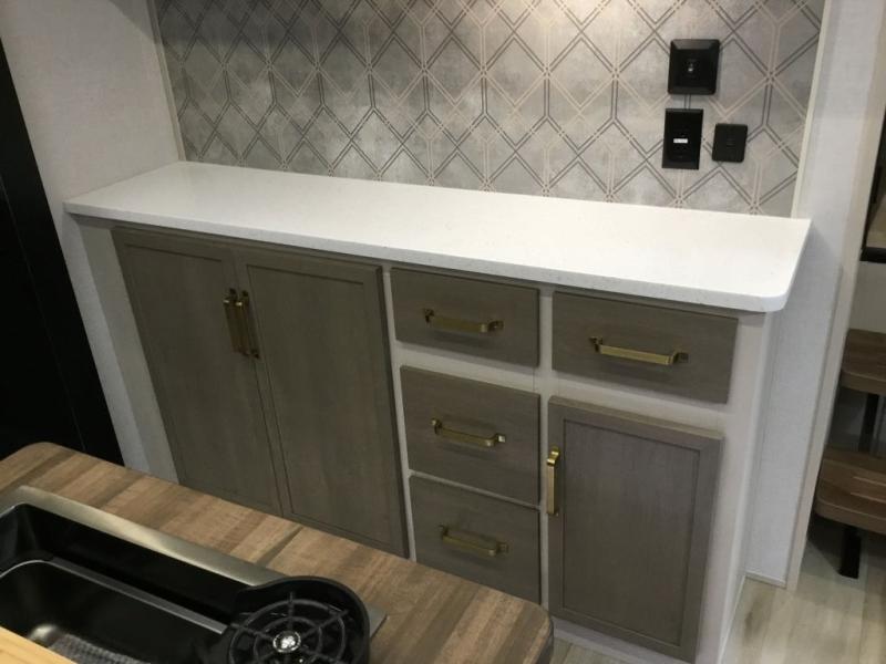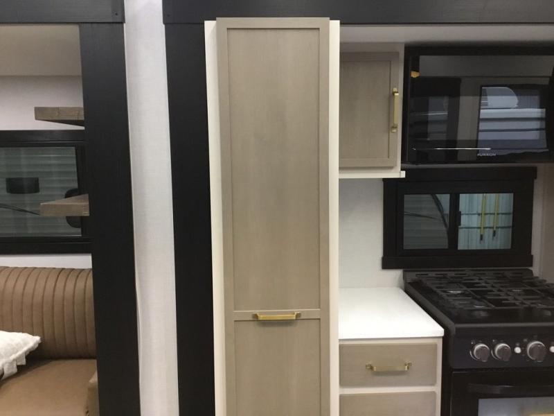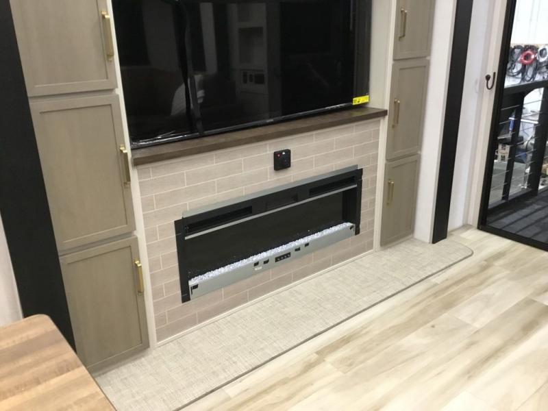 Camping trips and extended stays just got sweeter in this spacious fifth wheel! The rear veranda/porch with a kitchen lets you grill up some burgers as you visit in your camp chairs with friends. Once you head inside, you can make it a movie night since there is a sectional sofa with an ottoman across from the 65" TV and fireplace. A kitchen island with four chairs provides a place to dine together, and there is plenty of food storage between the pantry and 16 cu. ft. 12V refrigerator. You'll love having a custom king bed slide in the front bedroom, along with a dresser and a bench, a wardrobe, plus washer and dryer prep!